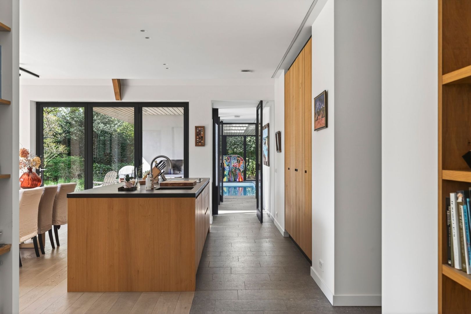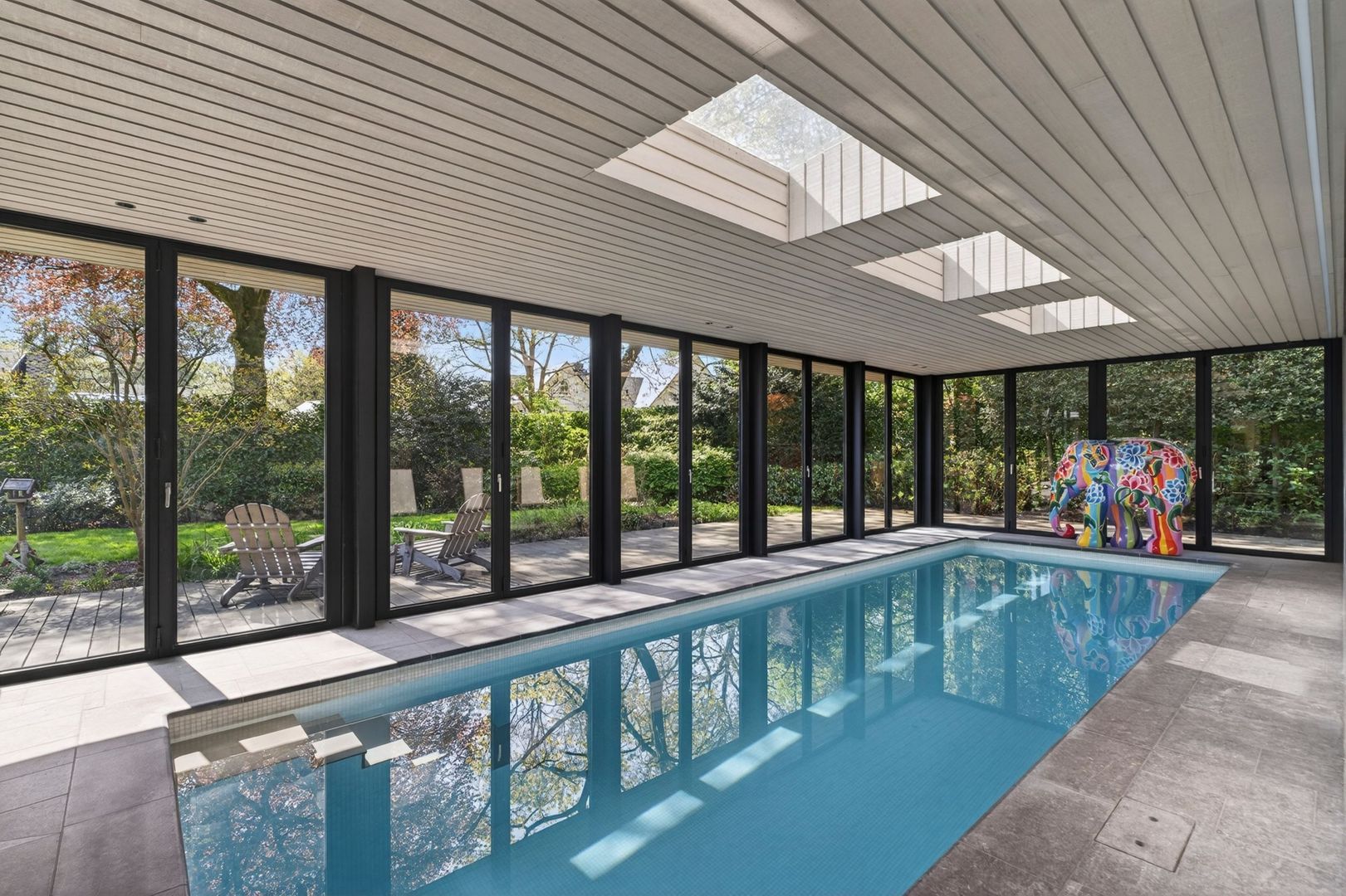 Half-inpandige entree, royale hal met garderobe, toilet v.v. wandcloset en fontein, ruime woonkamer met openslaande deuren naar terras, open woonkeuken v.v. kookeiland, ingebouwde kastenwand, complete inbouwapparatuur en openslaande deuren naar 2 terrassen, grote slaapkamer v.v. 2 vaste kasten en binnendeur naar badkamer v.v. wandcloset, inloopdouche en wastafelmeubel, bijkeuken v.v. (2e) binnentrap naar souterrain. Gang met deur naar verrassende ruimte van bijna 70 m² (11.05 x 6.24 m), aan de tuinzijde volledig te openen d.m.v. 6 stel harmonicadeuren, v.v. verwarmd zwembad van (9,20 x 2,95 m) met sauna en toilet v.v. wandcloset en fontein. Inpandige tuinberging, vanaf buiten bereikbaar. Op het platte dak van deze ruimte zijn vrijwel onzichtbaar de 36 zonnepanelen geplaatst.