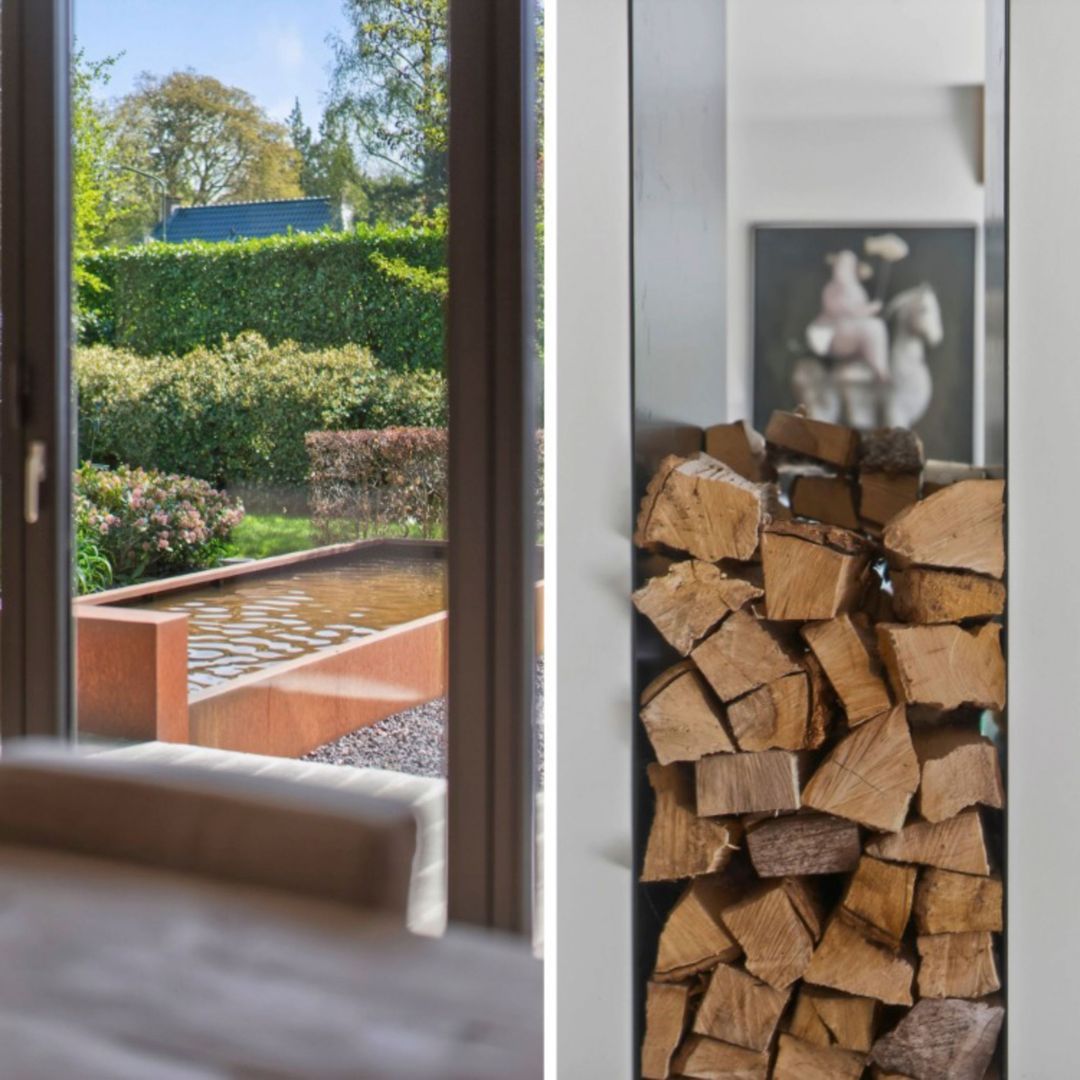 De tuin met automatisch bedienbare inrijpoort en afgesloten tuin is onder architectuur aangelegd waarbij de bloeitijden van de heesters en vaste planten elkaar afwisselen in de verschillende seizoenen. Kroon op de tuin is de in Corten-staal uitgevoerde waterpartij. Met meerdere terrassen en houten vlonders is er op elk uur een heerlijke plek om te genieten van de zon of juist de schaduw.