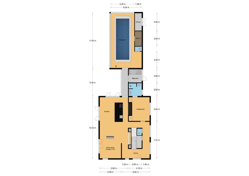 De zwembadruimte omvat bijna 70 m² (11.05 x 6.24 m). Deze ruimte kan ook prima aangepast worden tot extra woonruimte, werkruimte of bijvoorbeeld hobby-/praktijk-/atelier-/fitnessruimte. De architect heeft daar ter inspiratie drie indelingsvarianten voor uitgewerkt.
