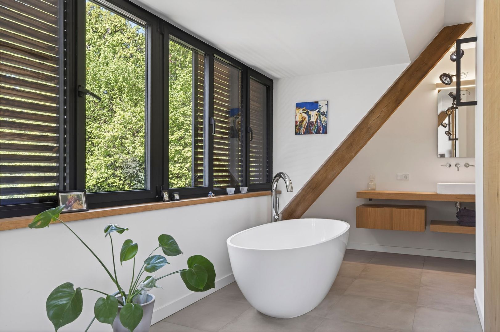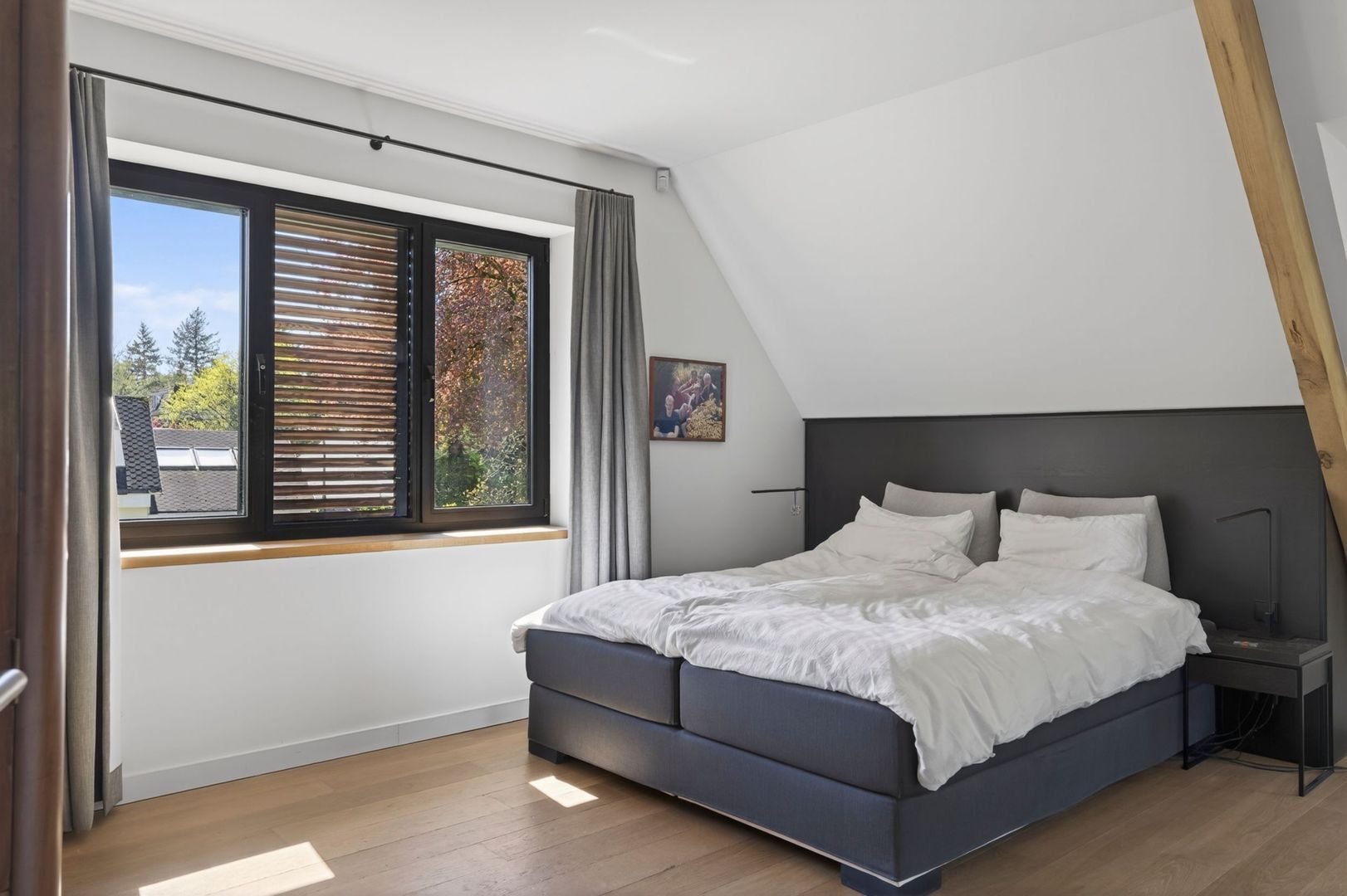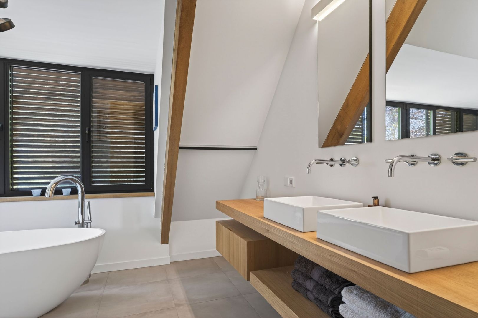 Fraai trappenhuis v.v. met eiken belegde bordestrap naar verdieping met ruime overloop, master bedroom met inloopkast, ligbad en badkamer v.v. dubbel wastafelmeubel, wandcloset en douche met vlakke inloop, 3e slaapkamer met badkamer v.v. wandcloset, wastafelmeubel en inloopdouche, waskamer met ruimte voor wasmachine en droger met wastafel.
