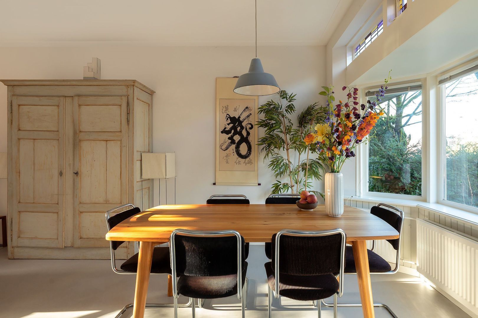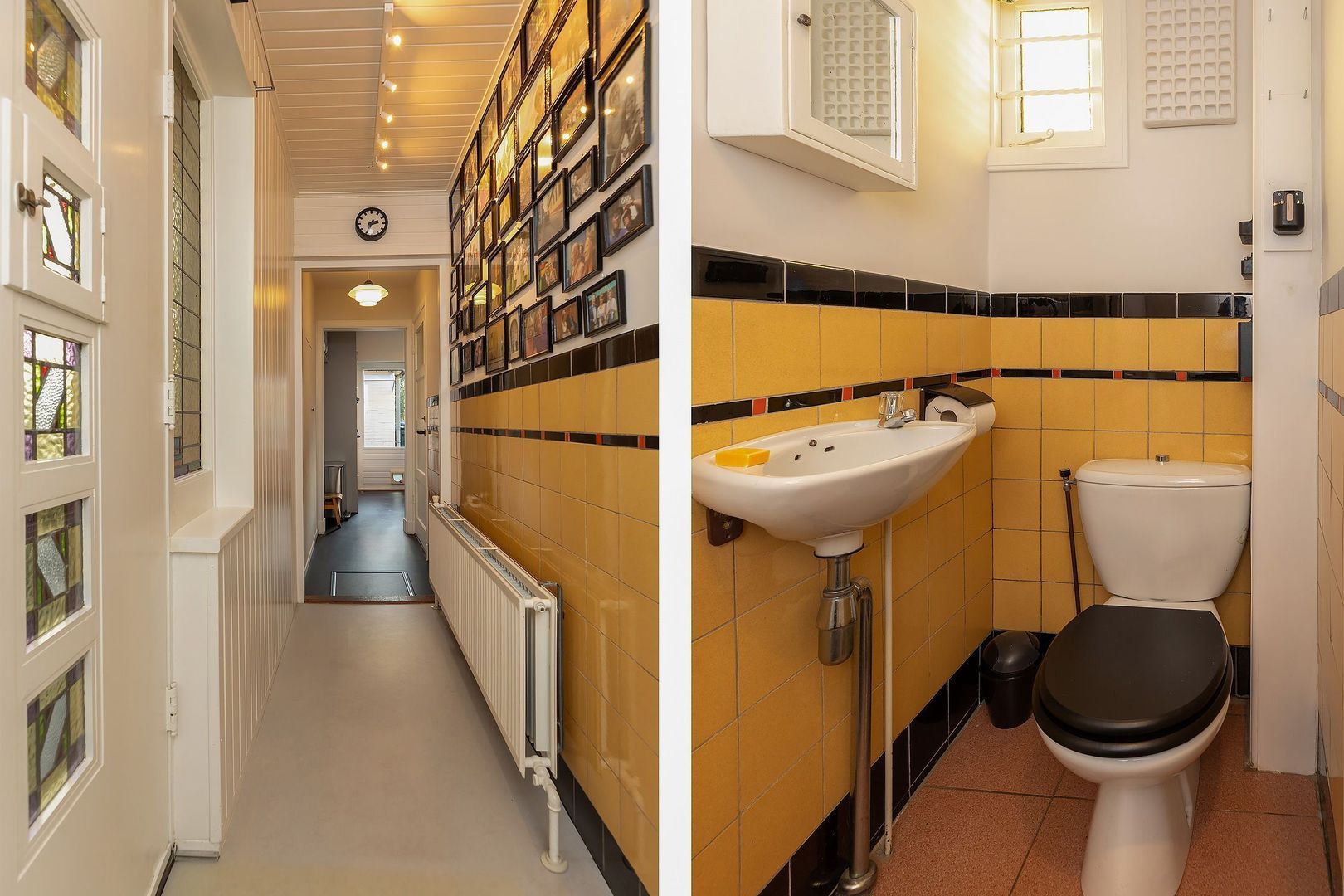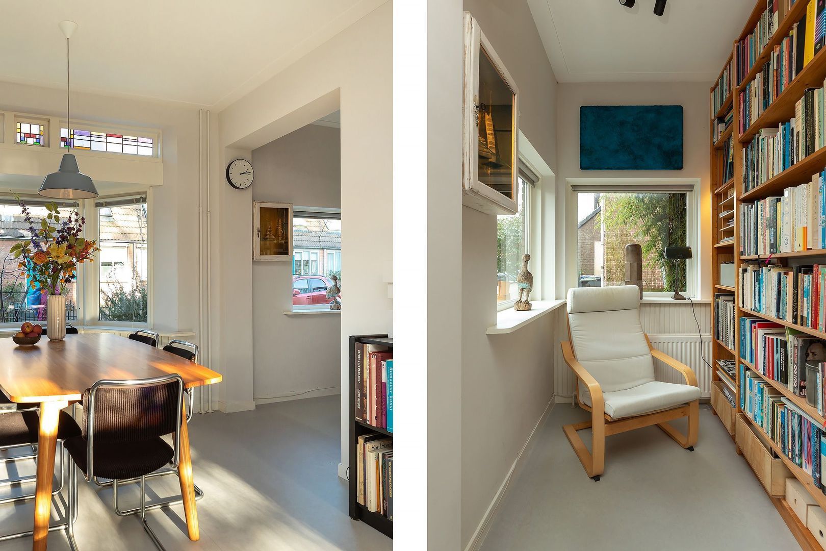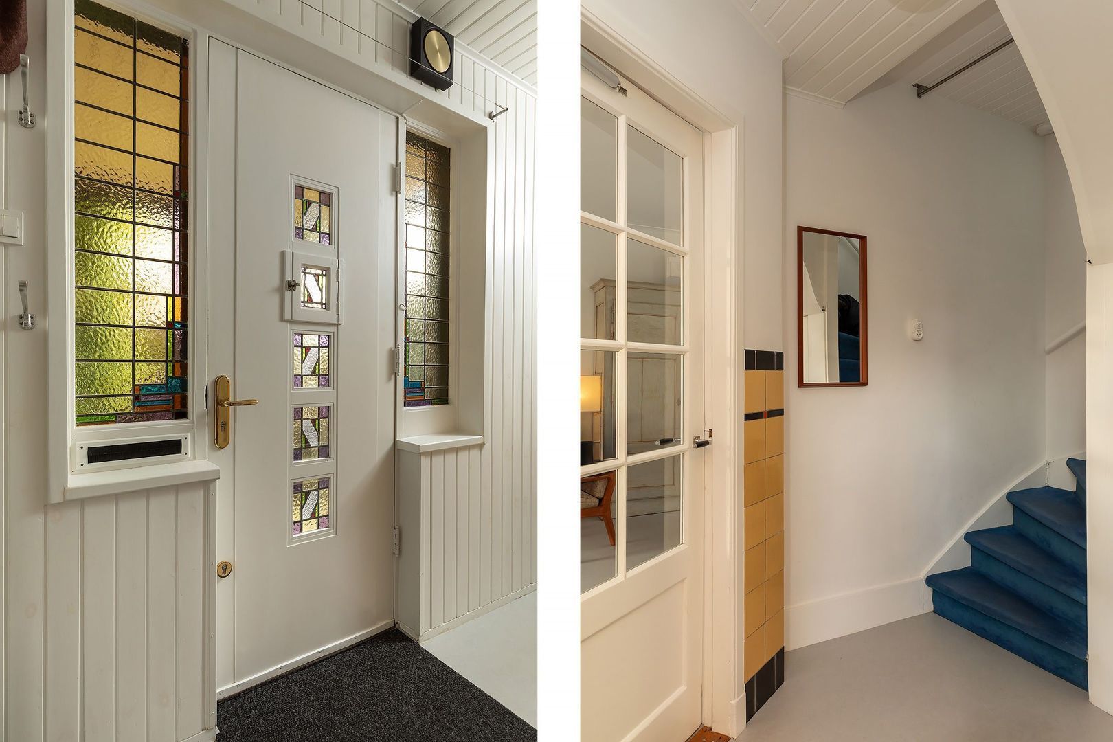 Entree, hal met origineel tegelwerk en glas-in-loodramen. Toilet met fonteintje, eveneens uitgevoerd in originele jaren ’30-stijl. L-vormige, lichte woon-/eetkamer met erker aan de voorzijde en openslaande deuren naar de zonnige achtertuin. De woonkamer is in 2017 voorzien van een nieuw plafond en volledig gestuct. Aansluitend bevindt zich de moderne Bruynzeel keuken (2021), uitgerust met Quooker, koelkast, kookplaat, afzuigkap, vaatwasser, oven en magnetron.