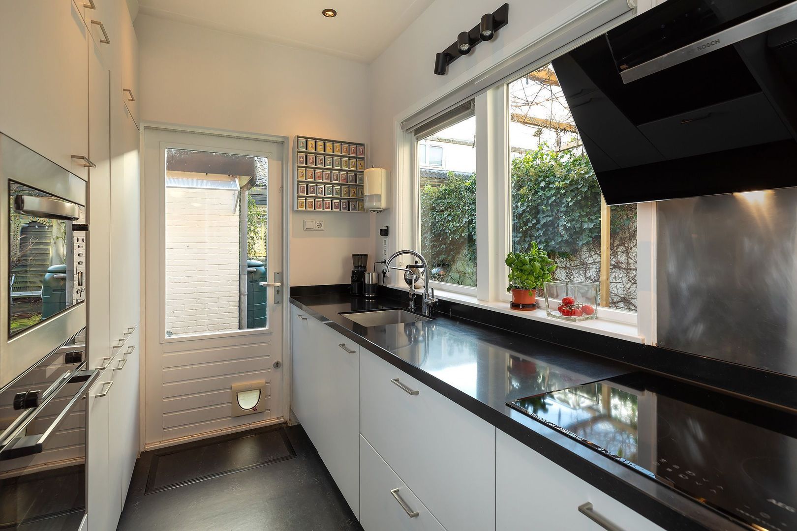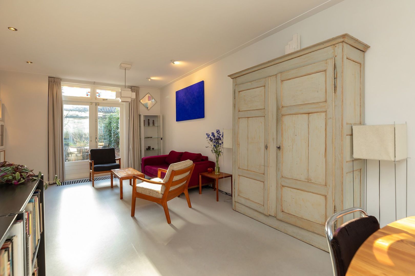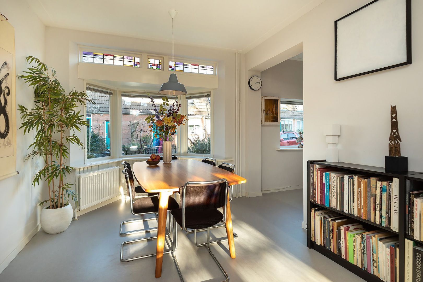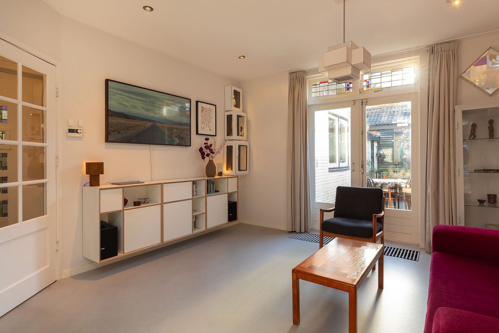 Entree, hal met origineel tegelwerk en glas-in-loodramen. Toilet met fonteintje, eveneens uitgevoerd in originele jaren ’30-stijl. L-vormige, lichte woon-/eetkamer met erker aan de voorzijde en openslaande deuren naar de zonnige achtertuin. De woonkamer is in 2017 voorzien van een nieuw plafond en volledig gestuct. Aansluitend bevindt zich de moderne Bruynzeel keuken (2021), uitgerust met Quooker, koelkast, kookplaat, afzuigkap, vaatwasser, oven en magnetron.