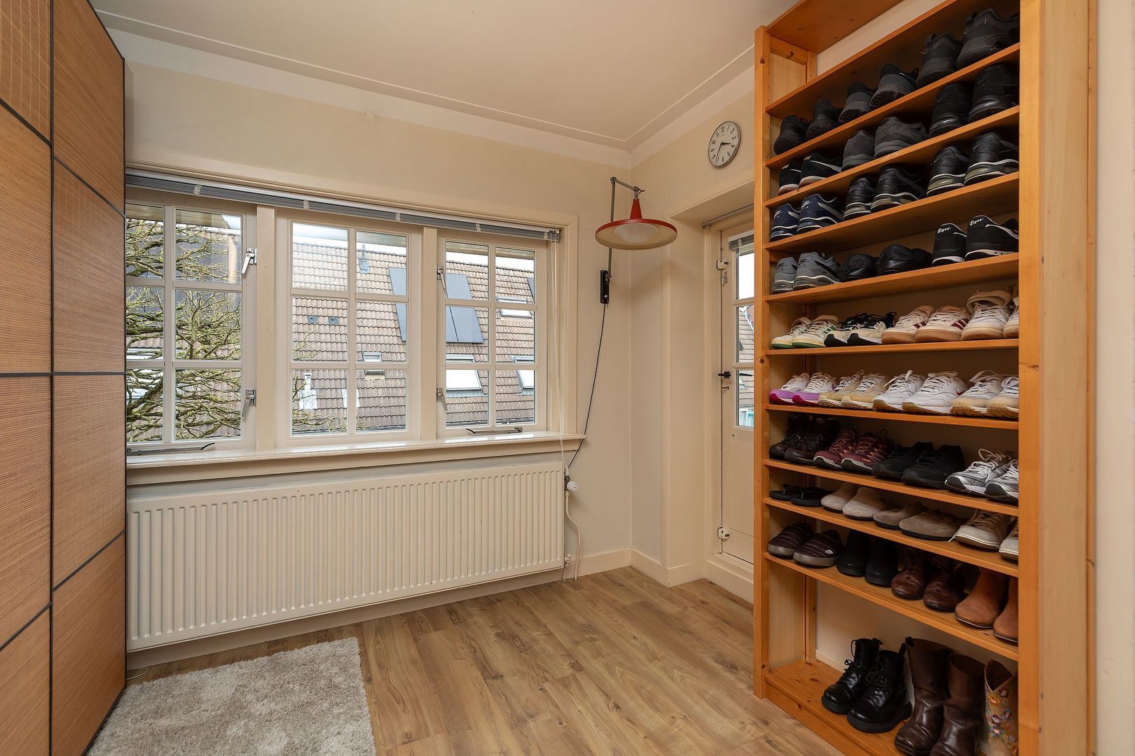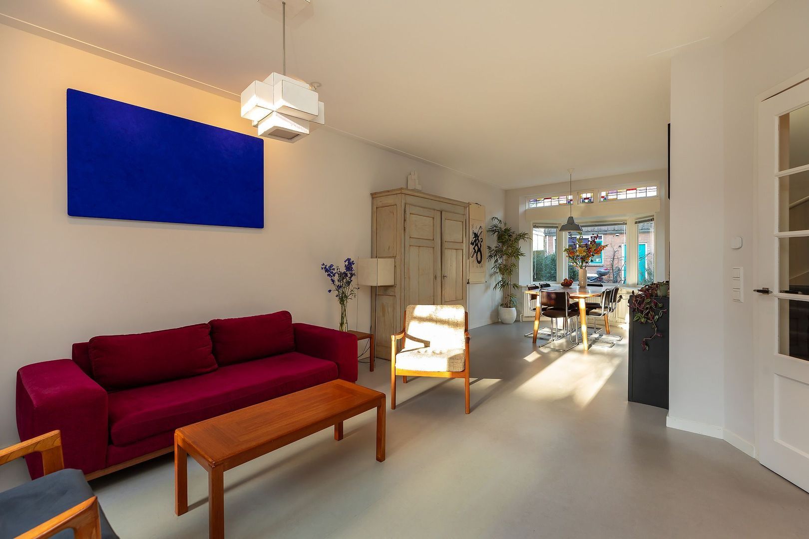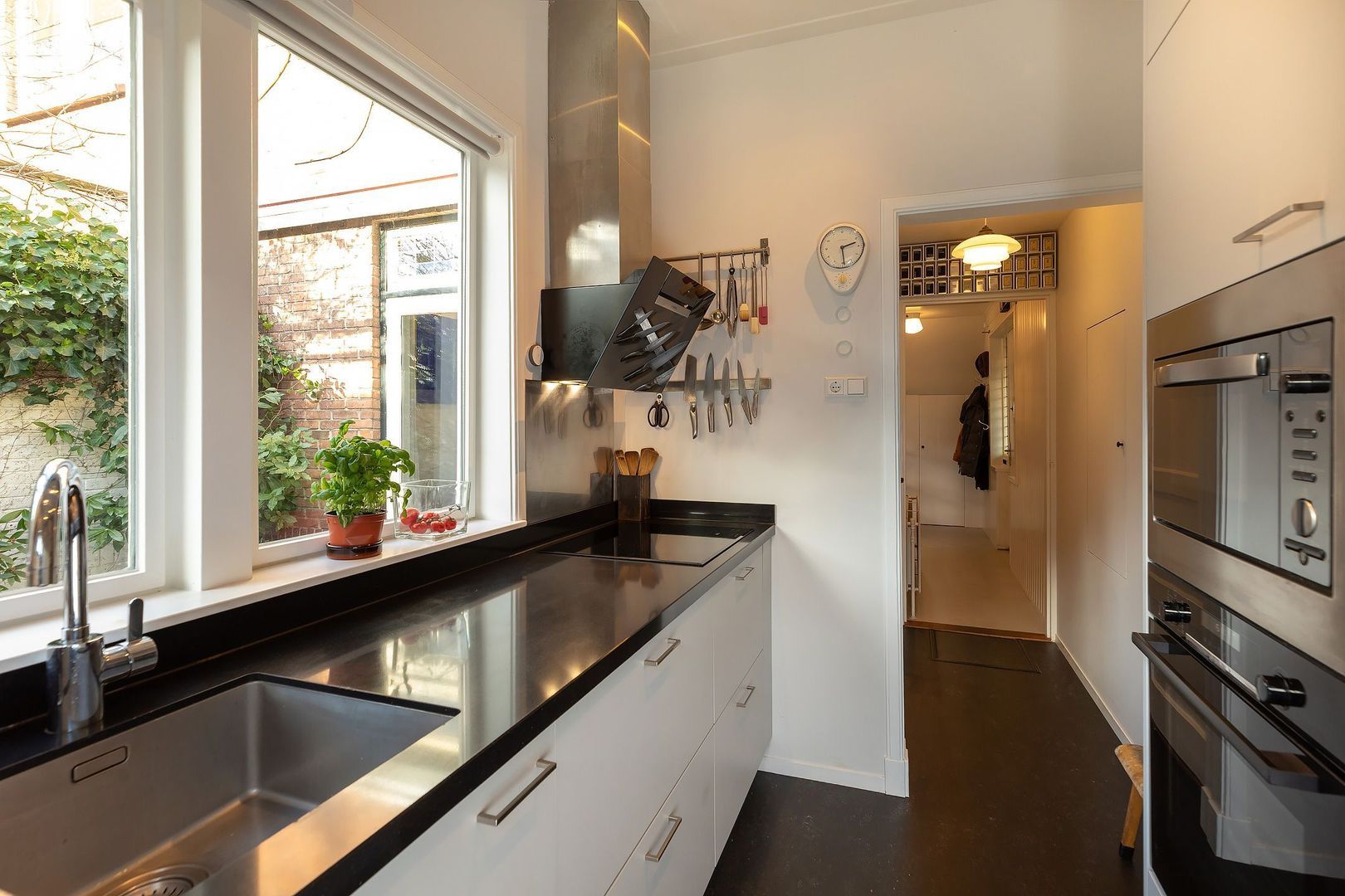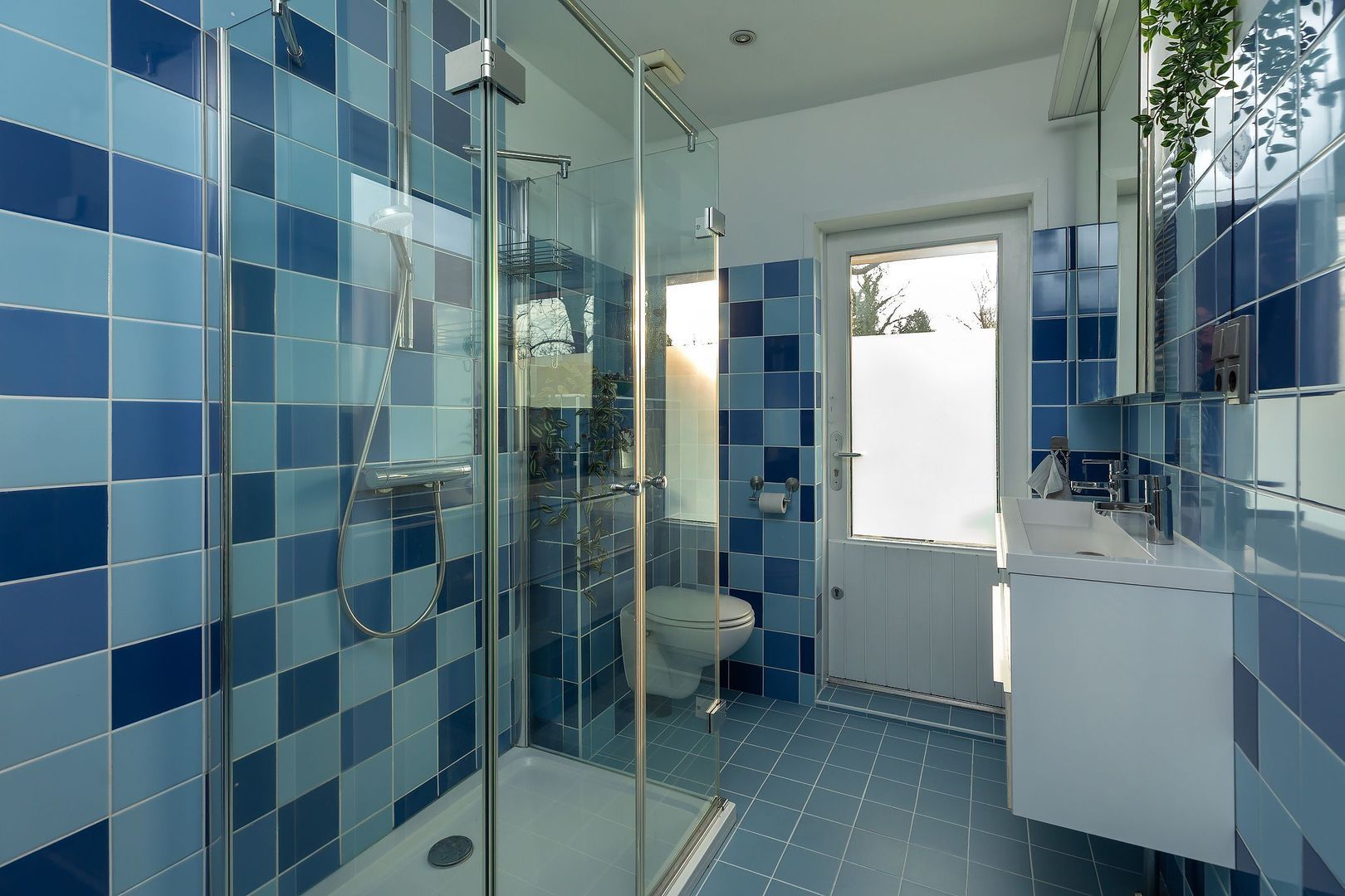 Entree, hal met origineel tegelwerk en glas-in-loodramen. Toilet met fonteintje, eveneens uitgevoerd in originele jaren ’30-stijl. L-vormige, lichte woon-/eetkamer met erker aan de voorzijde en openslaande deuren naar de zonnige achtertuin. De woonkamer is in 2017 voorzien van een nieuw plafond en volledig gestuct. Aansluitend bevindt zich de moderne Bruynzeel keuken (2021), uitgerust met Quooker, koelkast, kookplaat, afzuigkap, vaatwasser, oven en magnetron.