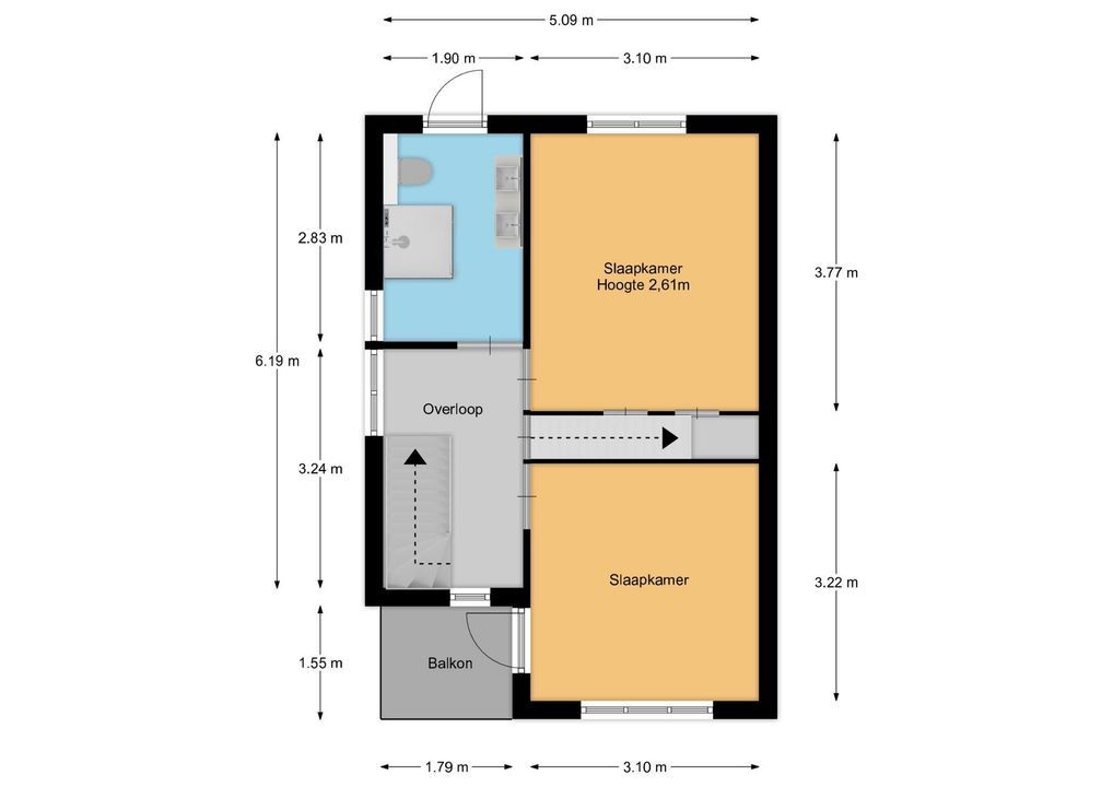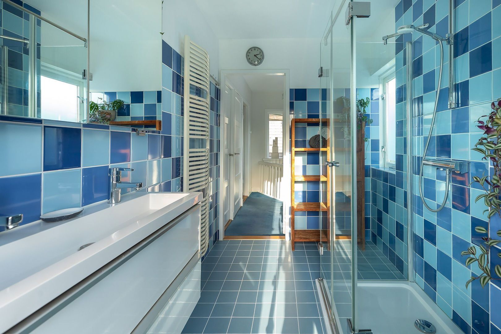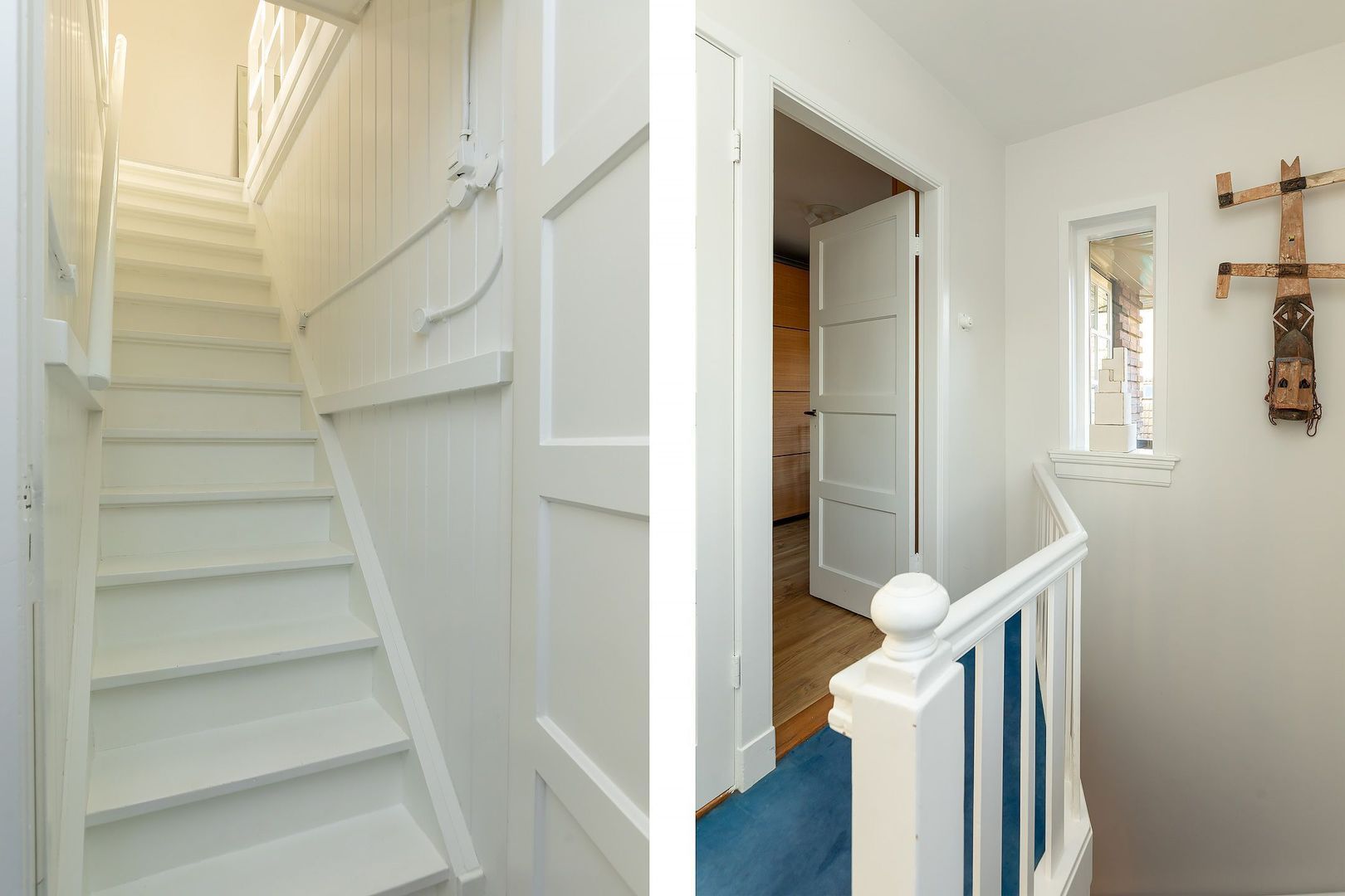 Ruime overloop, slaapkamer aan de voorzijde met balkon en slaapkamer aan de achterzijde met vaste kastenwand. Badkamer voorzien van douchecabine, 2e toilet, wastafel en designradiator, met een deur naar het dakterras boven de keuken. Vaste trap naar de zolderverdieping.