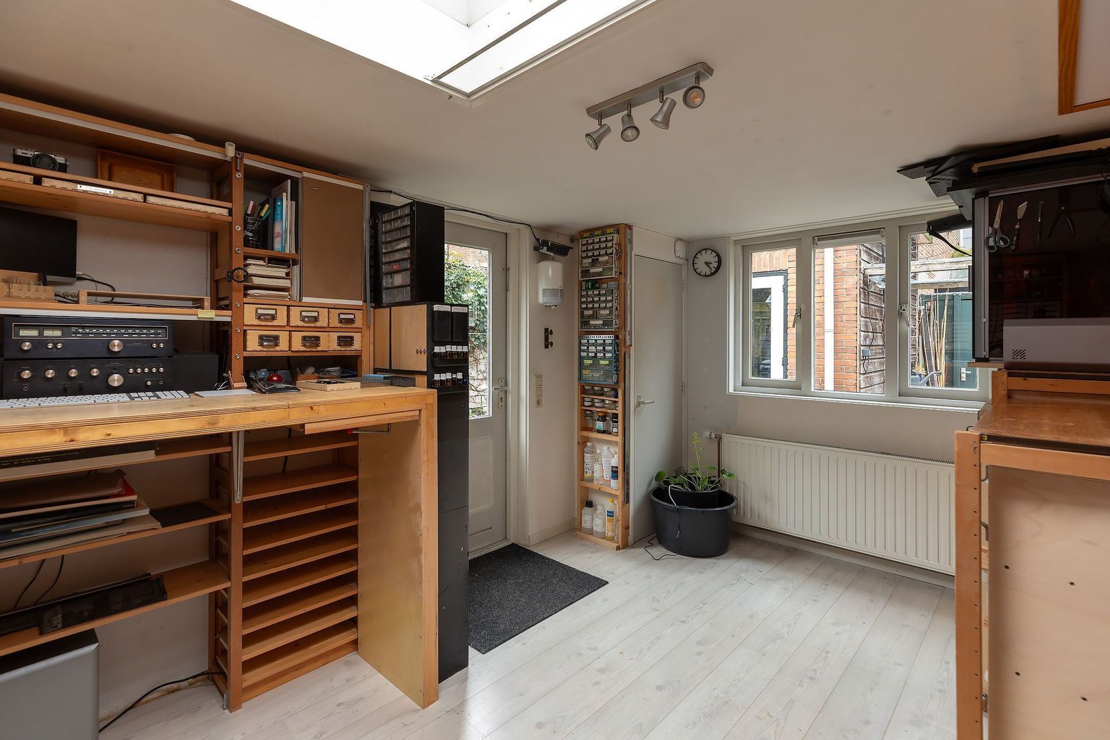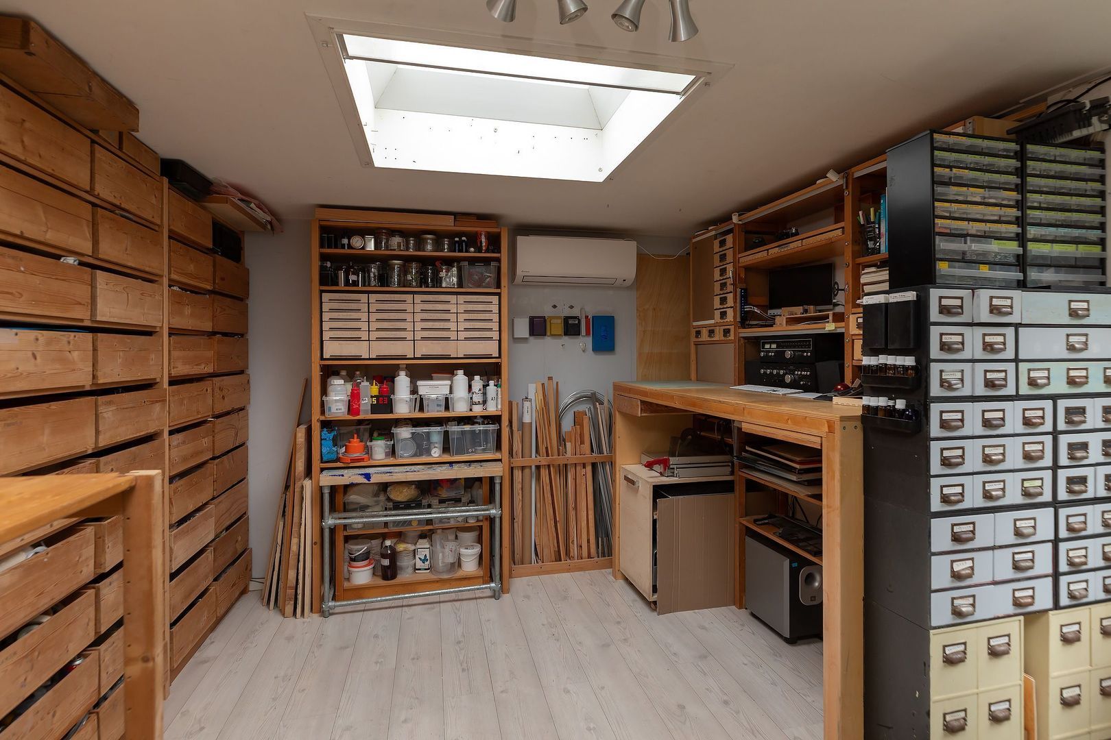 De voormalige garage is in 2012 verbouwd tot een volledig geïsoleerde en verwarmde werkruimte, geschikt voor gebruik als kantoor of atelier. De ruimte is voorzien van airconditioning voor zowel verwarmen als koelen en biedt daardoor het hele jaar door een aangenaam werkklimaat. Achter de werkruimte is een separate berging aanwezig met wasmachineaansluiting.