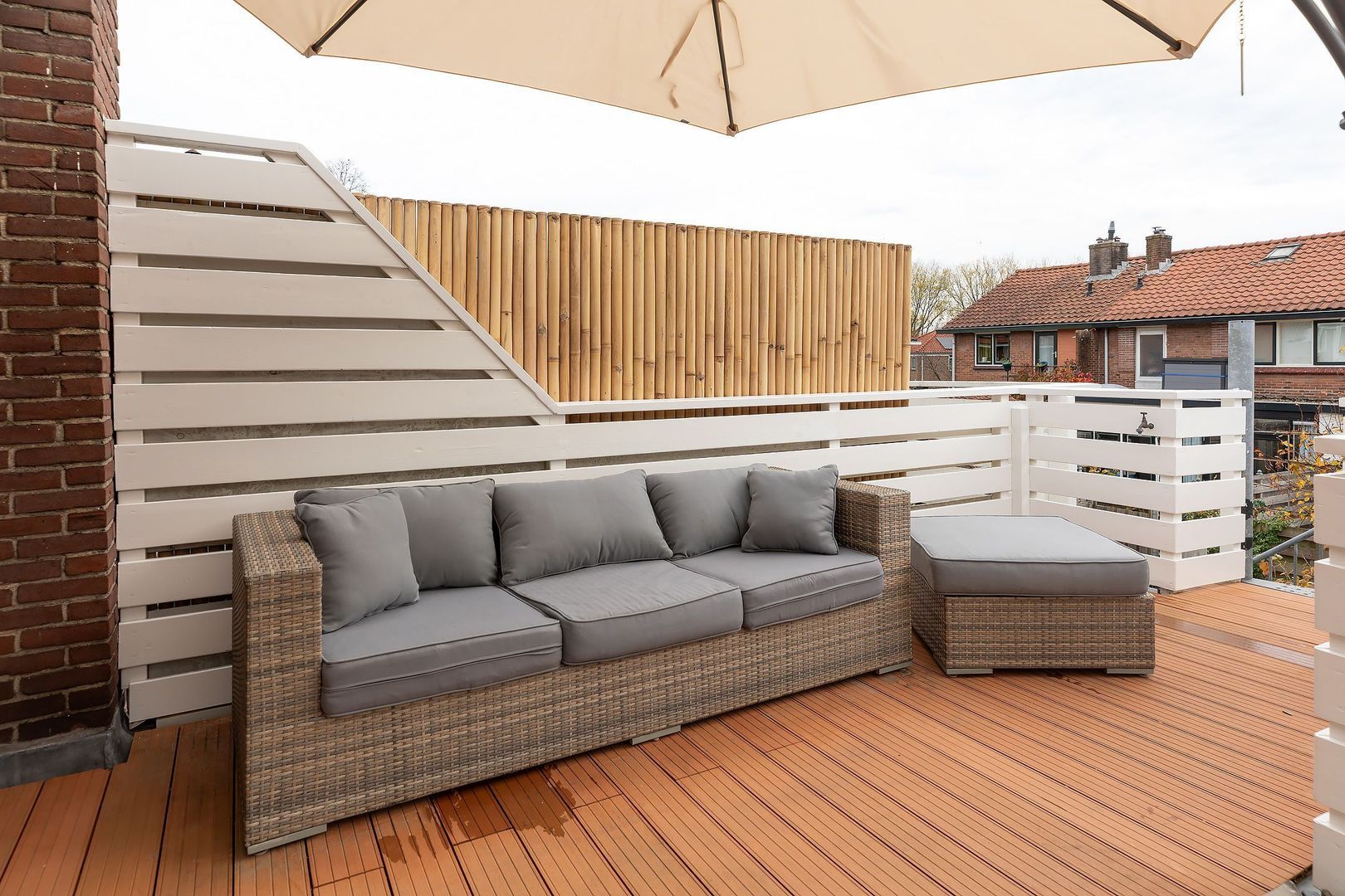 Overloop, royale slaapkamer aan de voorzijde met dakkapel en vaste kast, 2e slaapkamer met vaste kast, verzorgde badkamer (2011) met douche, 2e toilet, wastafelmeubel en design-radiator. Toegang tot een zonnig dakterras (zuiden) met tevens trapopgang vanuit de tuin. Badkamer en slaapkamer zijn voorzien van inbraak- en zonwerende elektrische rolluiken.