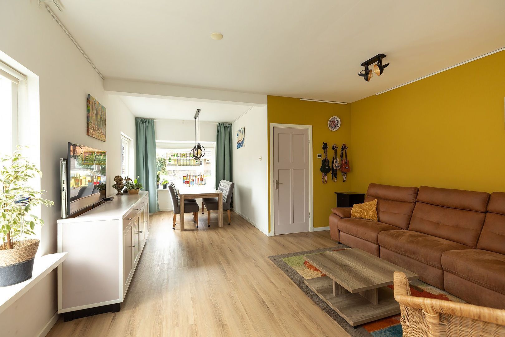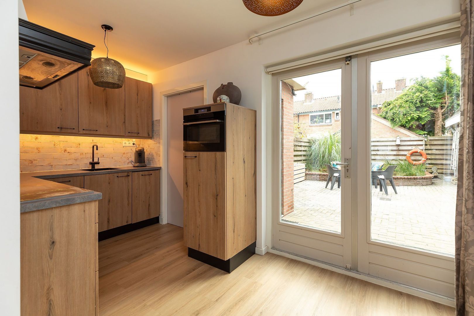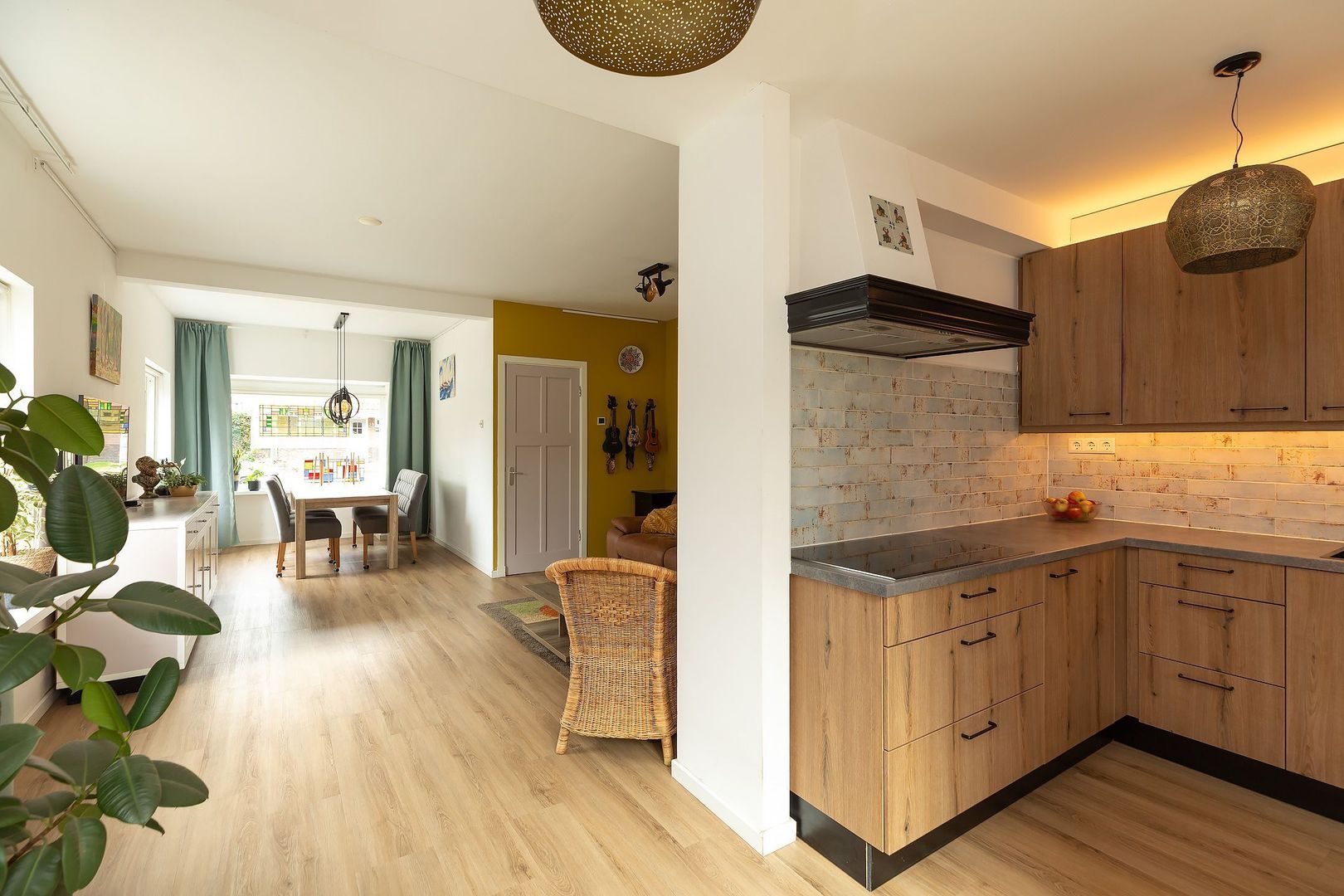 Entree, hal met trapopgang, trap naar de kelder en toilet. Lichte woonkamer met openslaande deuren naar de tuin. Moderne open keuken (2023) met diverse inbouwapparatuur en bijkeuken.