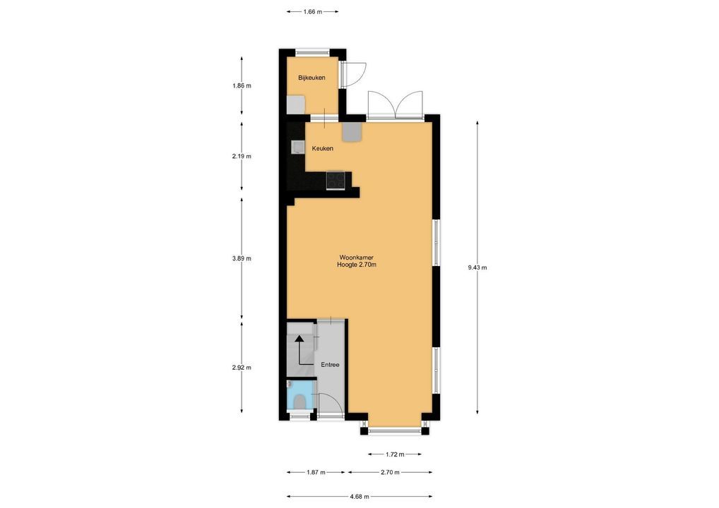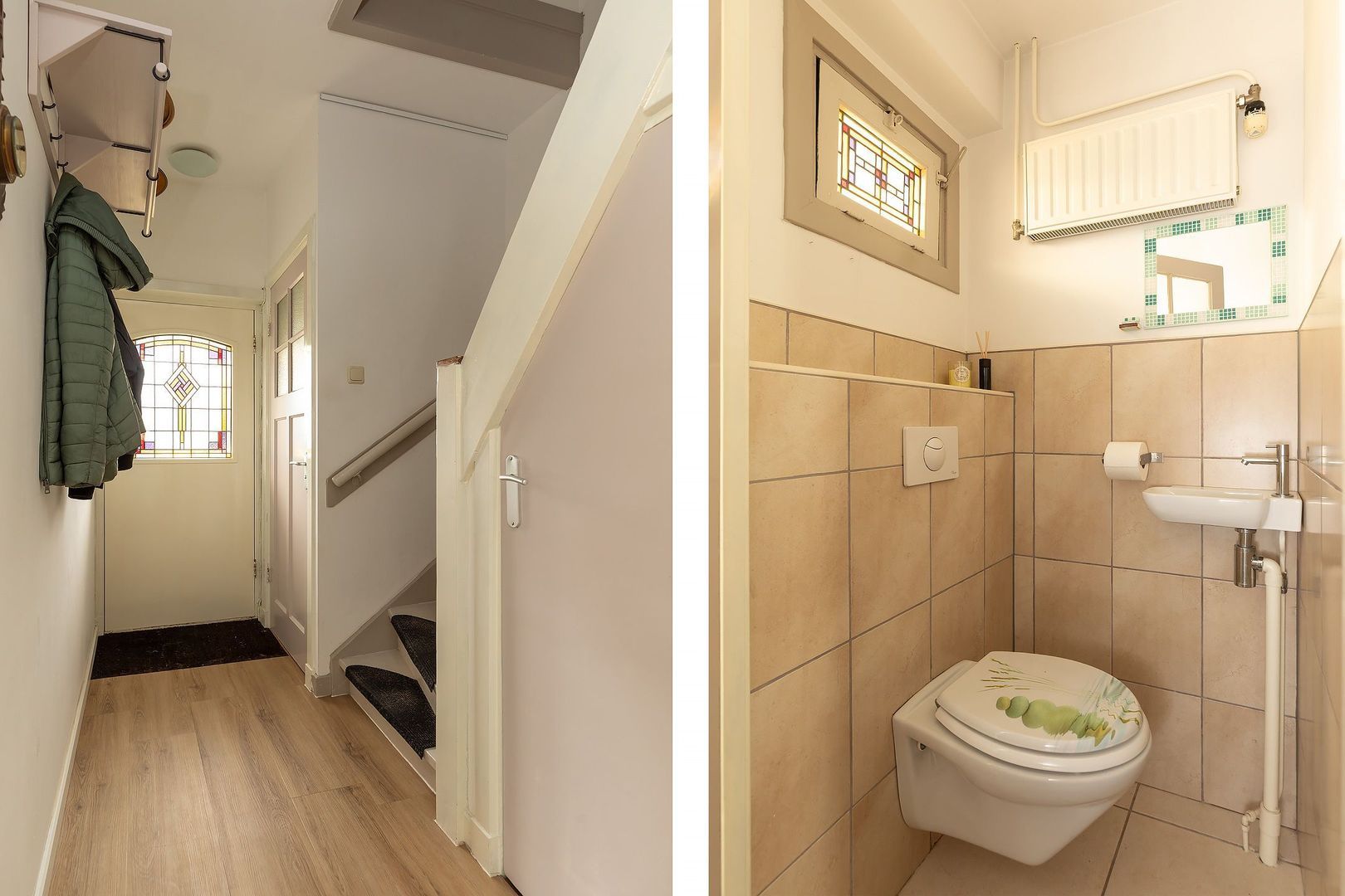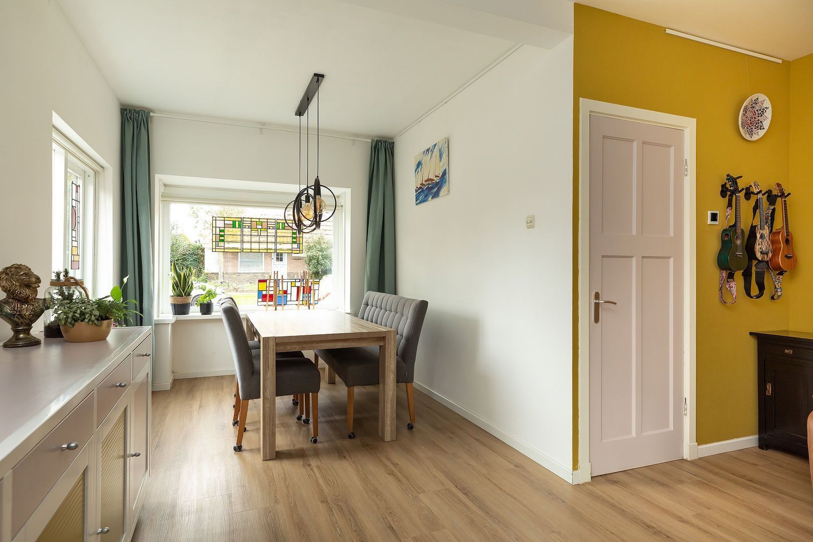 Entree, hal met trapopgang, trap naar de kelder en toilet. Lichte woonkamer met openslaande deuren naar de tuin. Moderne open keuken (2023) met diverse inbouwapparatuur en bijkeuken.