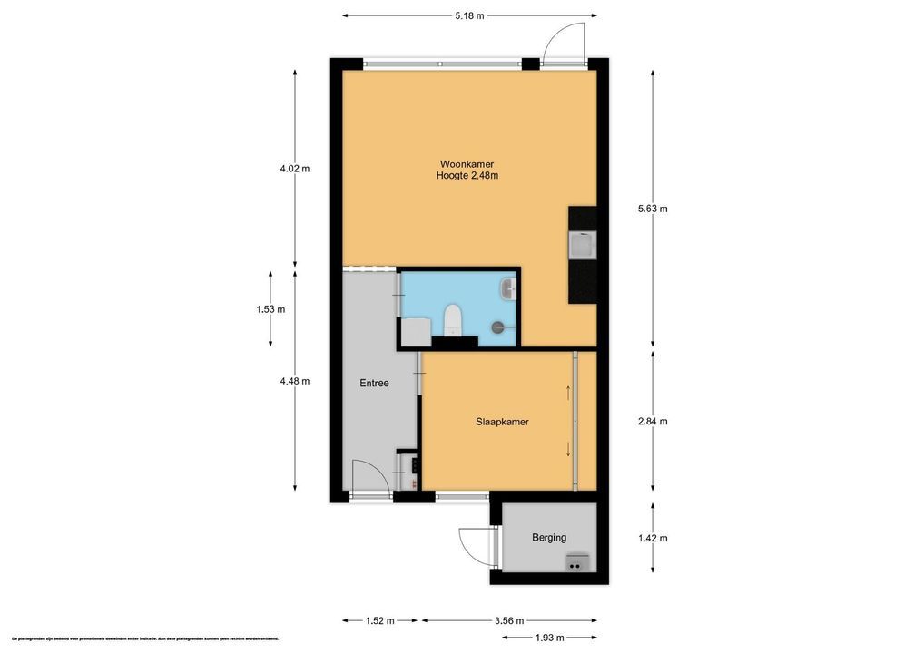 Berging aan de voorzijde met cv-installatie. Entree, meterkast. Ruime slaapkamer aan de voorzijde met raam. Badkamer met toilet en opstelling voor wasmachine. Lichte woonkamer met laminaatvloer en open keuken, voorzien van spoelbak, gasaansluiting en afzuigkap. Vanuit de woonkamer toegang tot de achtertuin met tuinschuurtje en achterom.