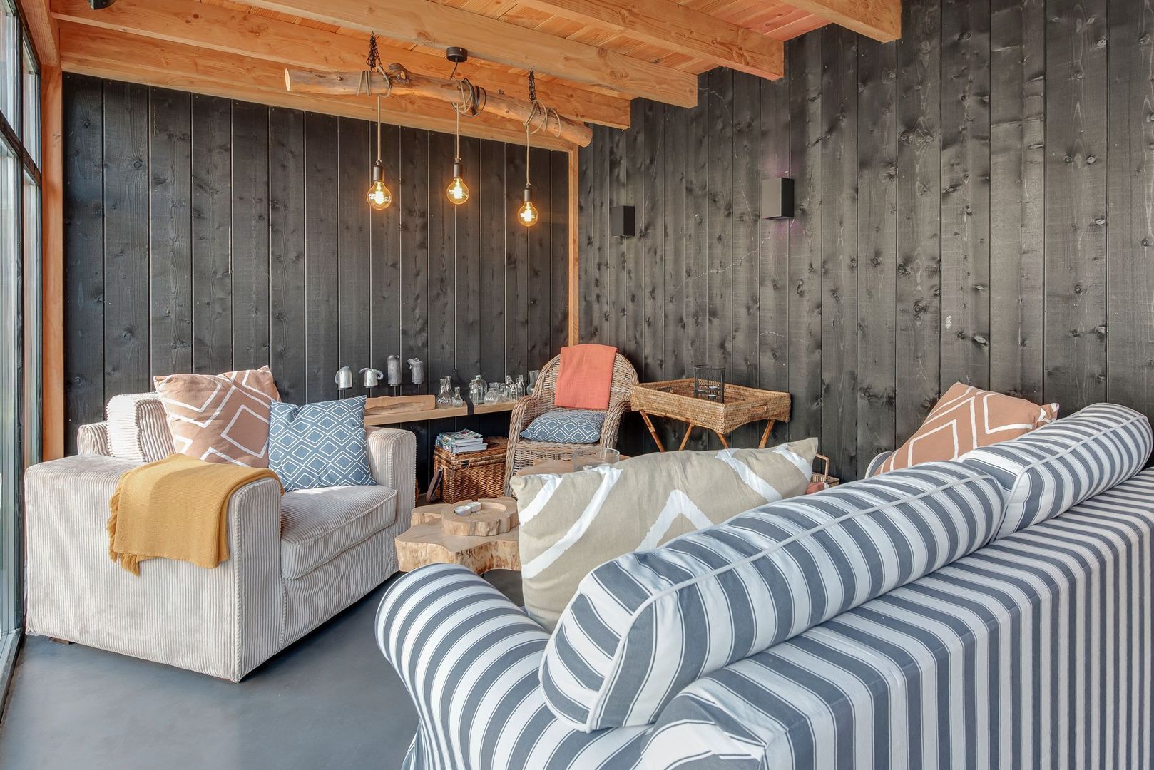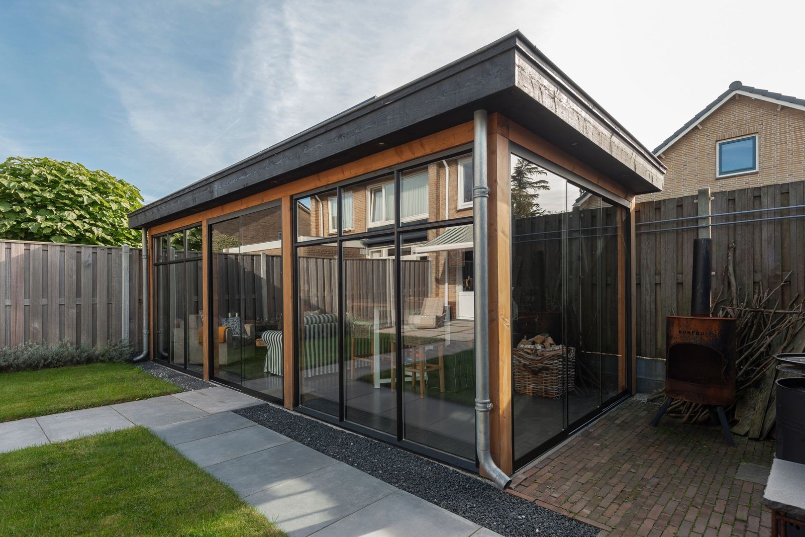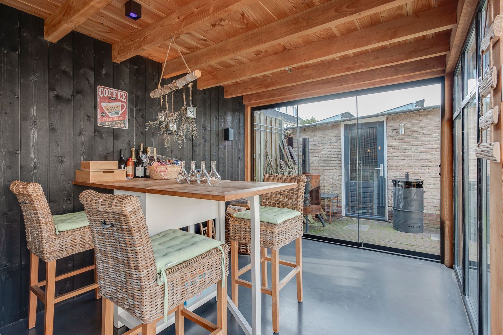 Sfeervolle, verwarmde ruimte van circa 19 m² v.v. gestorte vloer, sfeerverlichting, balkenplafond, volledig afsluitbaar d.m.v. hardglazen schuifpanelen.