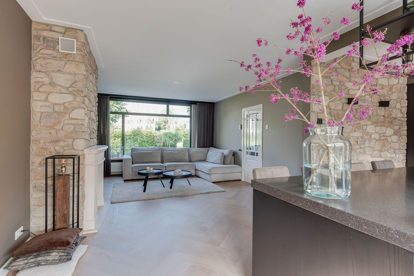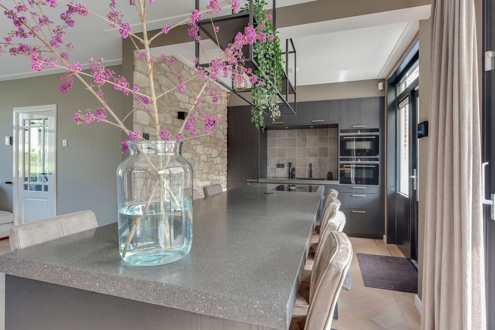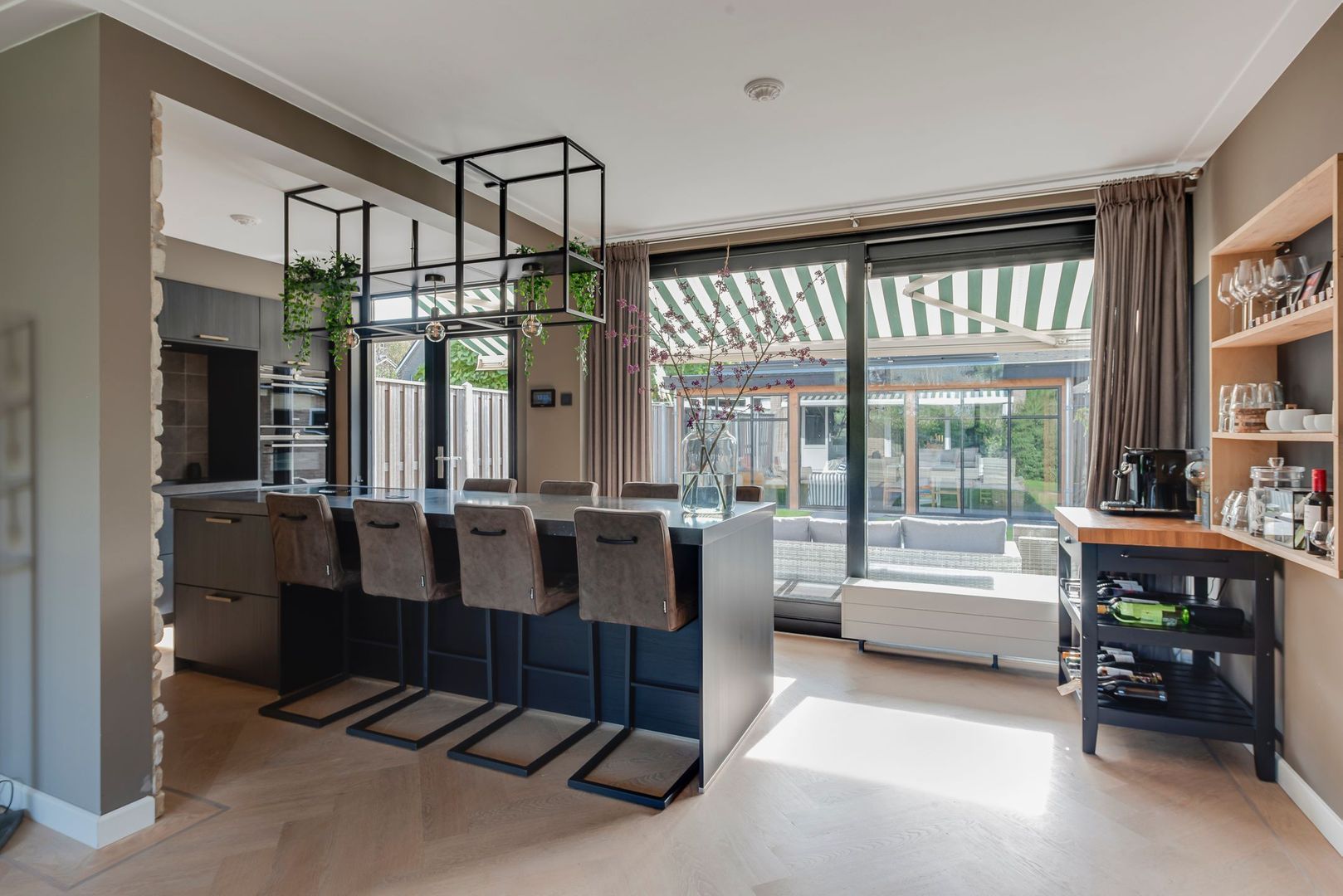 entree aan de voorzijde, ruime hal met garderobe, trap naar de 1e verdieping, vrijhangend toilet, meterkast (2022) en kelderkast. Vanuit de hal toegang tot de woonkamer met schouw v.v. gashaard, eiken visgraat-parket en schuifpui aan de achterzijde, moderne half-open woonkeuken (2020) v.v. kookeiland met inductiekookplaat inclusief rand-afzuiging (BORA), oven, oven/magnetron-combinatie, vaatwasser (SIEMENS), koelkast en vriezer (BAUKNEGT) en QUOOKER (warm en kokend water).