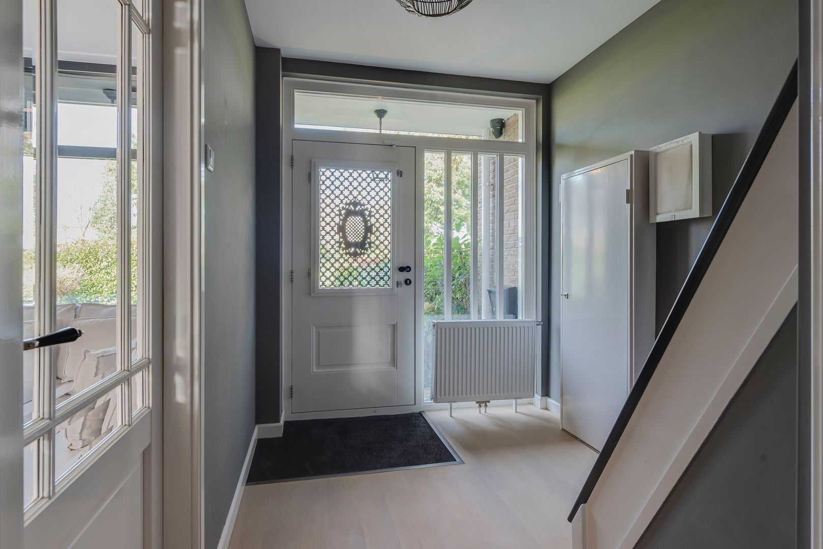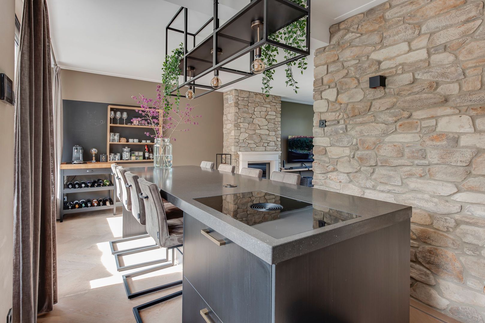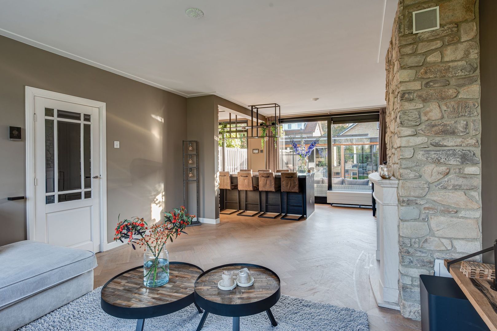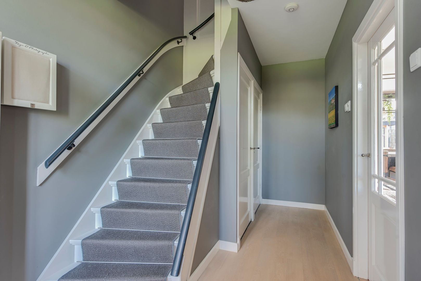 entree aan de voorzijde, ruime hal met garderobe, trap naar de 1e verdieping, vrijhangend toilet, meterkast (2022) en kelderkast. Vanuit de hal toegang tot de woonkamer met schouw v.v. gashaard, eiken visgraat-parket en schuifpui aan de achterzijde, moderne half-open woonkeuken (2020) v.v. kookeiland met inductiekookplaat inclusief rand-afzuiging (BORA), oven, oven/magnetron-combinatie, vaatwasser (SIEMENS), koelkast en vriezer (BAUKNEGT) en QUOOKER (warm en kokend water).