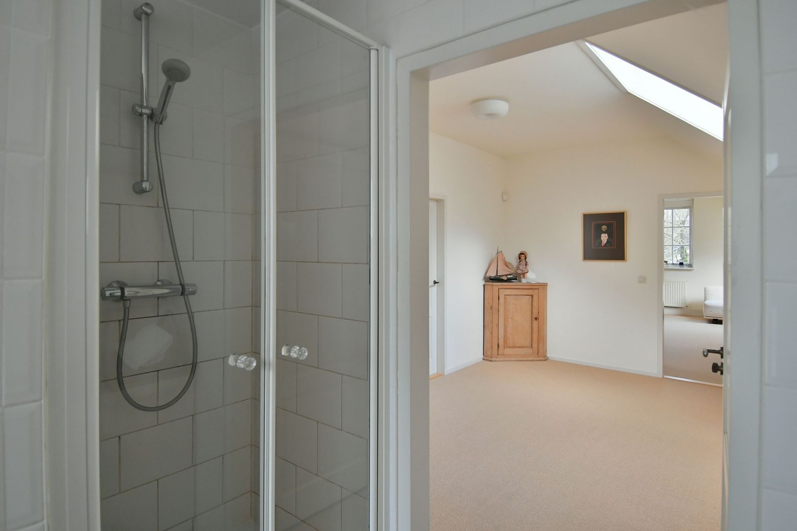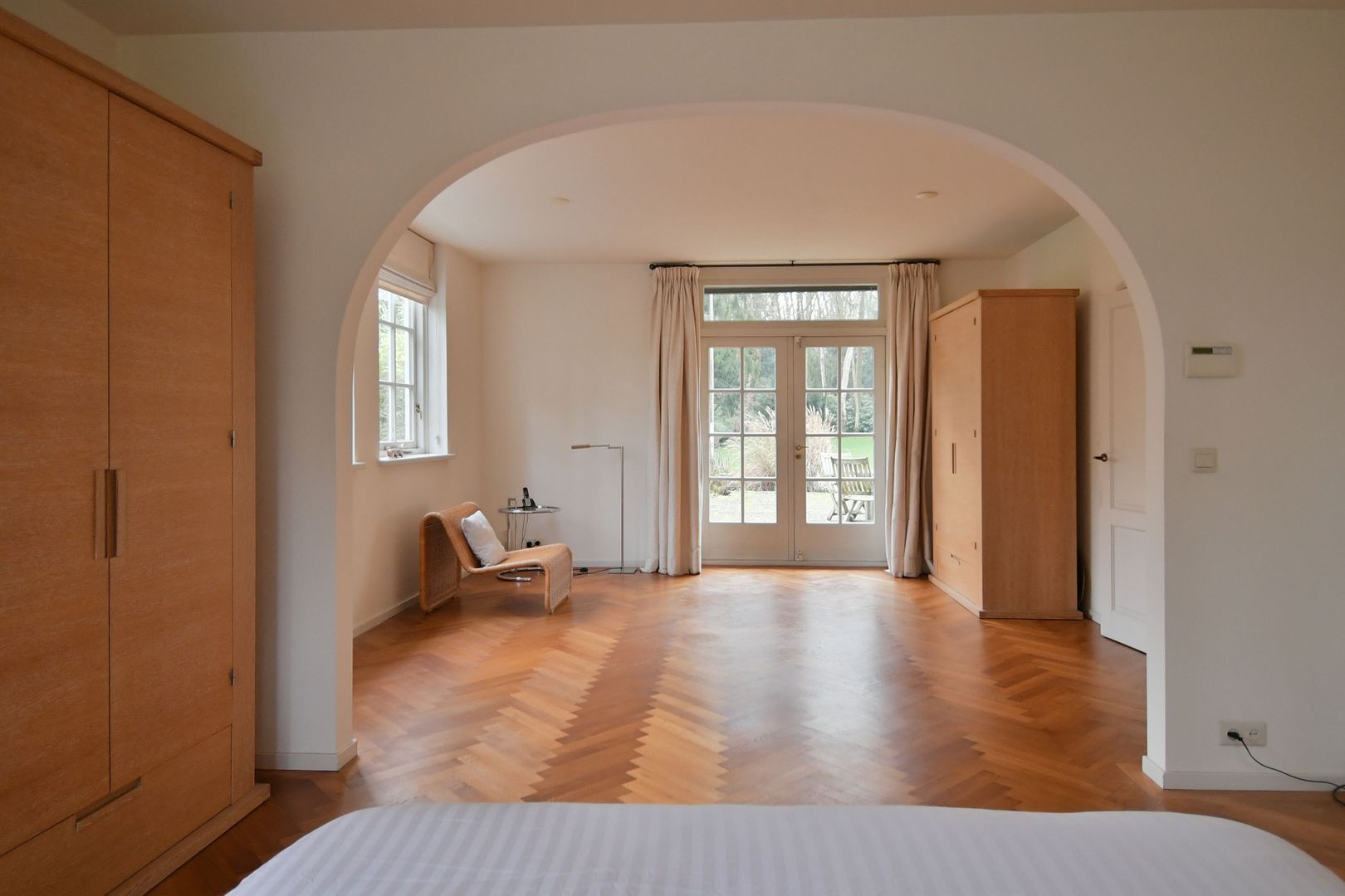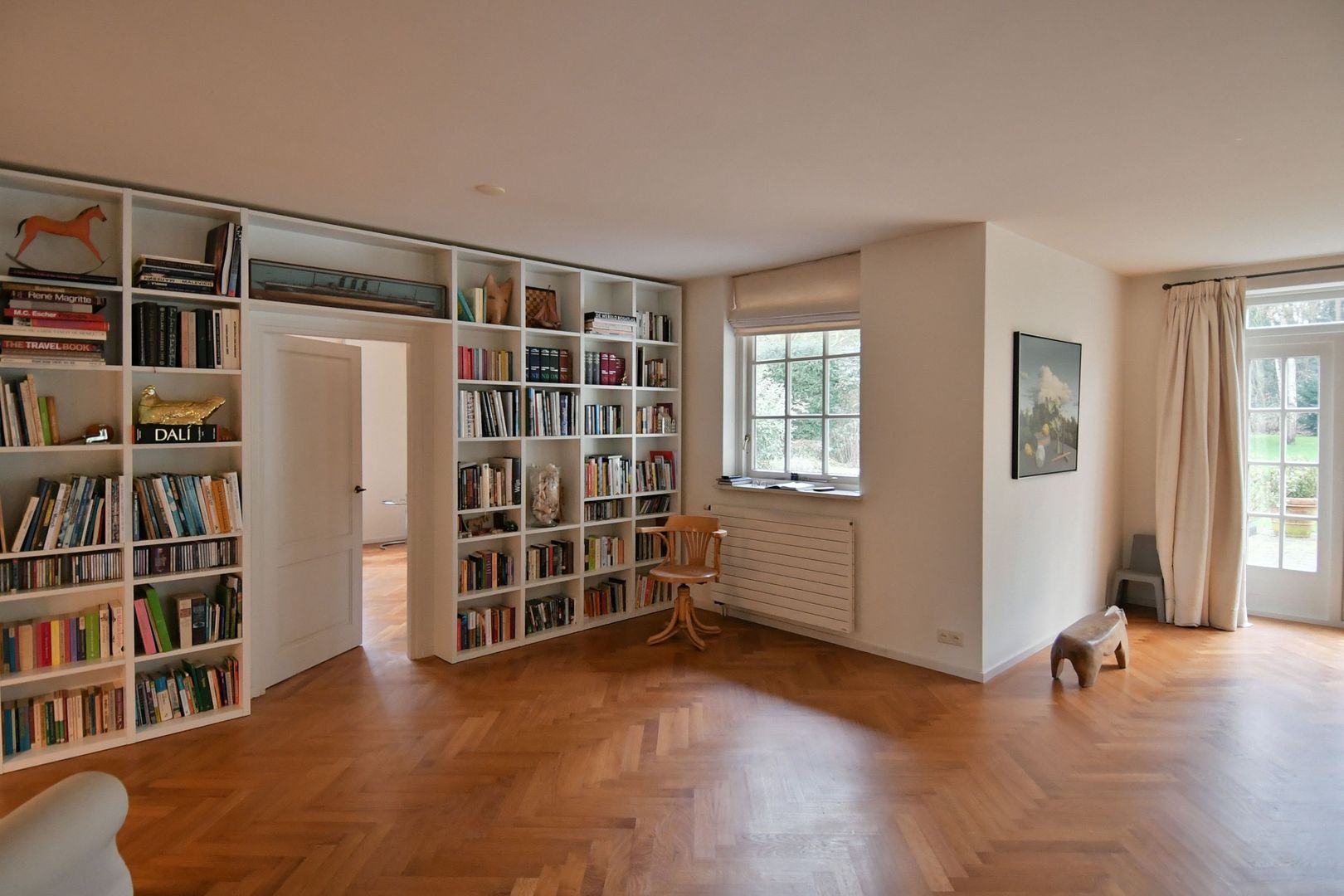 Entree, ruime hal, garderobe, m.k. modern toilet v.,v. wandcloset en fontein, zeer royale woonkamer met fraai zicht op de tuin, v.v. eiken parket, open haard, grote inloopkast, bibliotheekkasten-wand, openslaande deuren naar zonneterras en openslaande deuren naar moderne woonkeuken v.v. complete inbouwapparatuur, aangrenzende hoofdslaapkamer met moderne badkamer v.v. hoekbad, wastafelmeubel, wandcloset, bidet en douche.