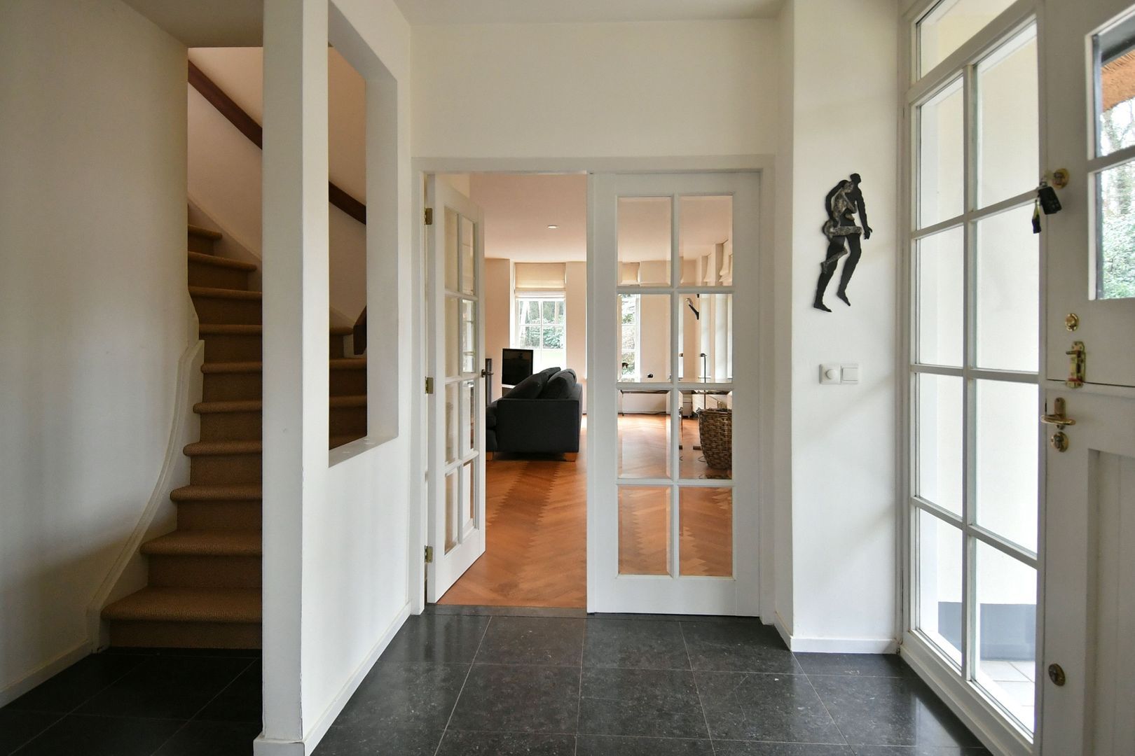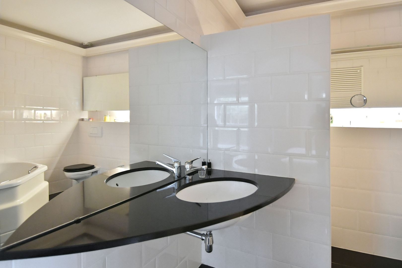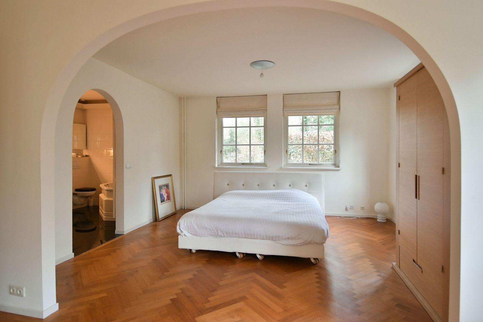 Entree, ruime hal, garderobe, m.k. modern toilet v.,v. wandcloset en fontein, zeer royale woonkamer met fraai zicht op de tuin, v.v. eiken parket, open haard, grote inloopkast, bibliotheekkasten-wand, openslaande deuren naar zonneterras en openslaande deuren naar moderne woonkeuken v.v. complete inbouwapparatuur, aangrenzende hoofdslaapkamer met moderne badkamer v.v. hoekbad, wastafelmeubel, wandcloset, bidet en douche.