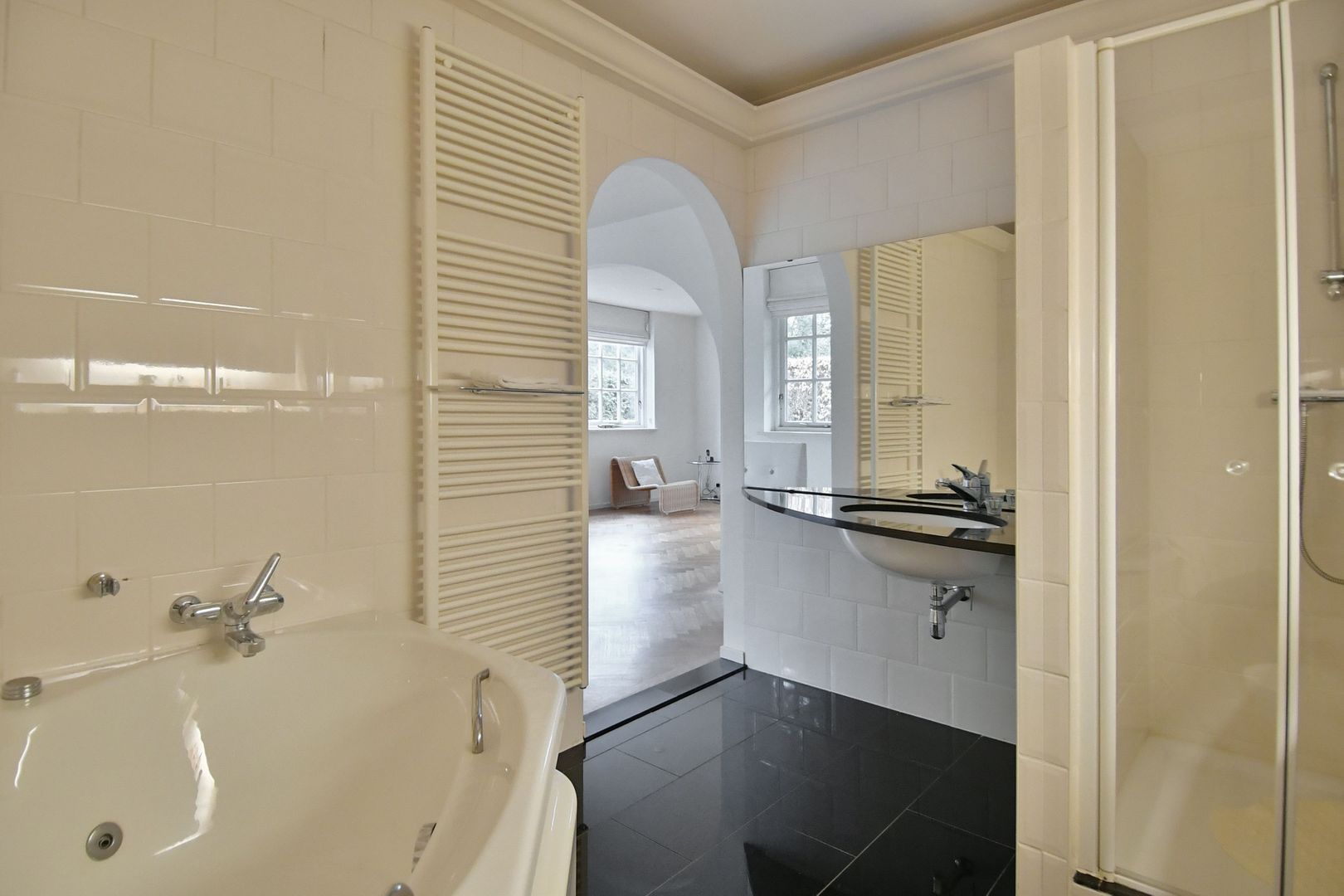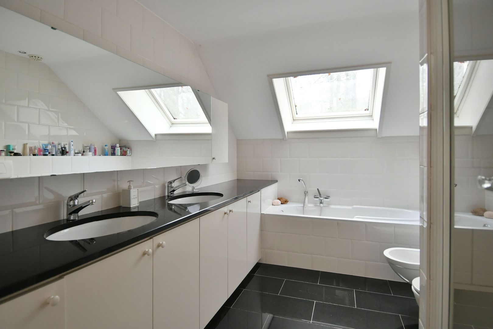 1e verdieping: royale centrale hal, deur naar wasruimte en deur naar bergruimte, 3 ruime slaapkamers, elk v.v. raam in topgevel en 2 dakramen, 2e badkamer v.v. dubbel wastafelmeubel, douche, wandcloset, bidet en ligbad. De slaapkamers zijn nergens aangrenzend.