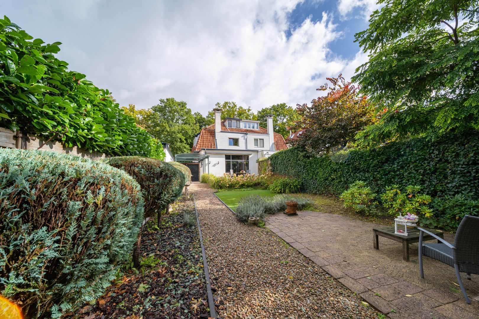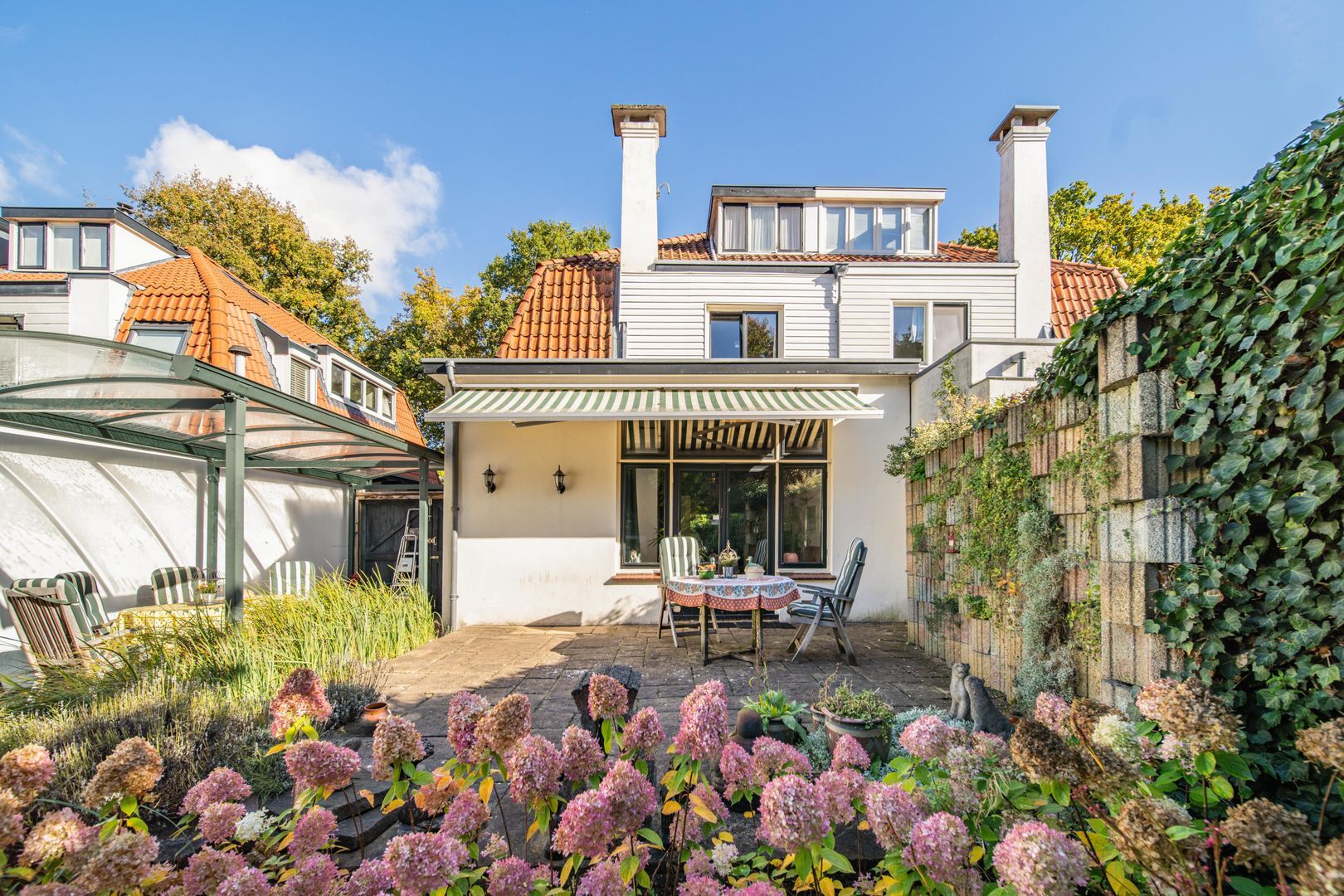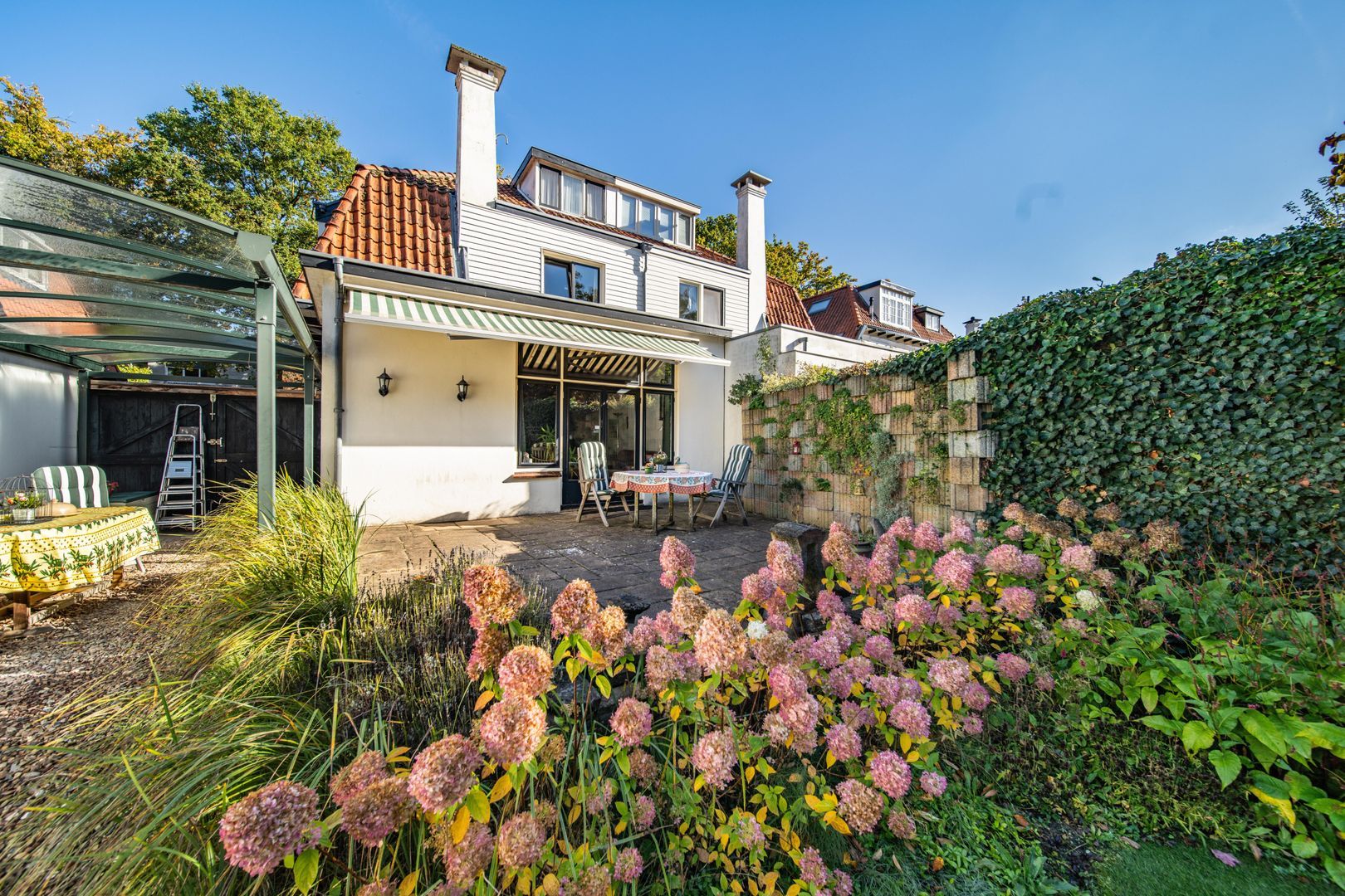 De achtertuin biedt centraal in Baarn een zeldzame combinatie van ruimte, rust, privacy, oude bomen en goede bezonning. Aan de voorzijde beschikt de woning over een ruime voortuin met meerdere parkeerplaatsen. De grote L-vormige garage biedt volop bergruimte en leent zich ook uitstekend voor gebruik als gastenverblijf of werkruimte. Aan de rechterzijde van de woning bevindt zich een carport.