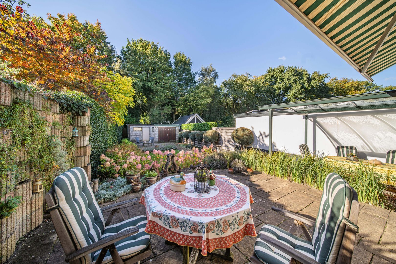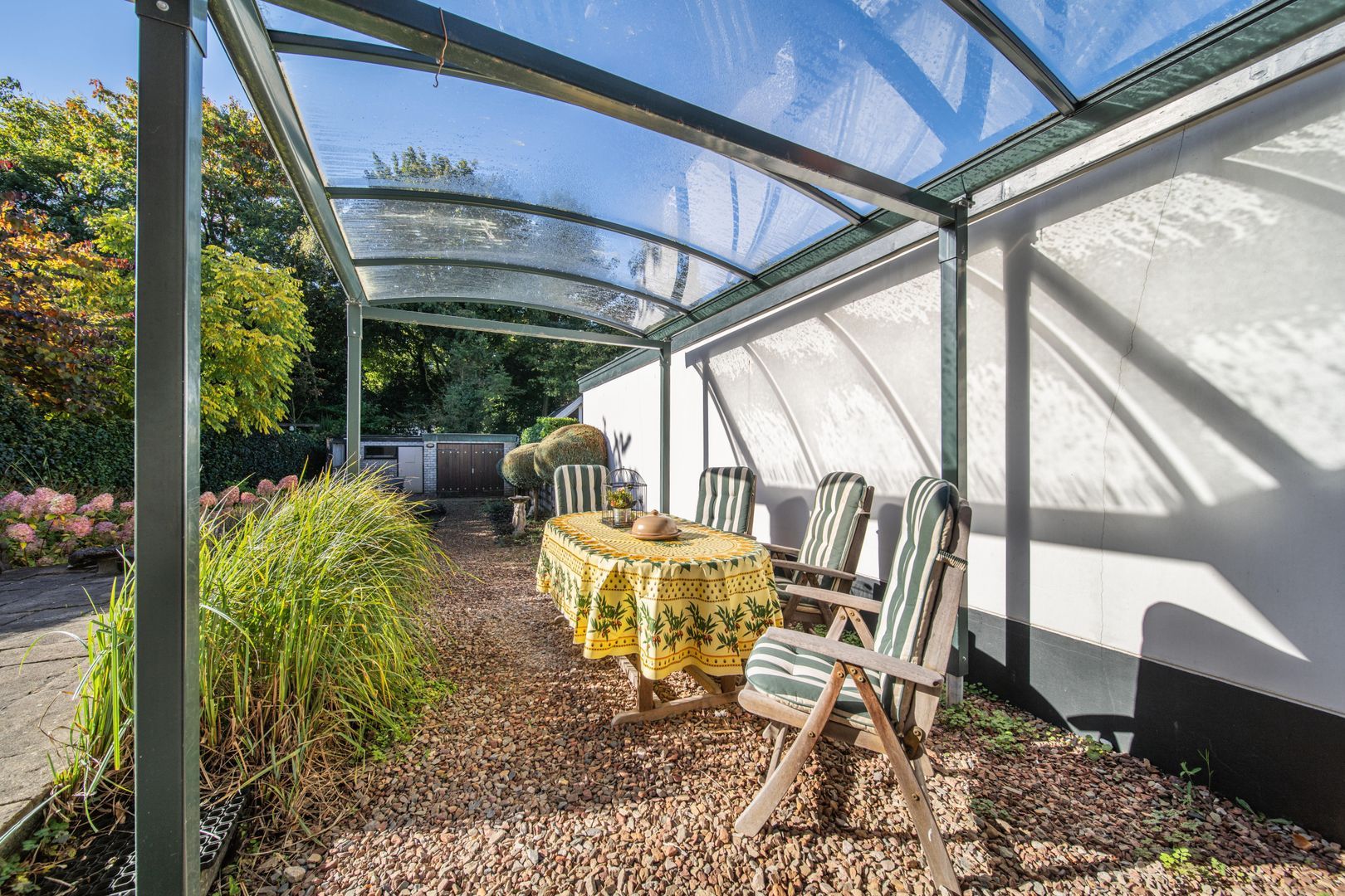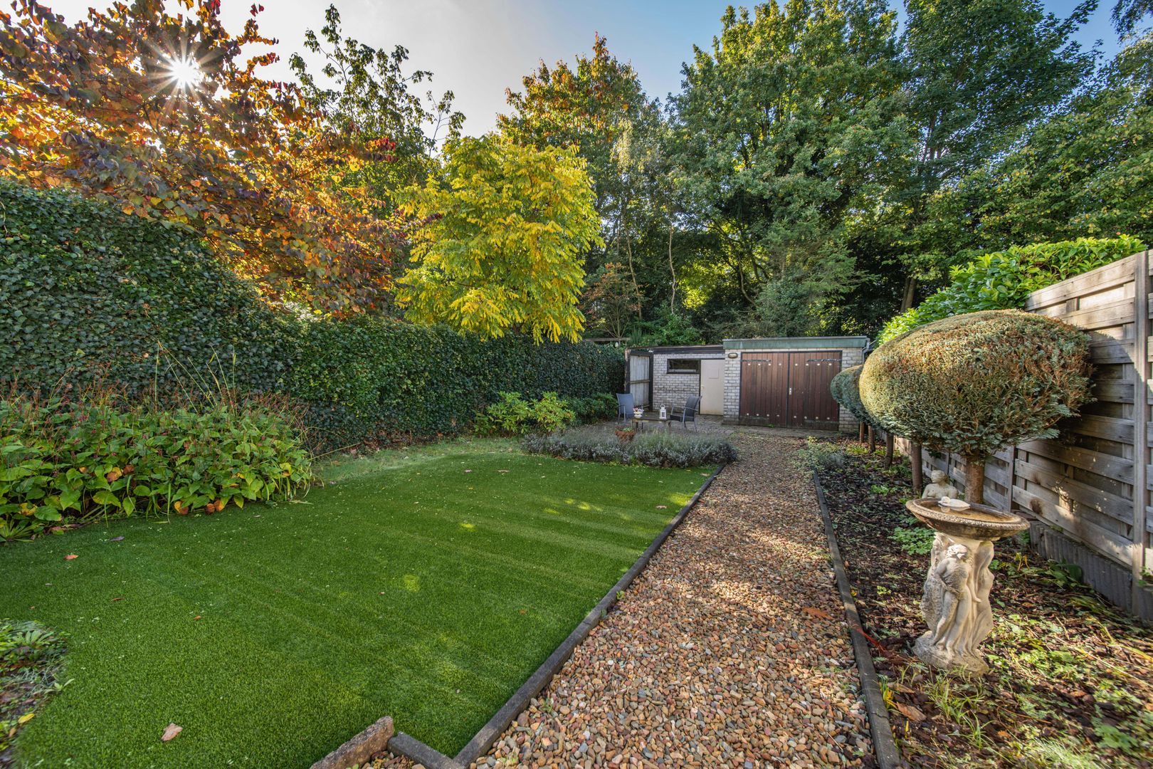 De achtertuin biedt centraal in Baarn een zeldzame combinatie van ruimte, rust, privacy, oude bomen en goede bezonning. Aan de voorzijde beschikt de woning over een ruime voortuin met meerdere parkeerplaatsen. De grote L-vormige garage biedt volop bergruimte en leent zich ook uitstekend voor gebruik als gastenverblijf of werkruimte. Aan de rechterzijde van de woning bevindt zich een carport.