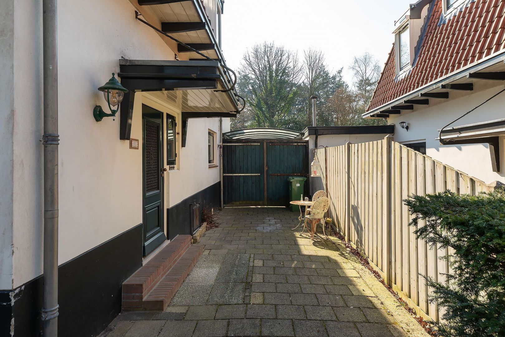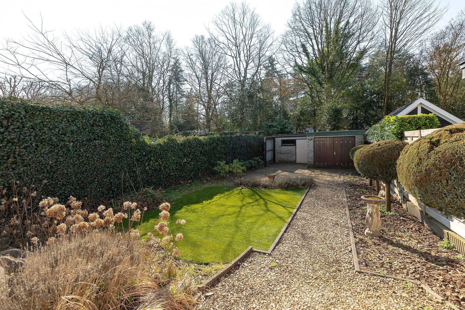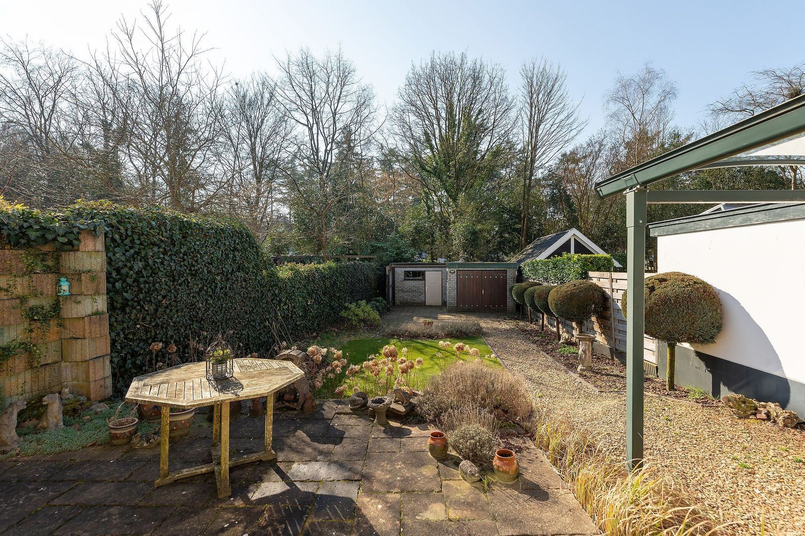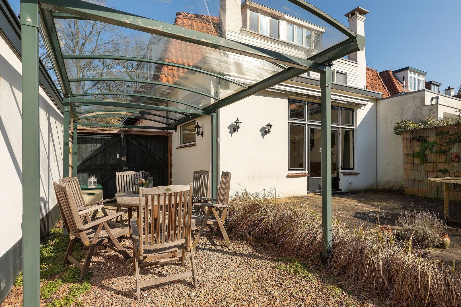 De achtertuin biedt centraal in Baarn een zeldzame combinatie van ruimte, rust, privacy, oude bomen en goede bezonning. Aan de voorzijde beschikt de woning over een ruime voortuin met meerdere parkeerplaatsen. De grote L-vormige garage biedt volop bergruimte en leent zich ook uitstekend voor gebruik als gastenverblijf of werkruimte. Aan de rechterzijde van de woning bevindt zich een carport.