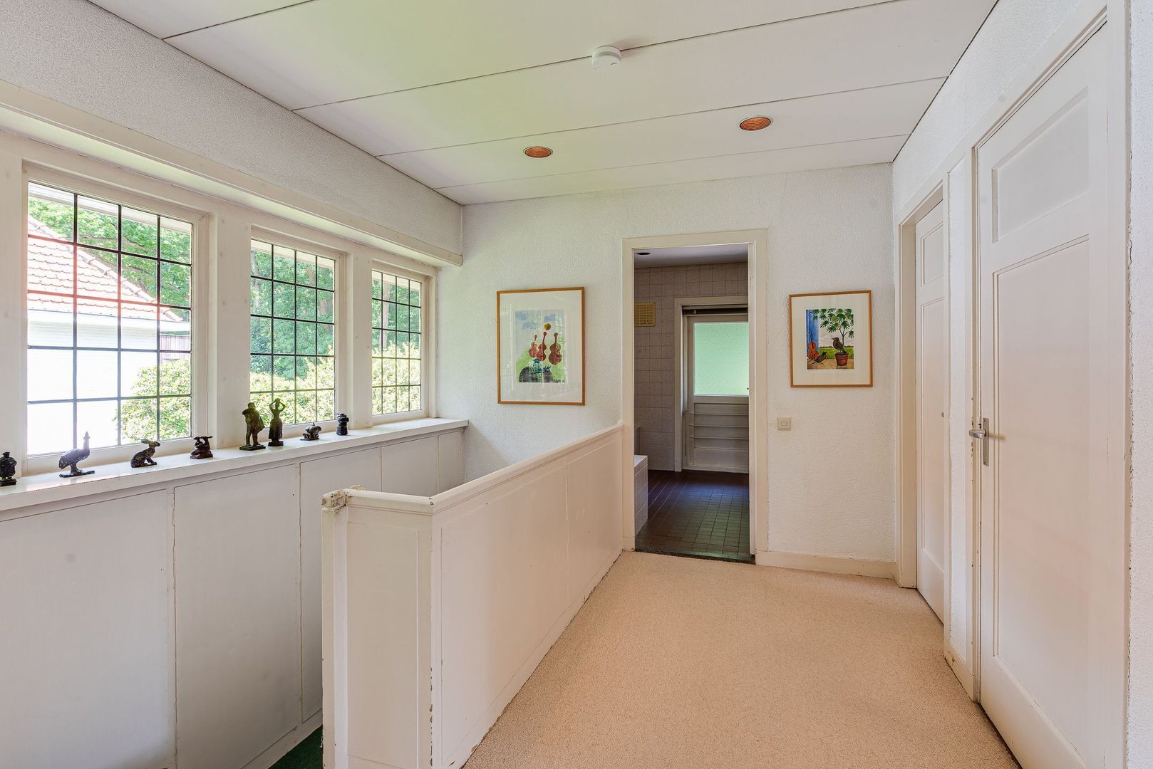 Ruime overloop, hele verdieping v.v. glas-in-loodramen, trapopgang naar zolder, slaapkamer voorzijde met vaste kast, 2e slaapkamer met vaste kastenwand, 3e slaapkamer met openslaande deuren naar dakterras, badkamer v.v. dubbele wastafel, ligbad met douche, 2e toilet en deur naar dakterras.