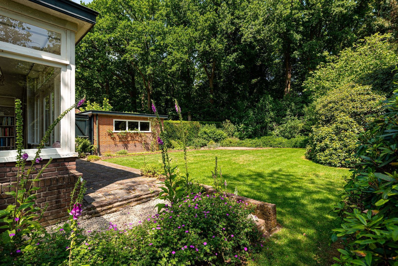 De zeer royale achtertuin biedt een zeldzame combinatie van rust, ruimte, privacy, oude bomen en een uitstekende zonligging, grenzend aan het prachtige Benthuijsbos. Een unieke, centrale ligging in Baarn, op loopafstand van het centrum, scholen, het station en uitgestrekte wandelbossen bij Kasteel Groeneveld.