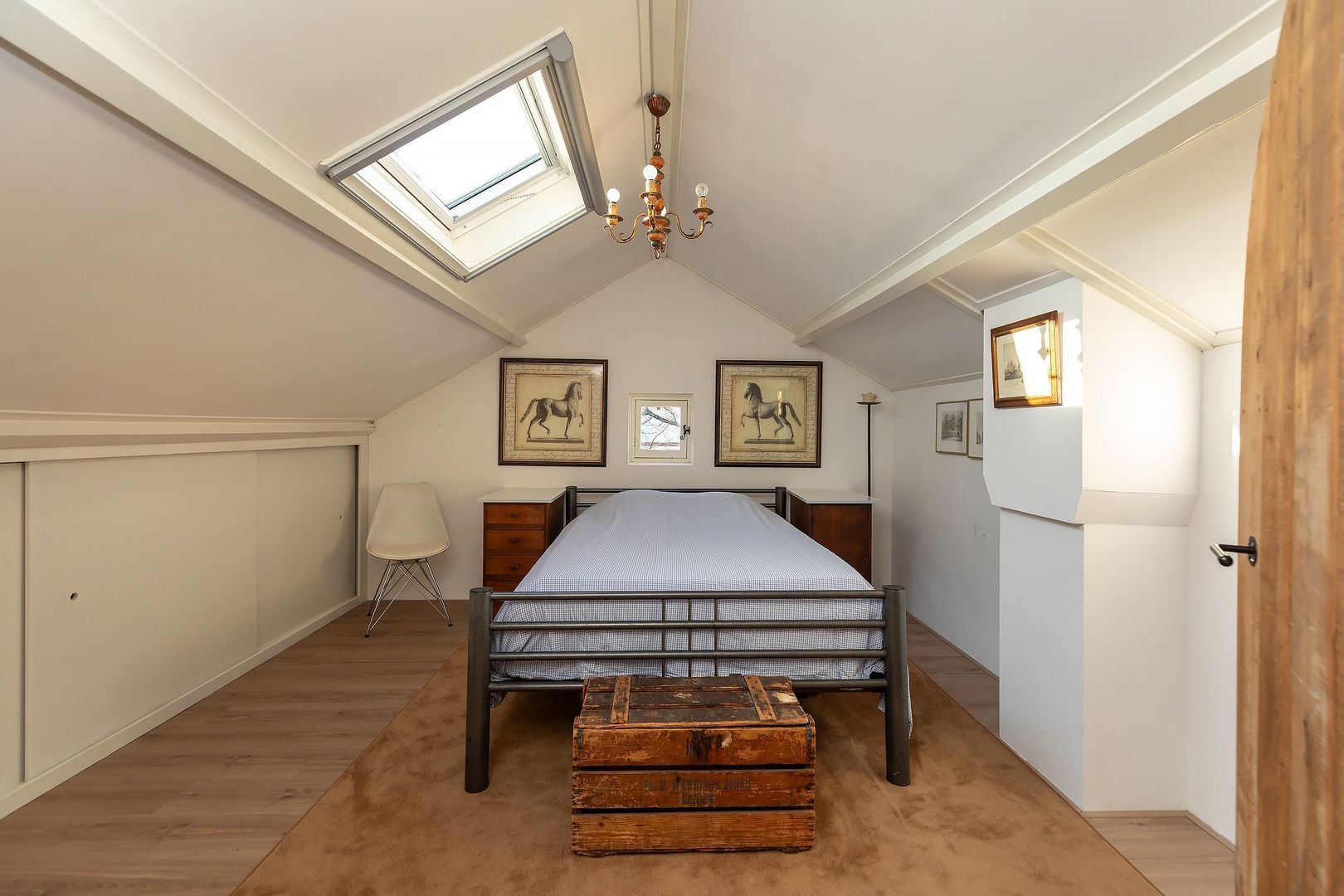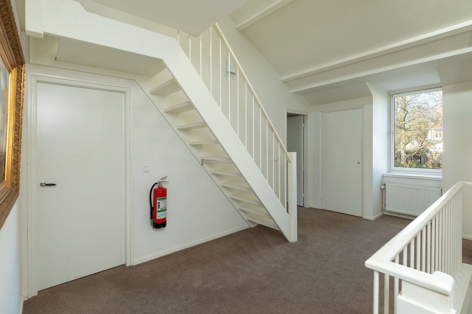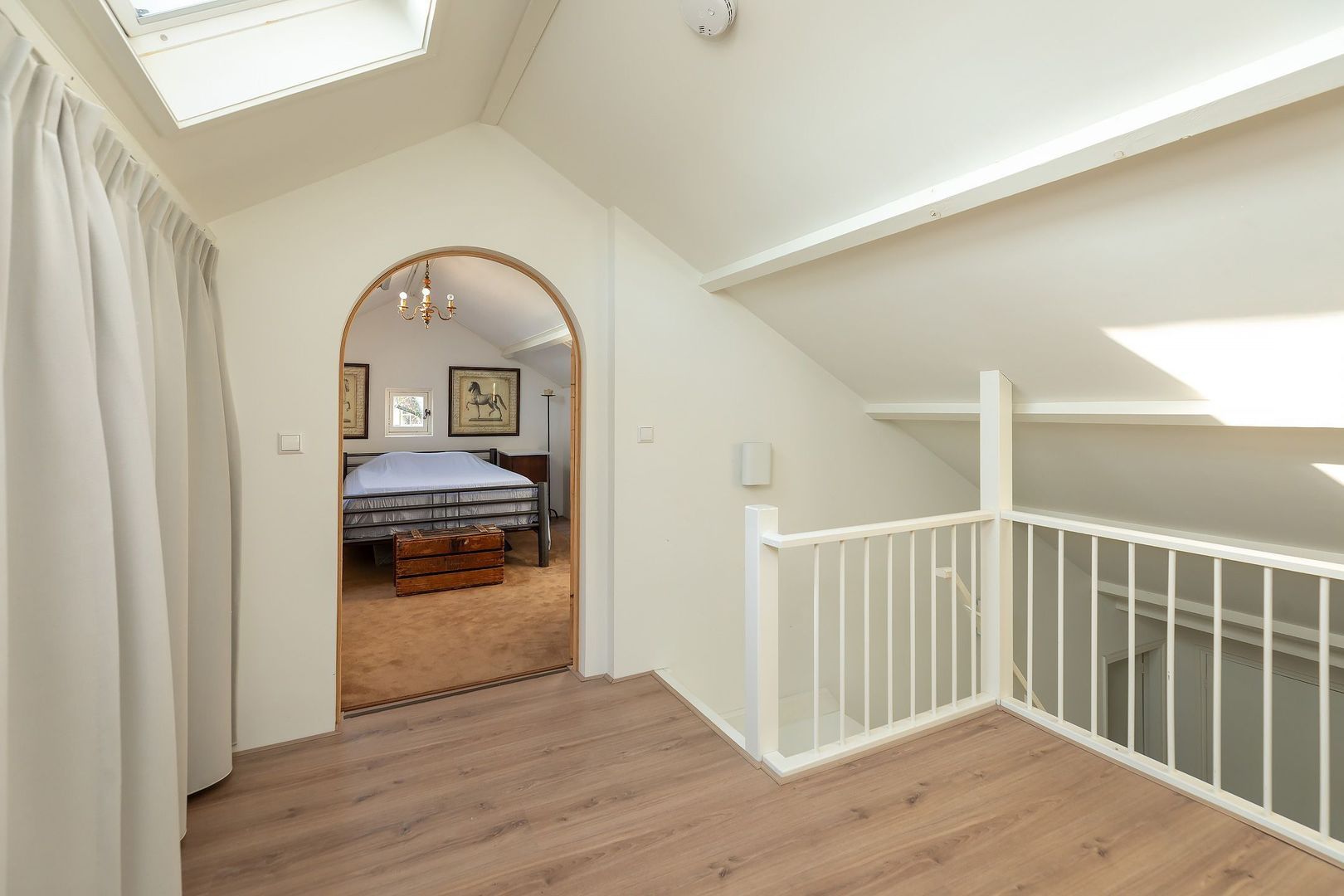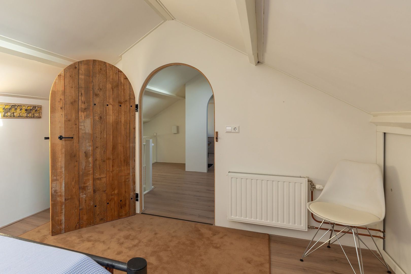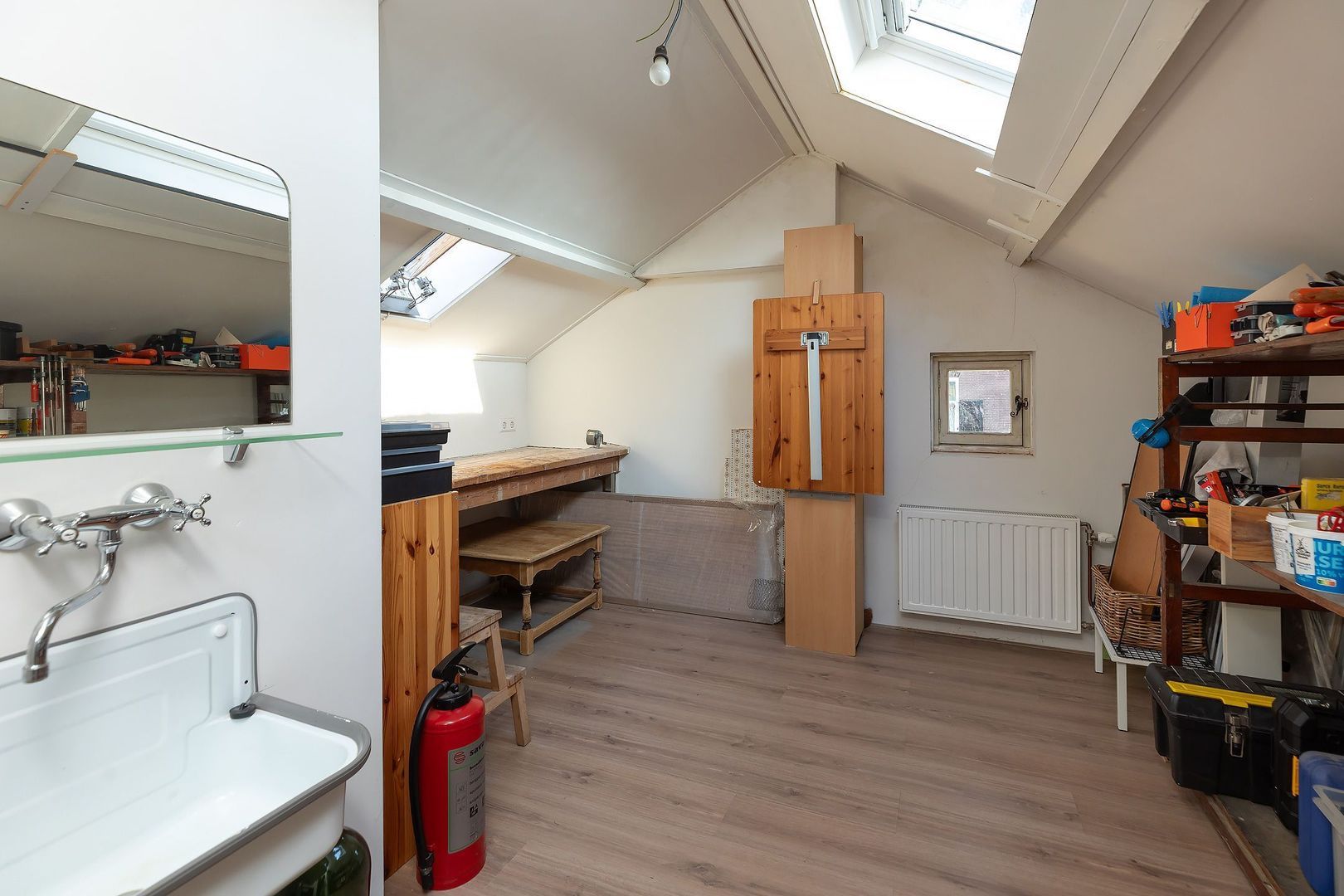 Vaste trap naar zolderverdieping met overloop/vide v.v. dakraam, en 5e en 6e (slaap)kamer (waarvan 1 thans in gebruik als klusruimte), beide v.v. raam in de kopgevel en beide v.v. 1 dakraam.