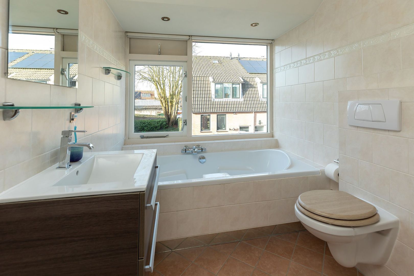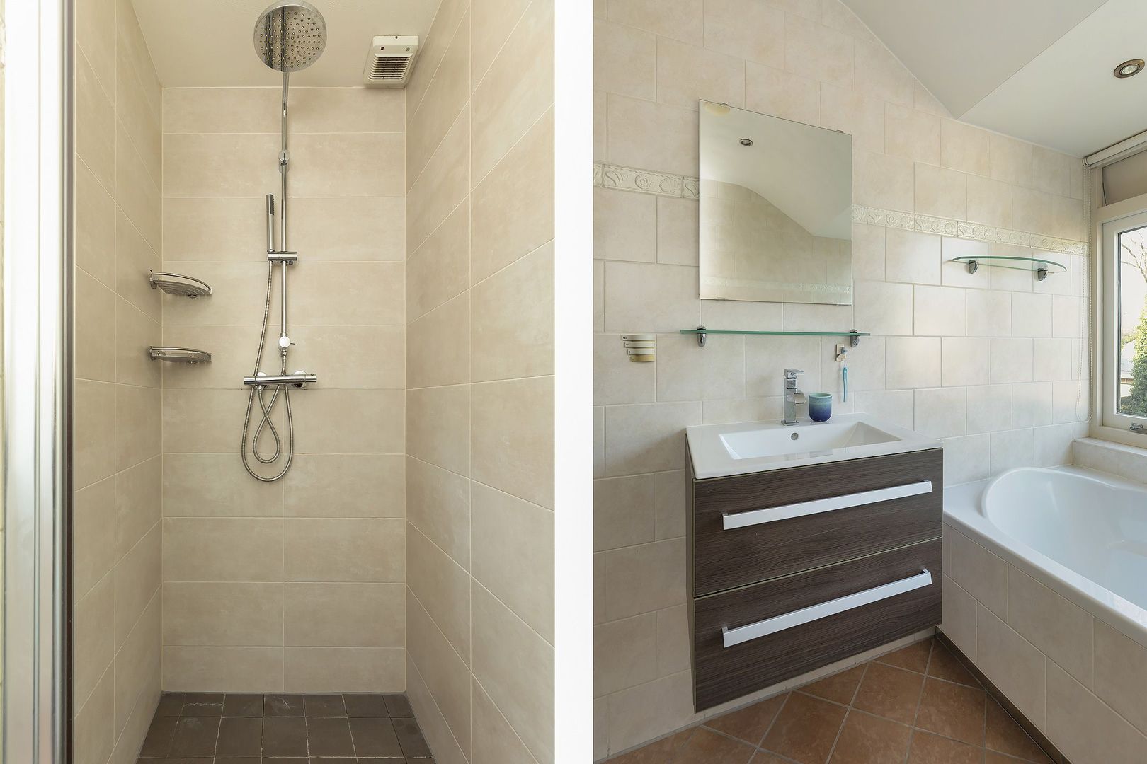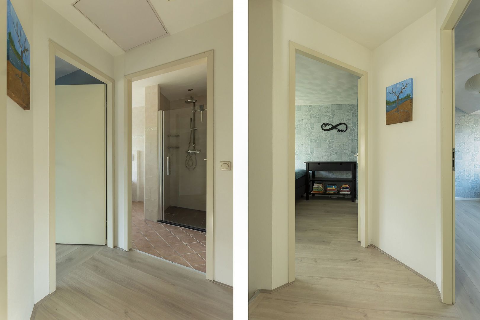 Overloop, 2 slaapkamers waarvan de grootste is voorzien van een inloopkast. Luxe badkamer met ligbad, douche, wastafel en 2e toilet. Op de overloop bevindt zich een luik naar de bergvliering met cv-opstelling.