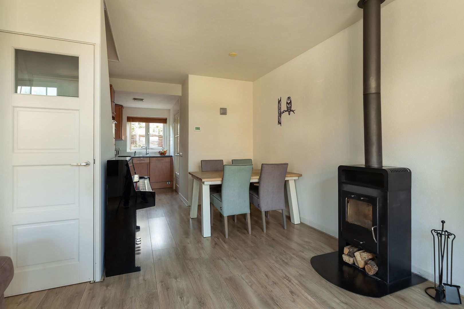 Entree aan de achterzijde, hal met meterkast en hangend toilet met fonteintje. Royale L-vormige woon-/eetkamer met laminaatvloer, vloerverwarming en sfeervolle houtkachel. Moderne open keuken voorzien van diverse inbouwapparatuur. Vanuit de woonkamer trap naar het souterrain.