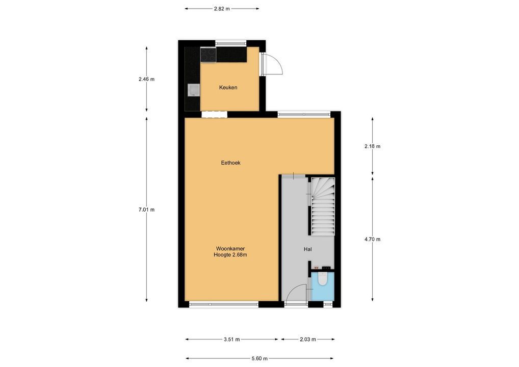 Entree met hoge hal, toilet, stoppenkast en meterkast. Grote trapkast en trapopgang naar de eerste verdieping. Ruime, lichte woonkamer met een leuke eethoek en toegang tot de tuin. Keuken met spoelbak, 5-pits fornuis, afzuigkap en wasmachineaansluiting. Mogelijkheid voor een open keuken.