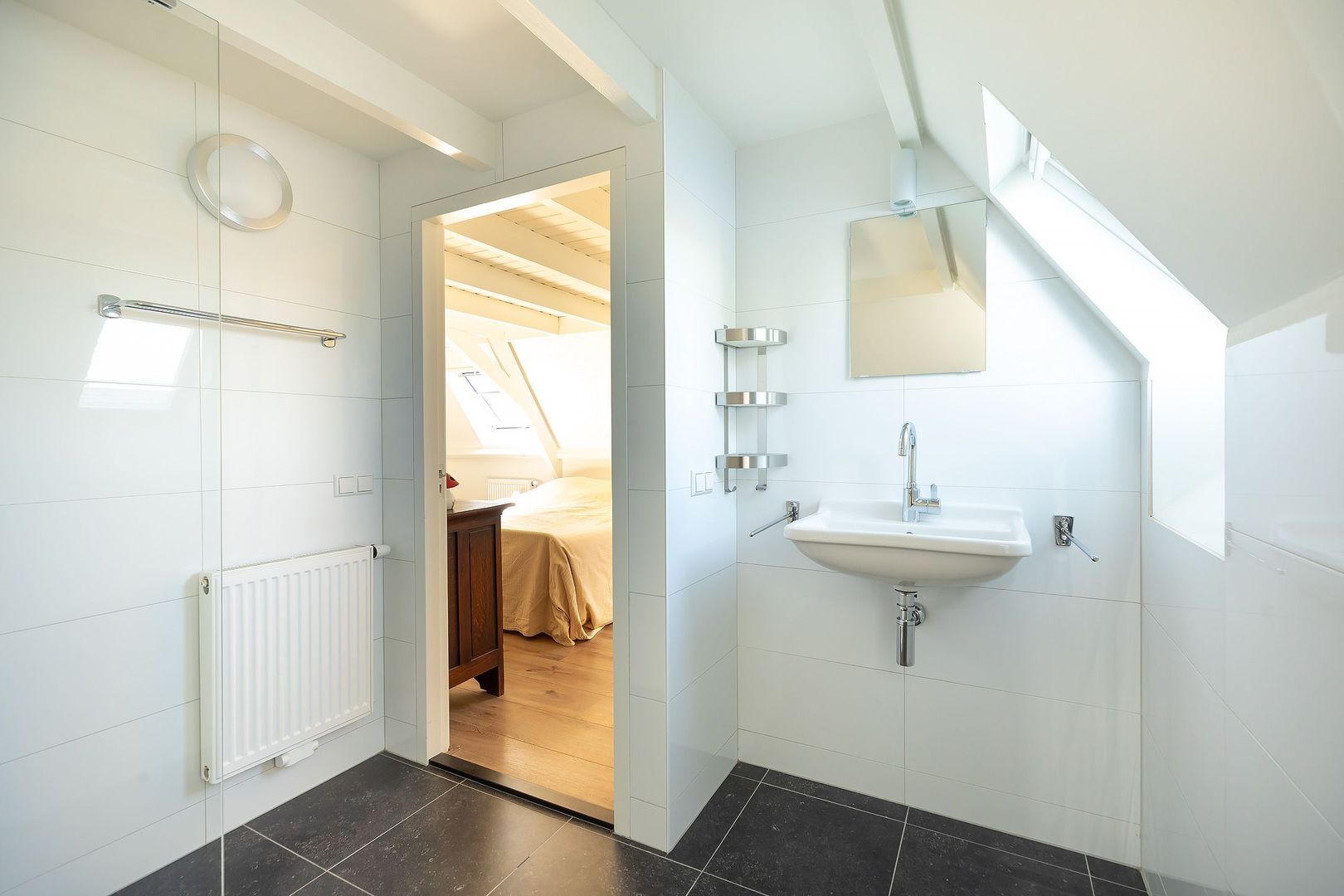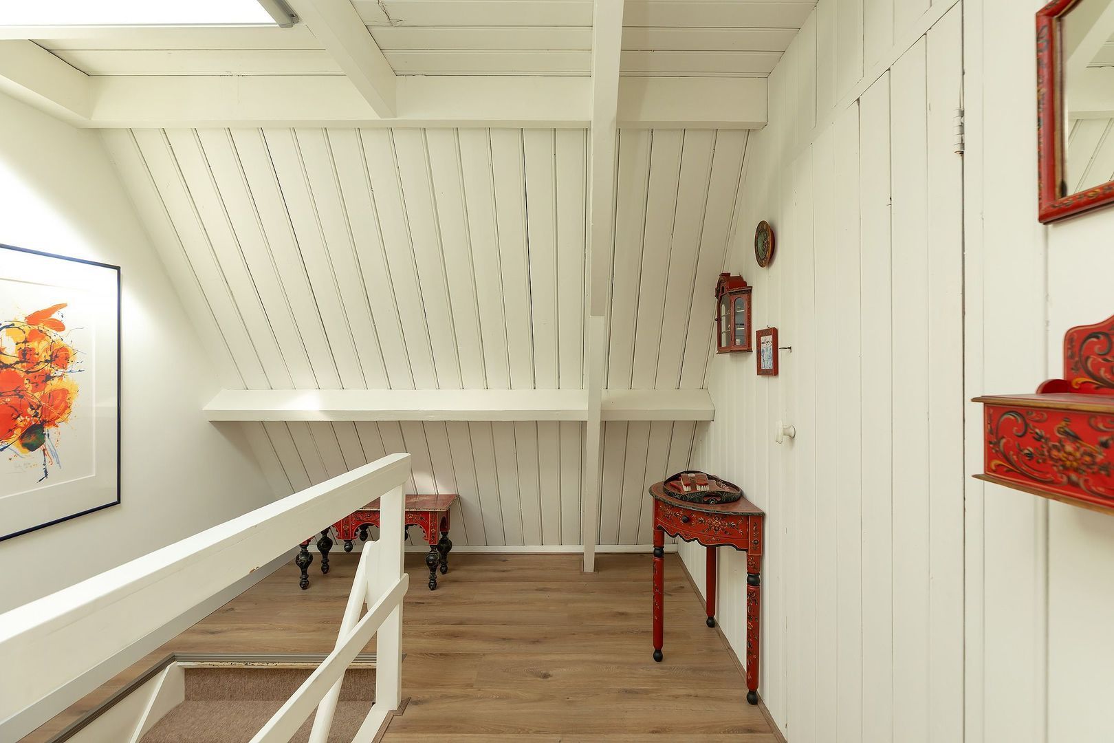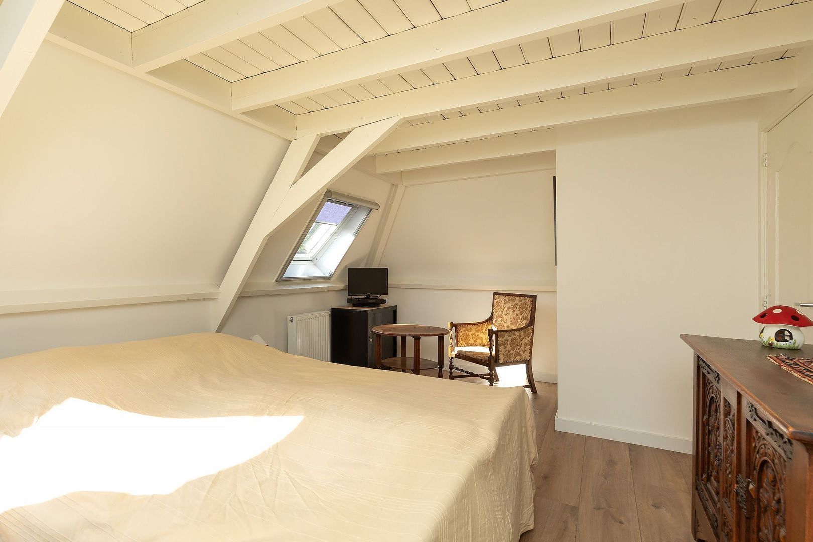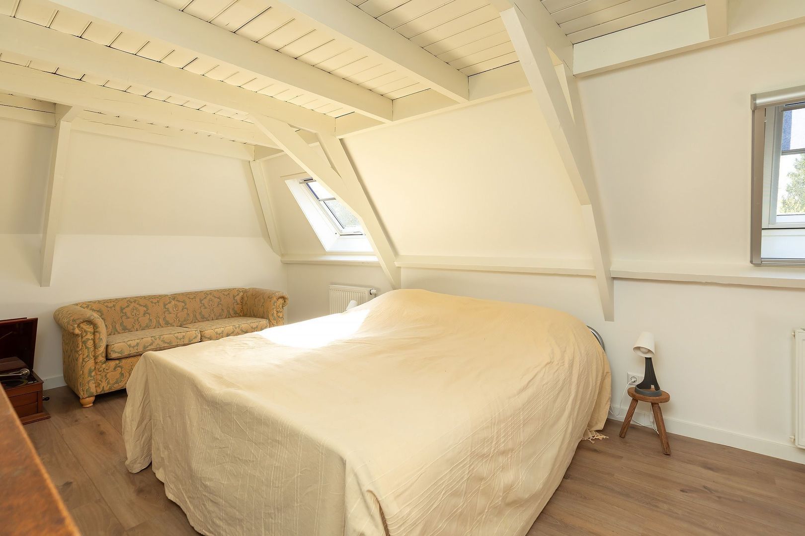 Vaste trap naar volwaardige 2e verdieping met overloop, vide, ruime (dubbele) 4e slaapkamer v.v. 2 dakramen en balkenplafond (eenvoudig te splitsen in 2 slaapkamers), 2e moderne badkamer met hardstenen vloertegels v.v. wandcloset, inloopdouche, wastafel en dakraam. Vanaf overloop deur naar c.v.-ruimte v.v. dakraam met opstelling gas cv-combiketel, HR 2014.