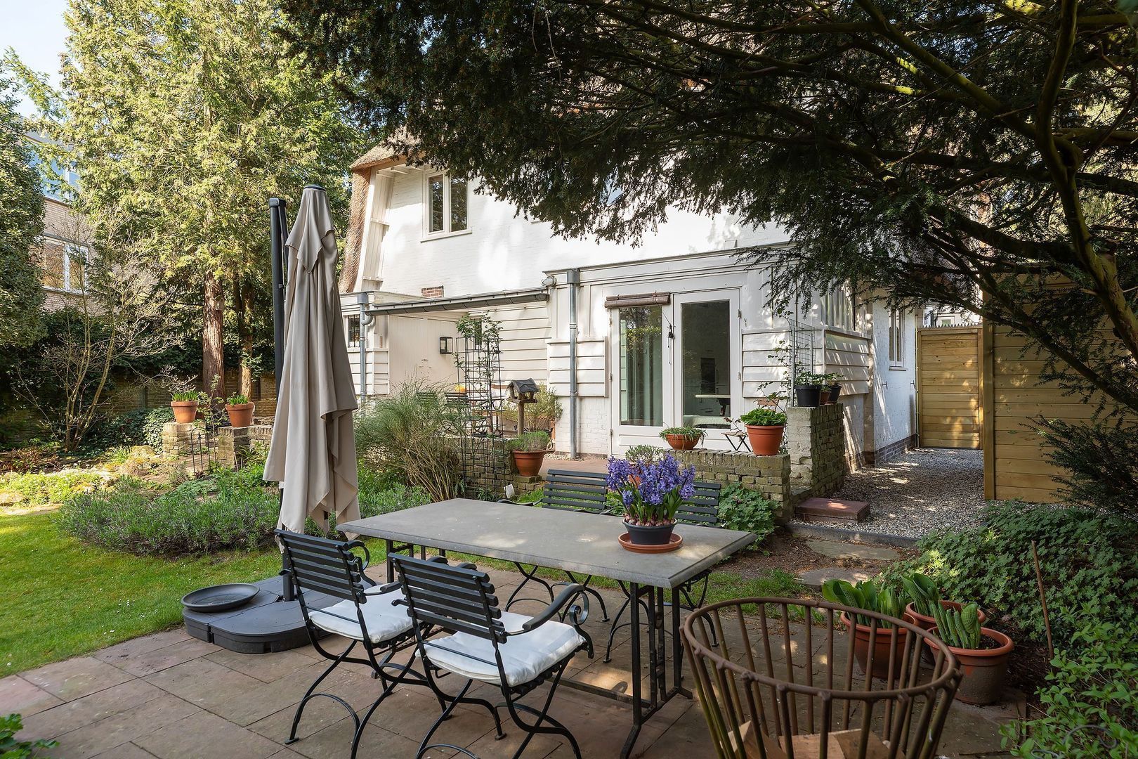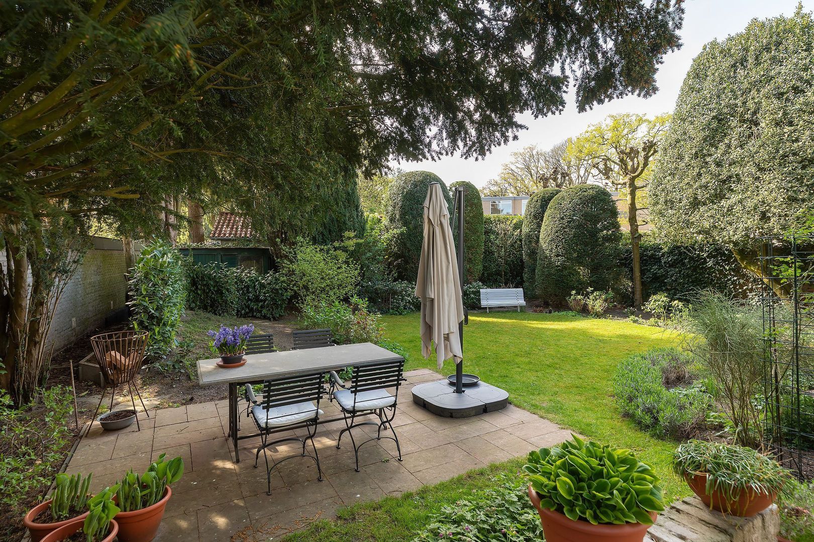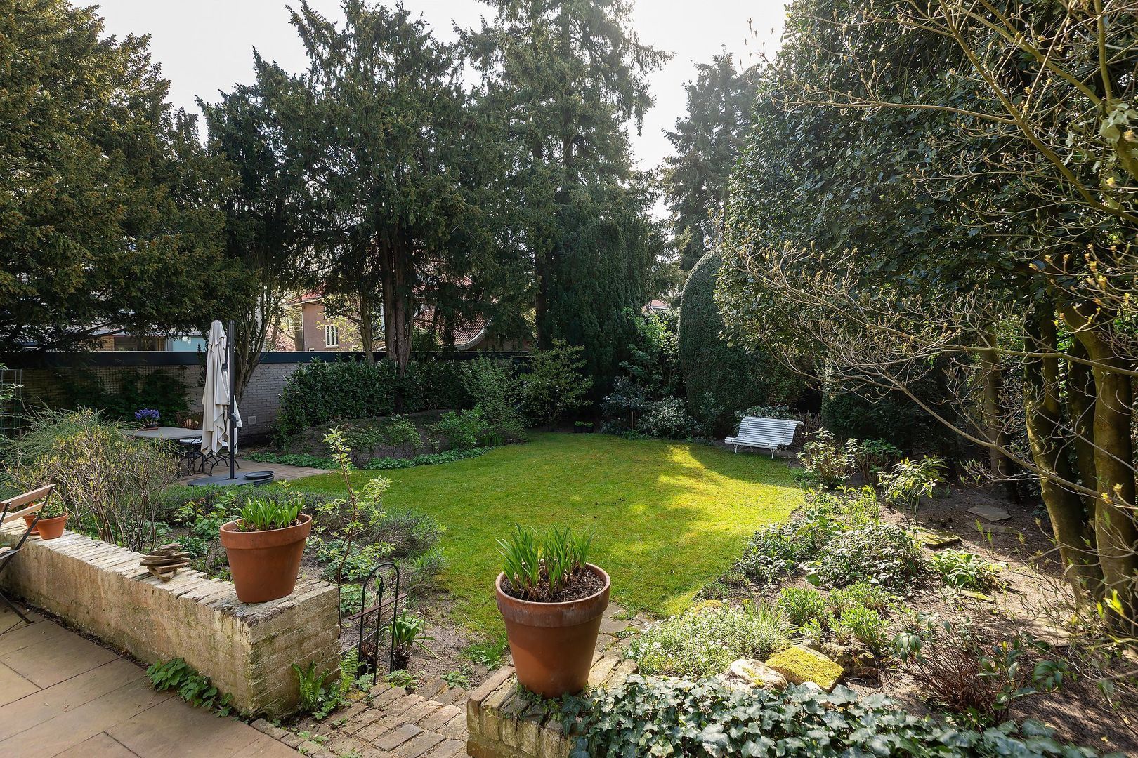 - besloten achtertuin op het Zuiden met veranda en meerdere terrassen