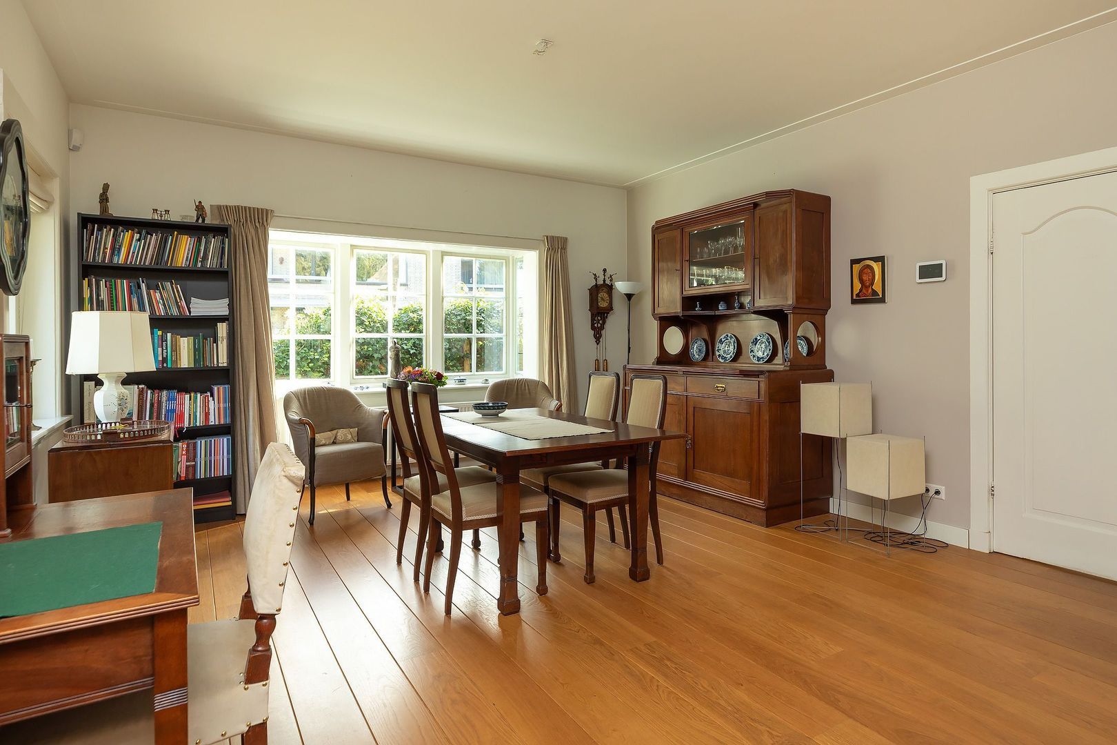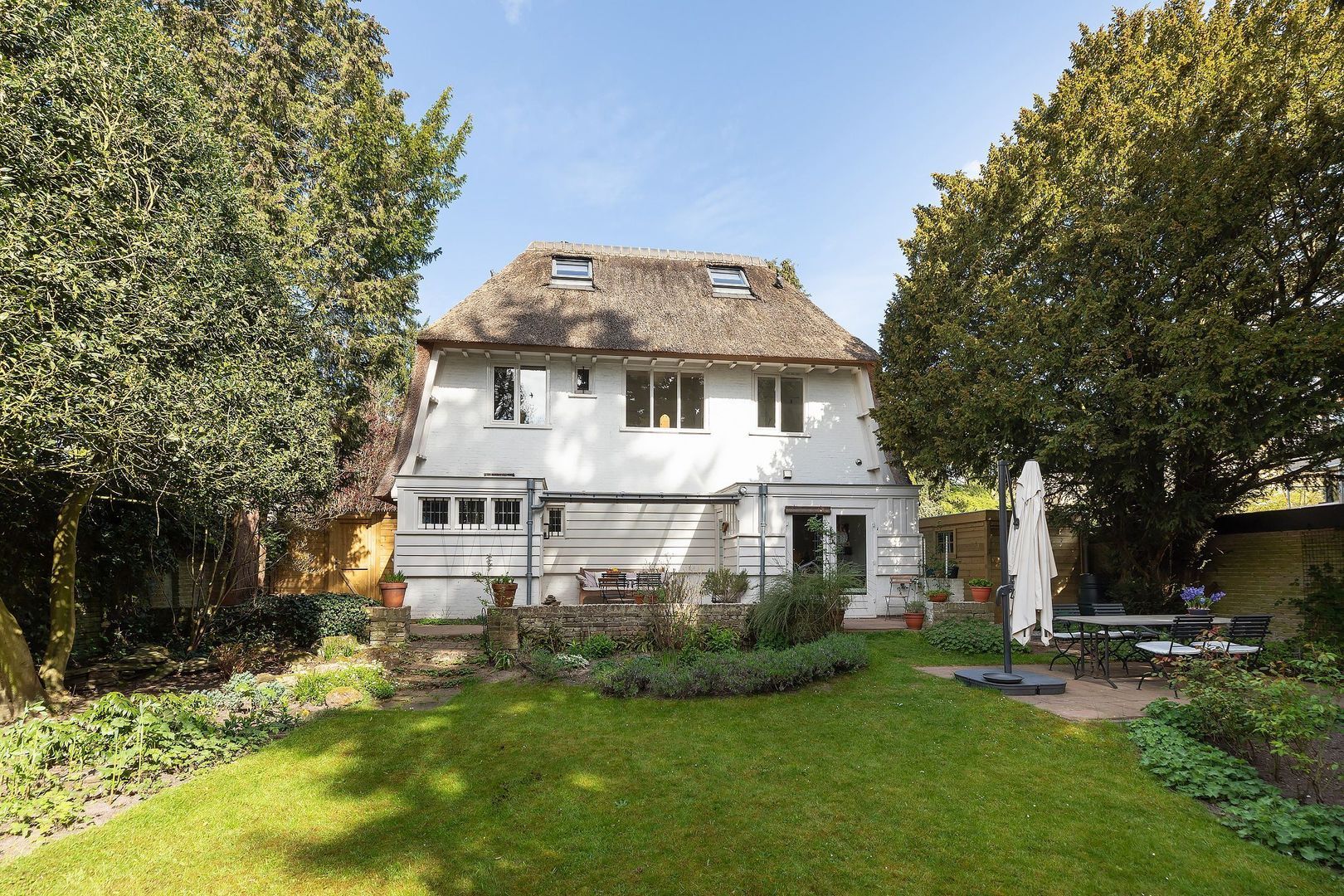 Stijlvolle, gerenoveerde, rietgedekte villa met 188 m² woonruimte, besloten, 18 meter diepe, achtertuin op het zuiden met veranda, meerdere terrassen en royale voortuin, grote oprit met laadpaal en alle ruimte voor 2 auto’s. Binnen wordt de bijzondere sfeer onder meer bepaald door eiken en hardstenen vloeren, vlak gestucte wanden en plafonds, paneeldeuren met architraven en neuten en het authentieke trappenhuis met 2 bordessen.