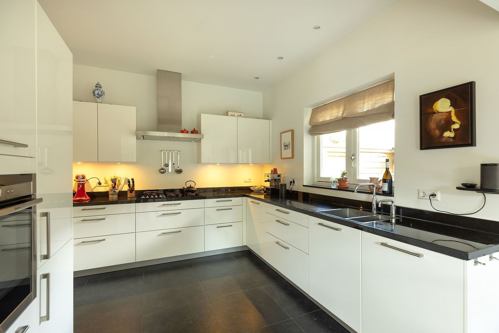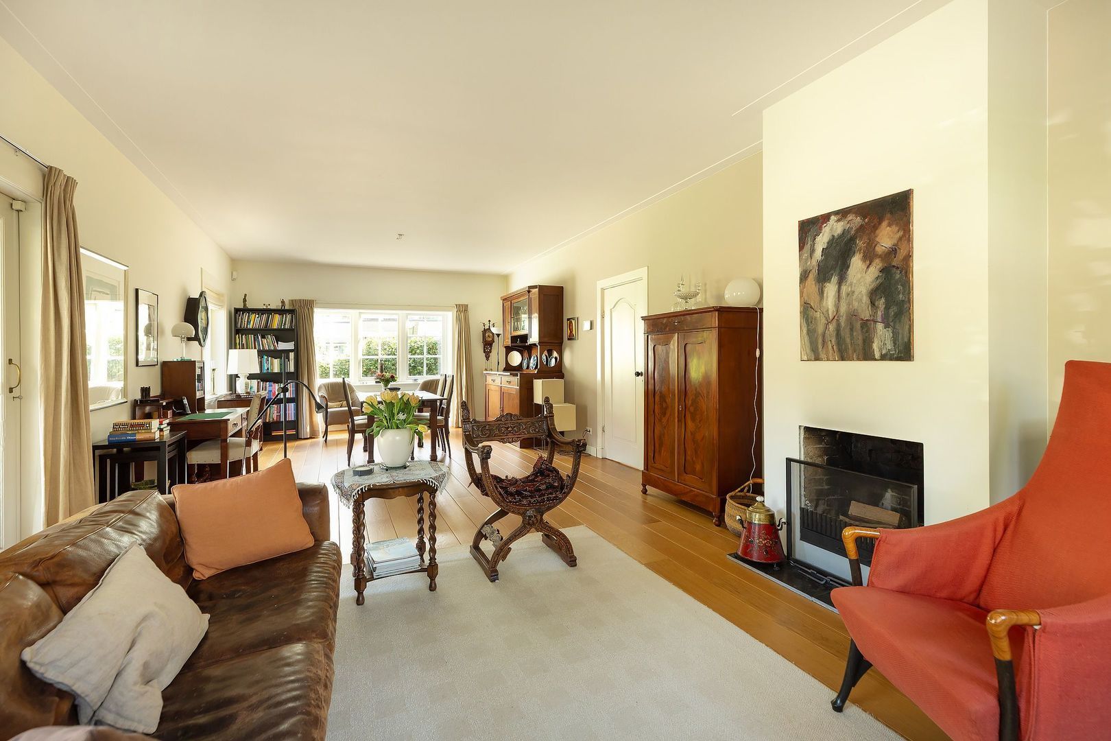 Overdekte entree, royale hal v.v. eiken parket, garderoberuimte v.v. hardstenen vloertegels, modern toilet v.v. wandcloset en fontein, fraai trappenhuis met bordestrap, deur naar m.k. en stahoge wijn-/provisiekelder met koekoek, ruime, sfeervolle en lichte woonkamer v.v. eiken parket, paneeldeuren, ramen met roeden verdeling, open haard en schuifdeur naar loggiaterras, luxe woonkeuken (2015) v.v. granieten blad, inbouwapparatuur; 90 cm brede gaskookplaat, RVS afzuigschouw (NOVY), vaatwasser (MIELE) oven/grill (NEFF) koelkast/vriezer LIEBHERR, hardstenen vloertegels v.v. vloerverwarming (via CV), eetkamer-gedeelte, deur naar veranda en openslaande deuren naar de achtertuin. Vanuit de veranda: deur naar inpandige berging.