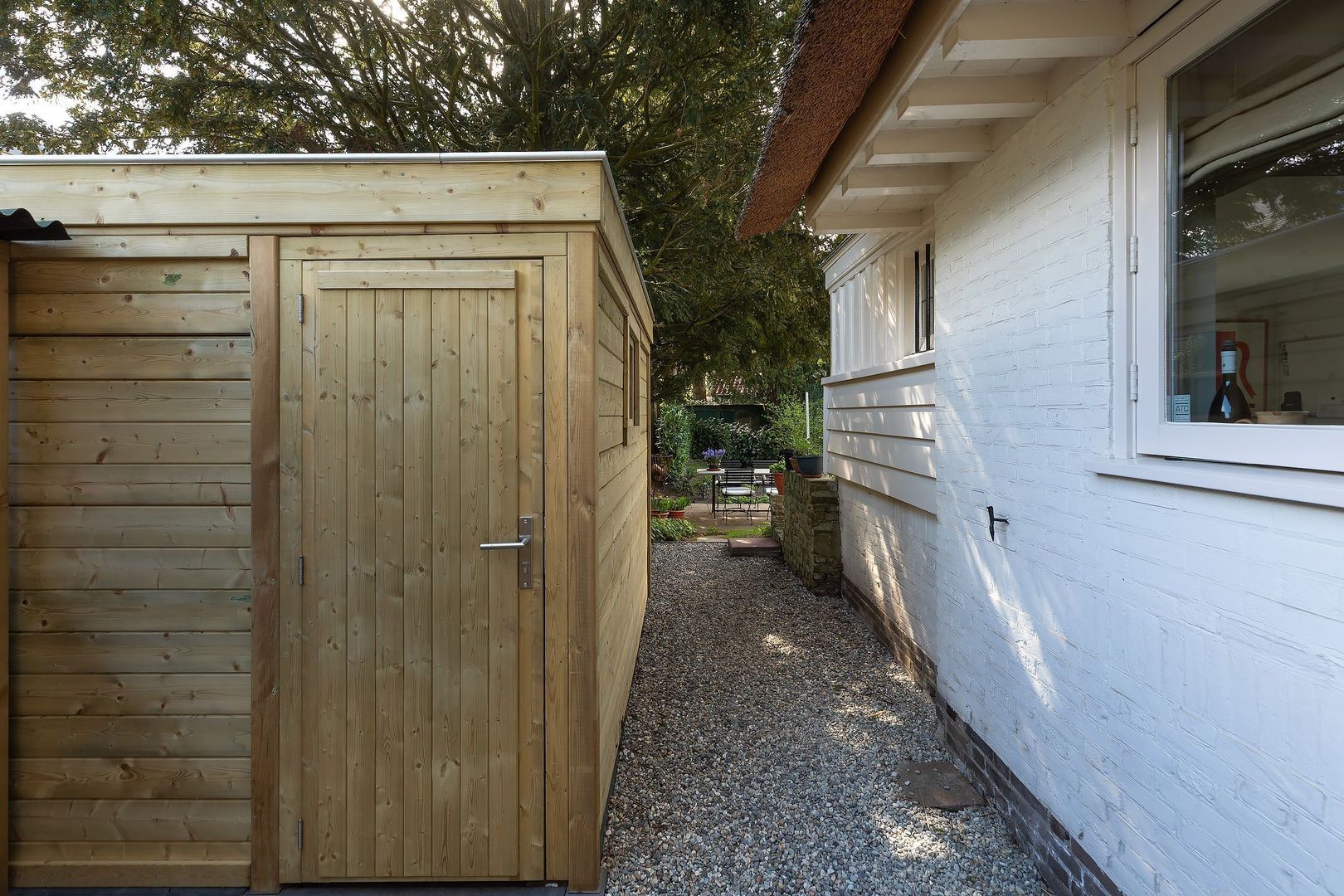 De rieten kap is uitgevoerd als schroefdak, dus geen hogere kosten van de opstalverzekering.