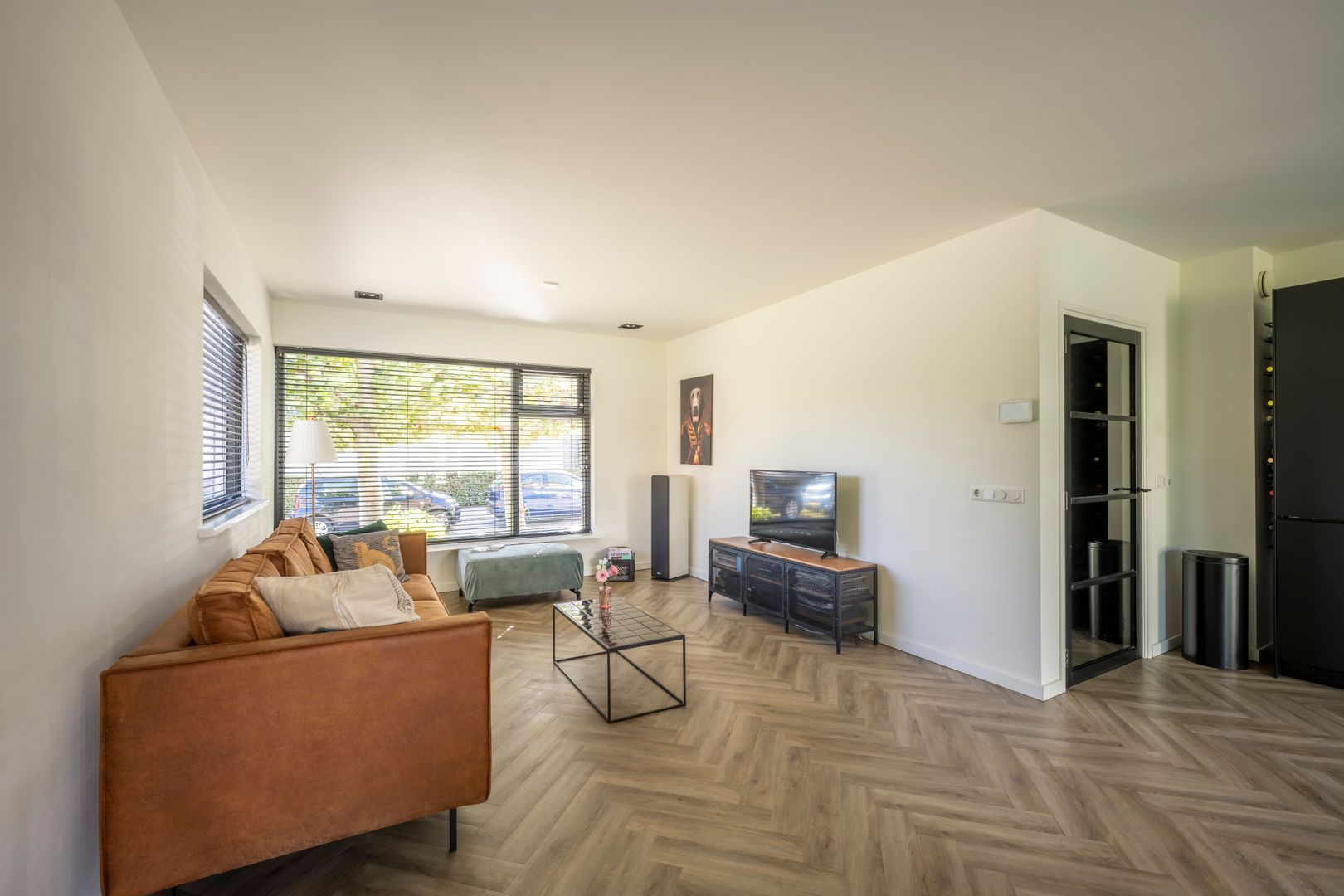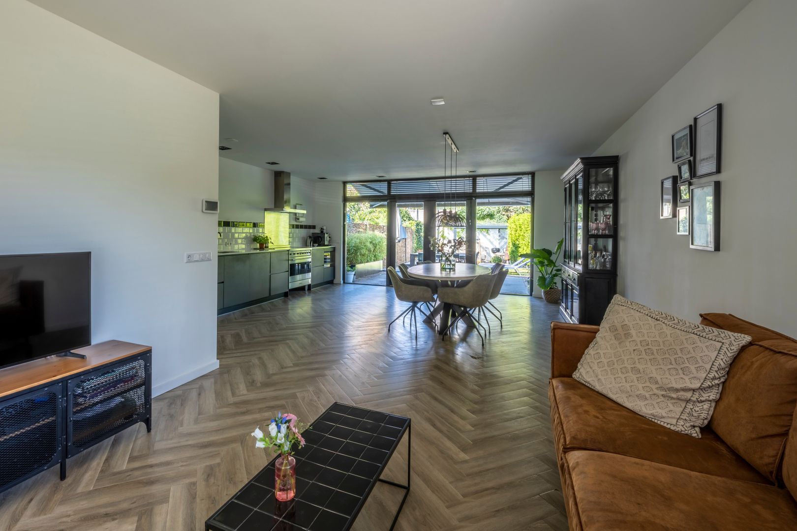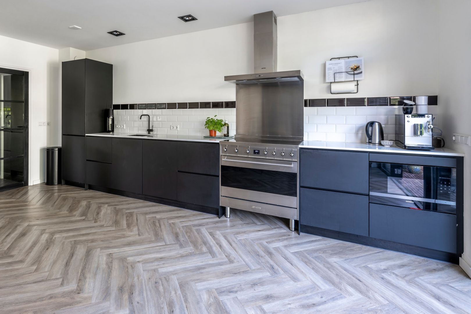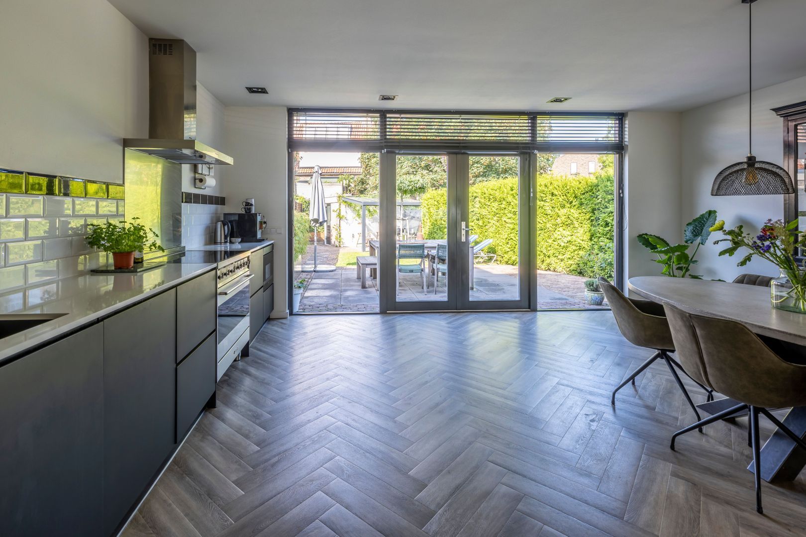 Entree, hal, trapkast met vernieuwde groepenkast, vrij hangend toilet, uitgebouwde woon- eetkamer, stucplafond met inbouwspots en openslaande deuren naar de achtertuin, luxe open keuken (2019) met Smeg inductiekooplaat en oven, afzuigkap, koelkast, vriezer en magnetron. De gehele begane grond vloer is aan de onderzijde geïsoleerd v.v. vloerverwarming met PVC vloerafwerking.