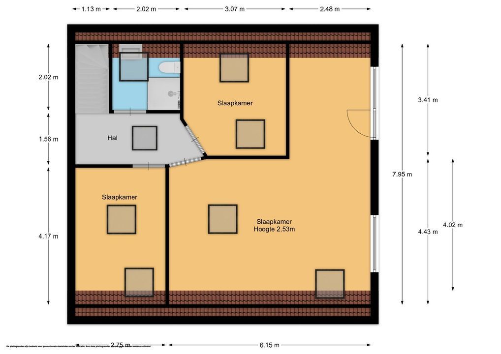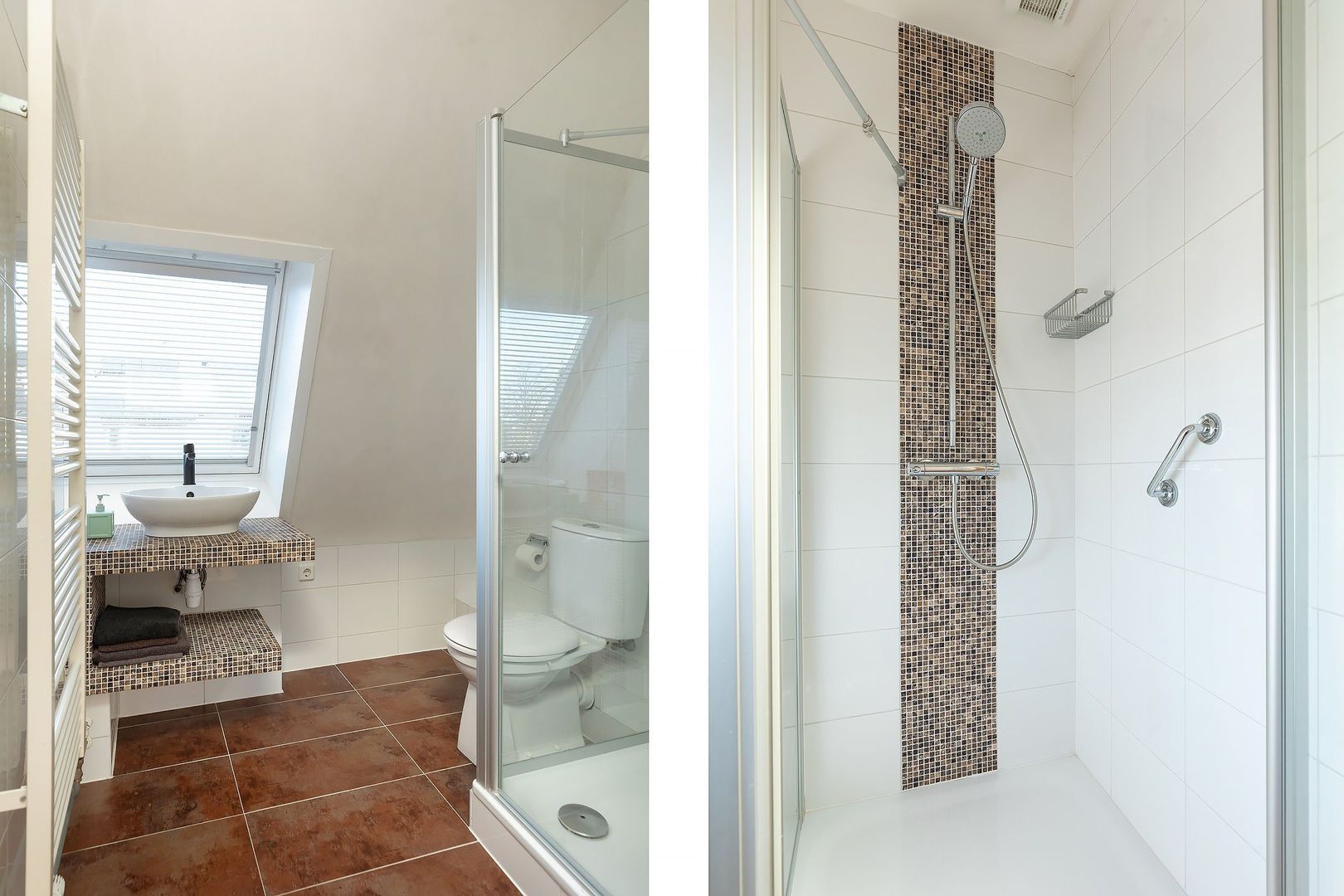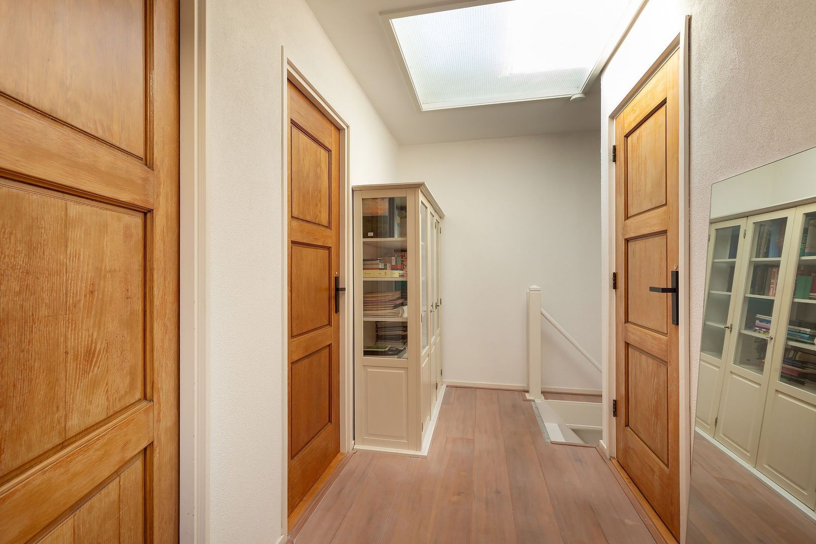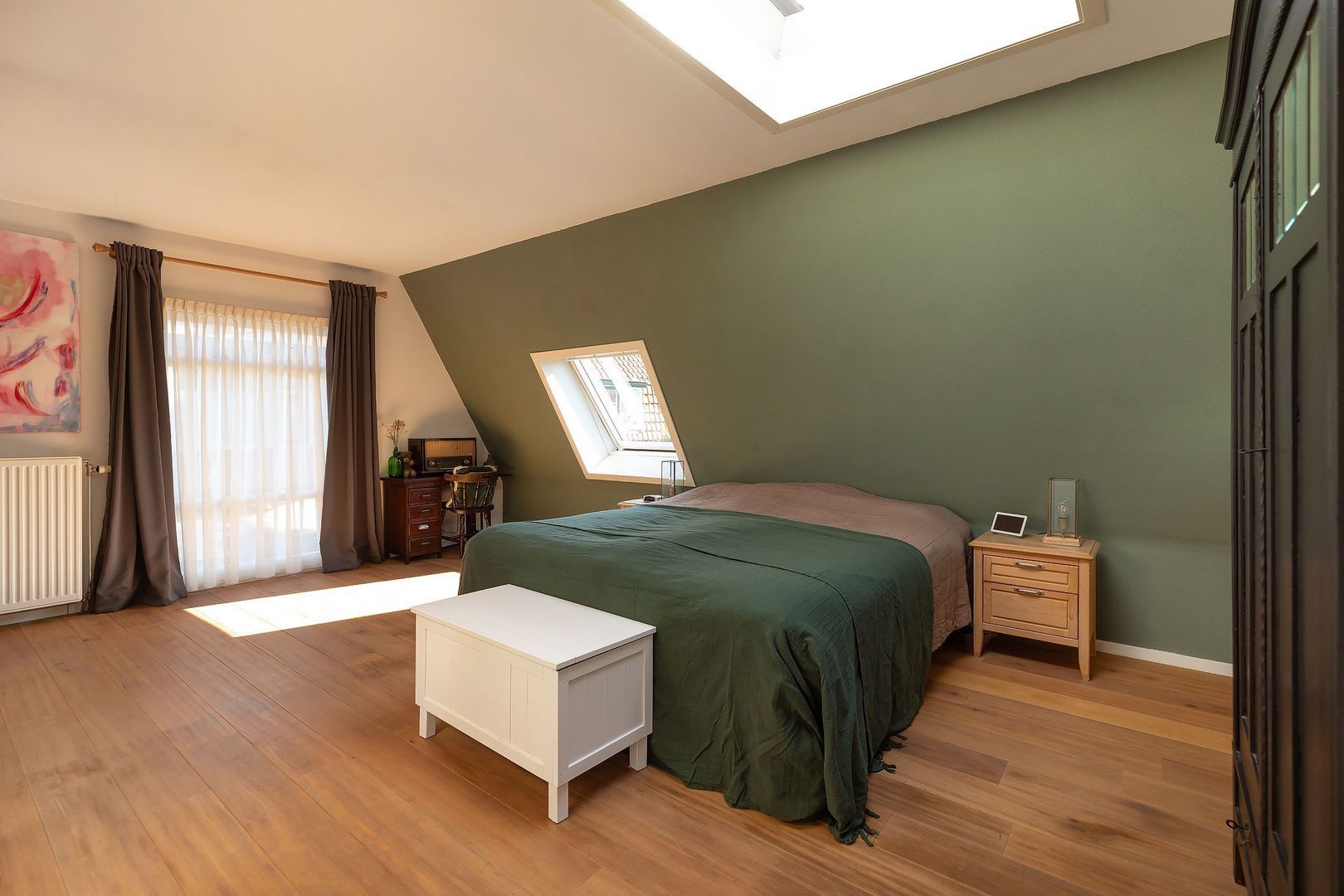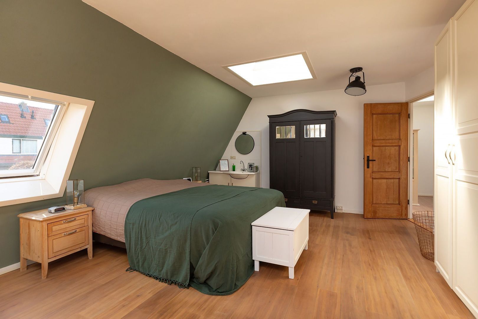 Overloop, slaapkamer aan de voorzijde. Tweede badkamer voorzien van douche, 3e toilet en wastafel. 2e slaapkamer aan de achterzijde en een riante hoofdslaapkamer aan de rechterzijde met kastenhoek. Dankzij de dakramen is deze verdieping opvallend licht.