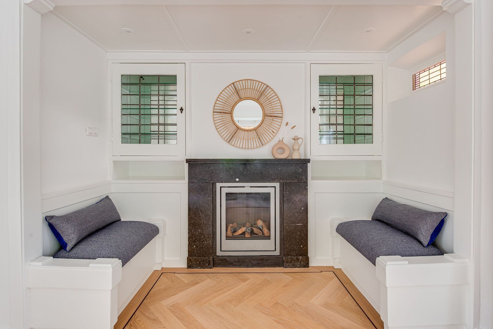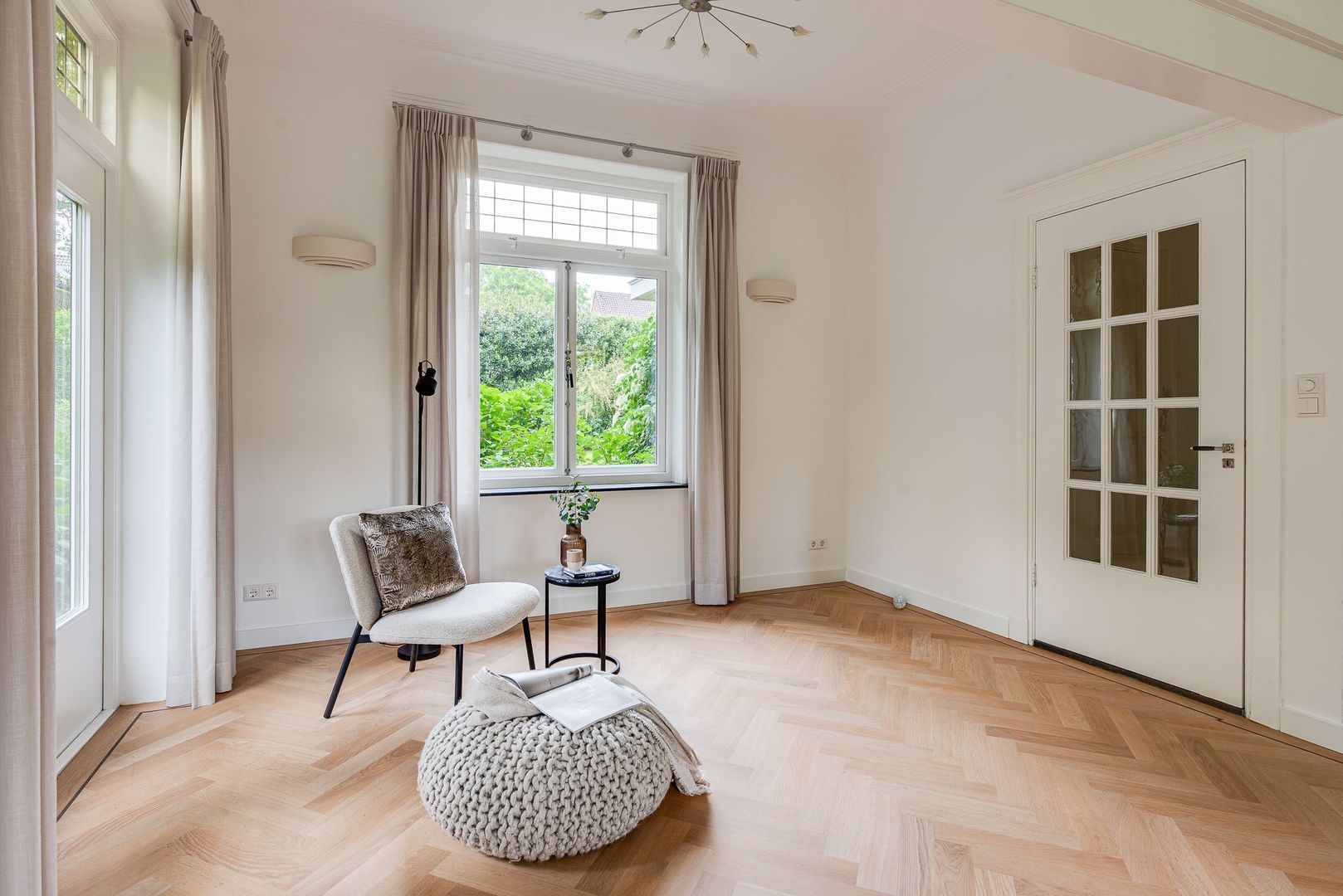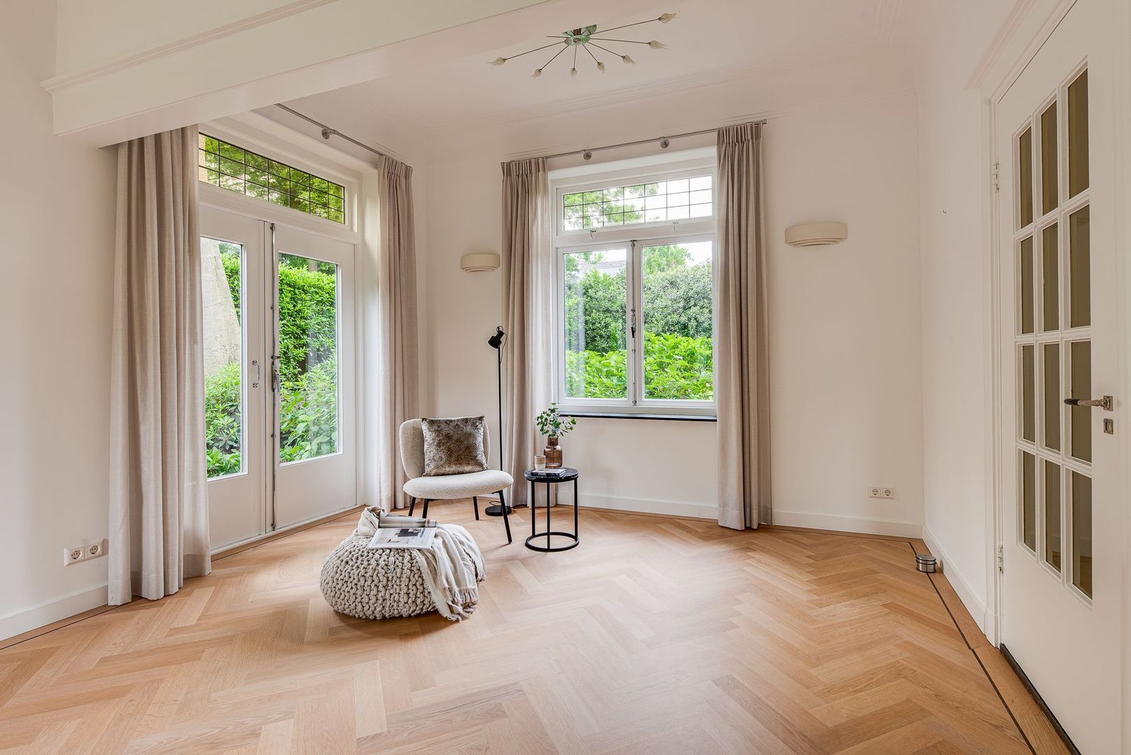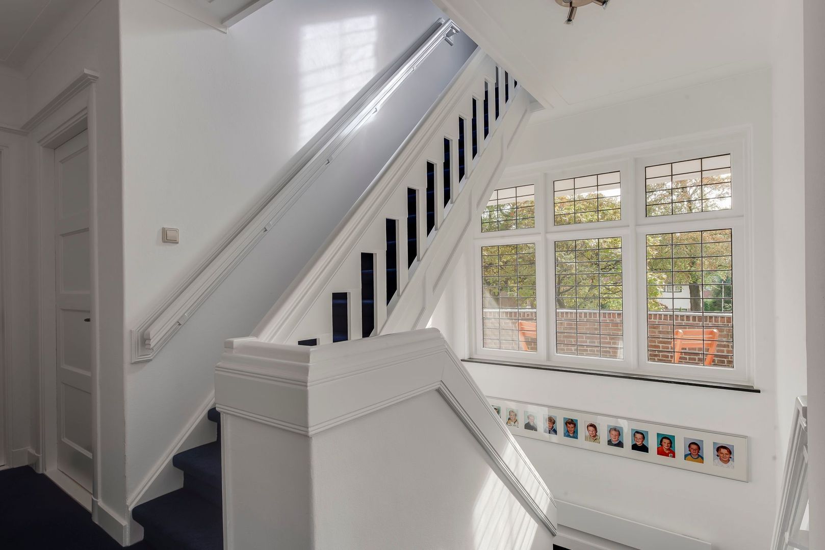 Brede paneeldeuren, architraven, ruim 3 m hoge plafonds met plint, glas-in-loodramen en het fraaie houten trappenhuis met bordes, bepalen nog steeds de bijzondere sfeer van deze rijk gedetailleerde 30-er jaren villa. Deze klassieke elementen combineren erg mooi met de vlak gestucte wanden, de moderne keuken en modern sanitair.