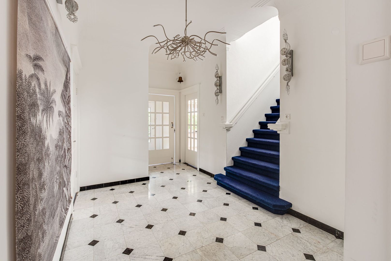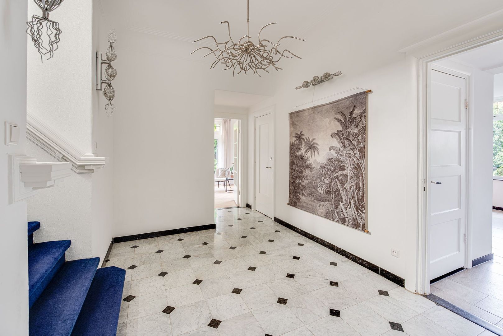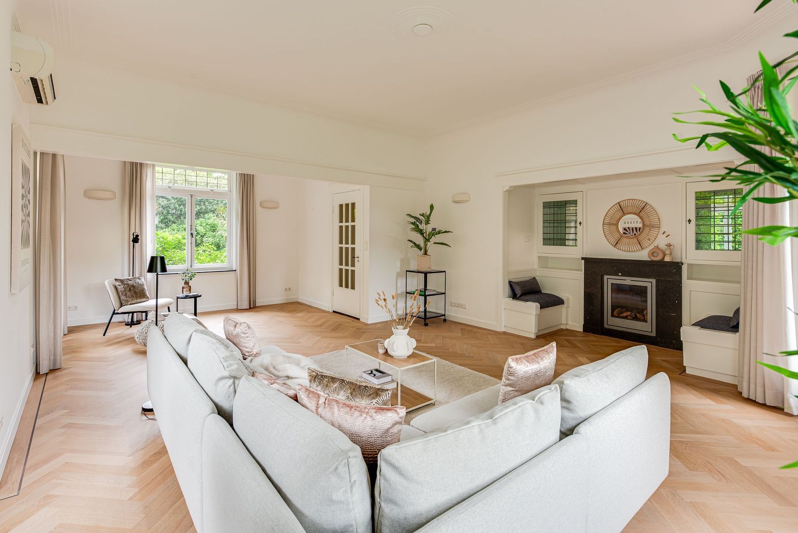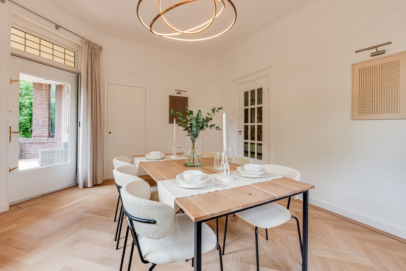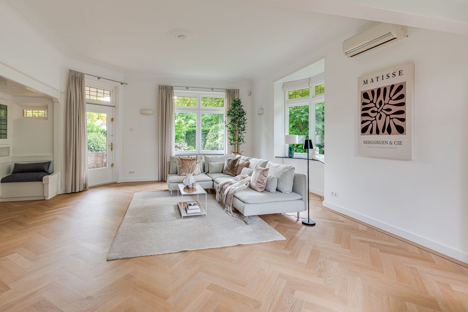 Brede paneeldeuren, architraven, ruim 3 m hoge plafonds met plint, glas-in-loodramen en het fraaie houten trappenhuis met bordes, bepalen nog steeds de bijzondere sfeer van deze rijk gedetailleerde 30-er jaren villa. Deze klassieke elementen combineren erg mooi met de vlak gestucte wanden, de moderne keuken en modern sanitair.