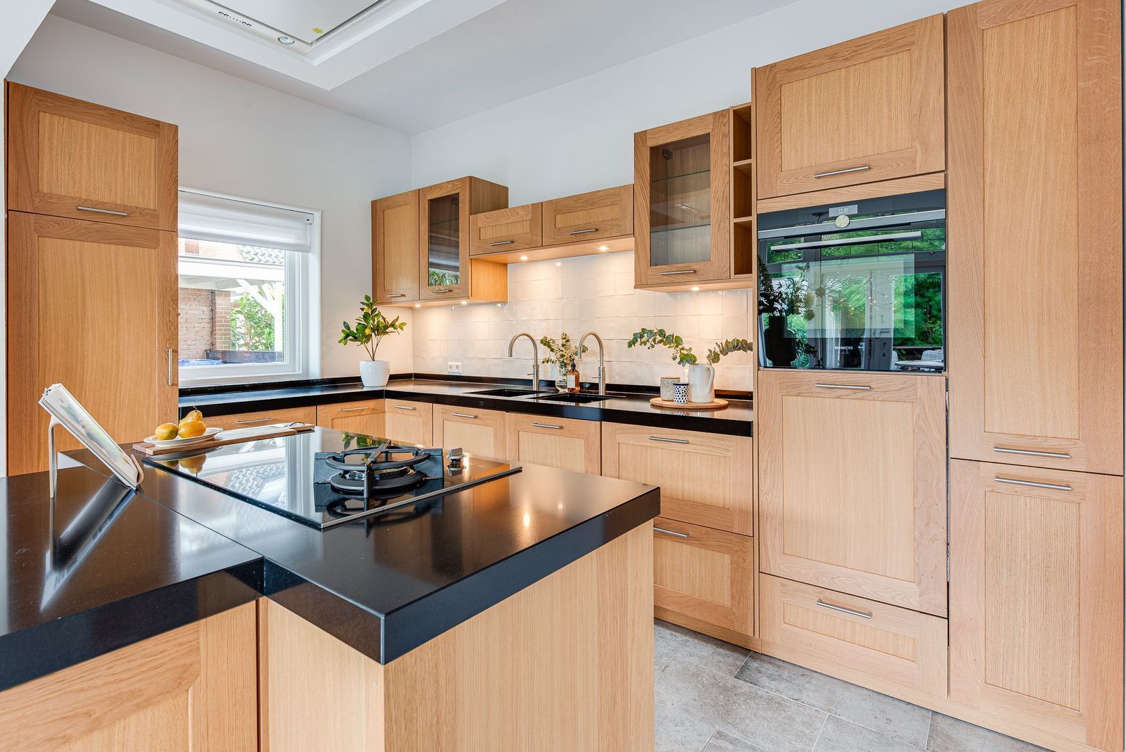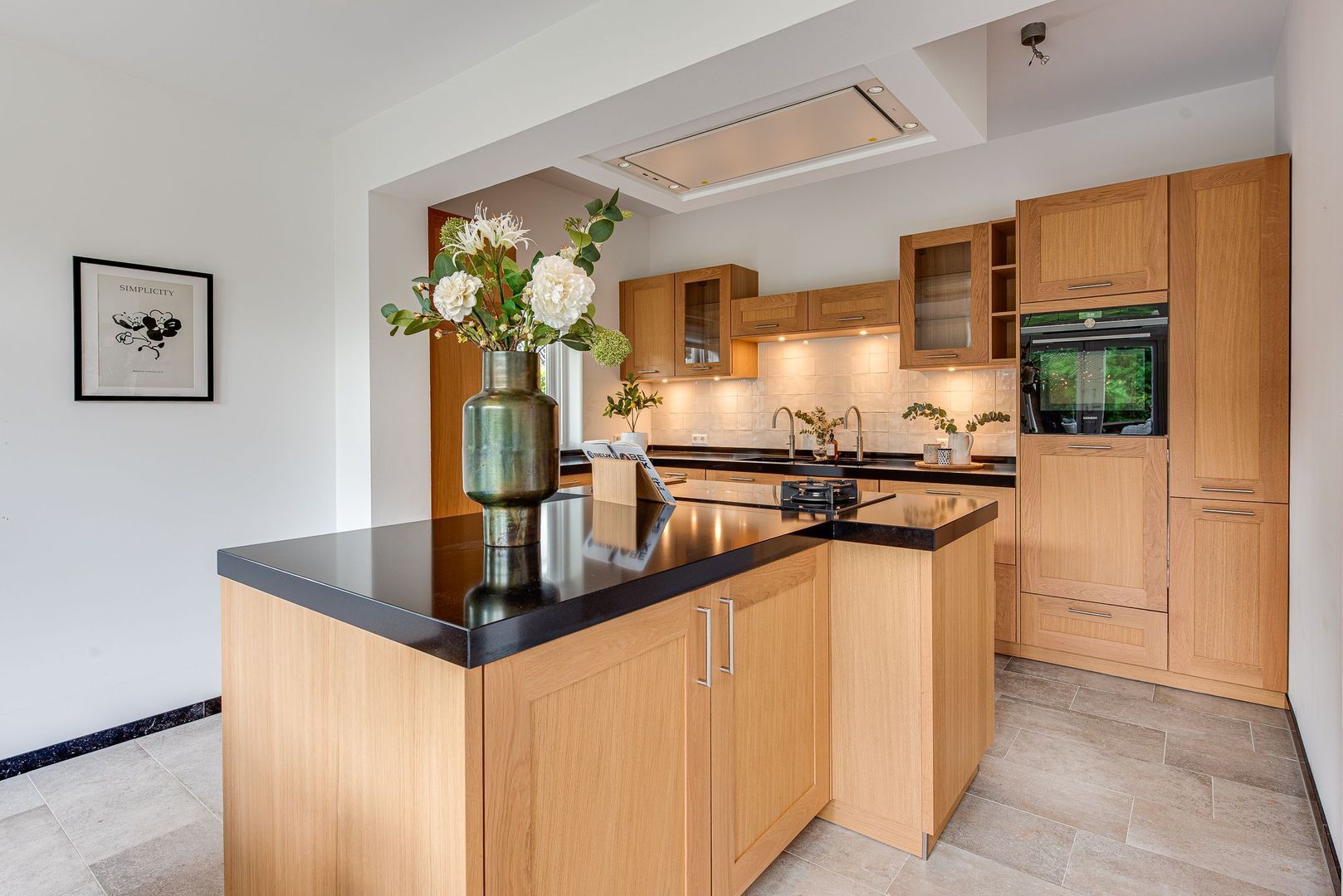 Overdekt entree, vestibule, m.k., ruime, centrale hal v.v. marmeren vloer, modern toilet v.v. wandcloset en fontein, zeer royale, lichte woonkamer v.v. airconditioning, massief eiken parket (visgraat met band en bies), erker, gashaard met marmeren schouw en sfeervolle monumentale “haardzit” met ingebouwde kastjes, glas-in-loodramen en deur naar loggia-terras, werk-/televisie-/studeerkamer met eveneens deur naar loggiaterras, moderne, licht-eiken woon-/eetkeuken v.v. travertin-vloer, kookeiland, natuurstenen blad, complete inbouwapparatuur, afzuigkap in plafond en openslaande deuren naar terras, technische ruimte met boiler 2 gekoppelde Atag CV-ketels, trap naar de kelder, bijkeuken met kastenwand en aansluiting wasmachine-/droger.