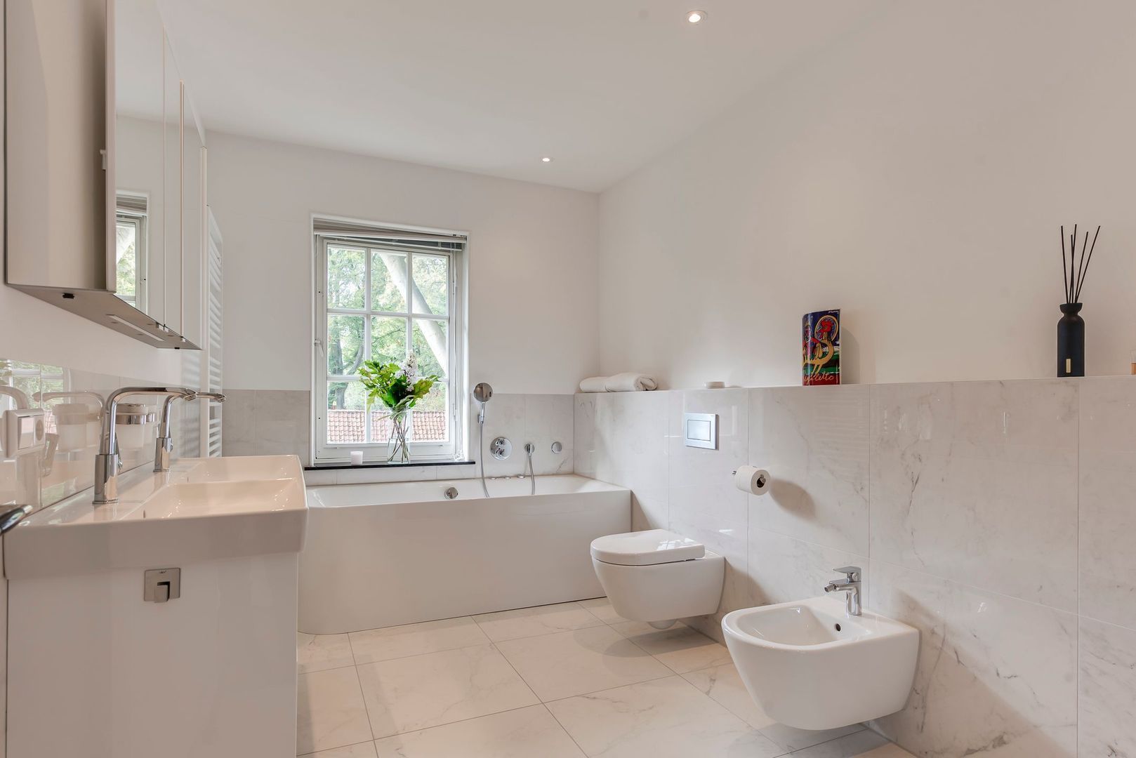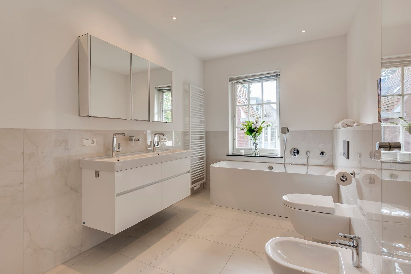 Fraai trappenhuis met brede trap en bordes naar 1e verdieping, overloop, hoofdslaapkamer v.v. airconditioning met kastenwand, deur naar balkonterras, aangrenzende moderne badkamer v.v. dubbel wastafelmeubel, spiegelkast, wandcloset, bidet, whirlpool, douche en in-loop-kast, 2e slaapkamer, in gebruik als 2e werkkamer met bibliotheek, met eveneens deur naar balkonterras, 3e slaapkamer met 3 vaste kasten, moderne, luxe 2e badkamer met douche, wastafel en wandcloset.