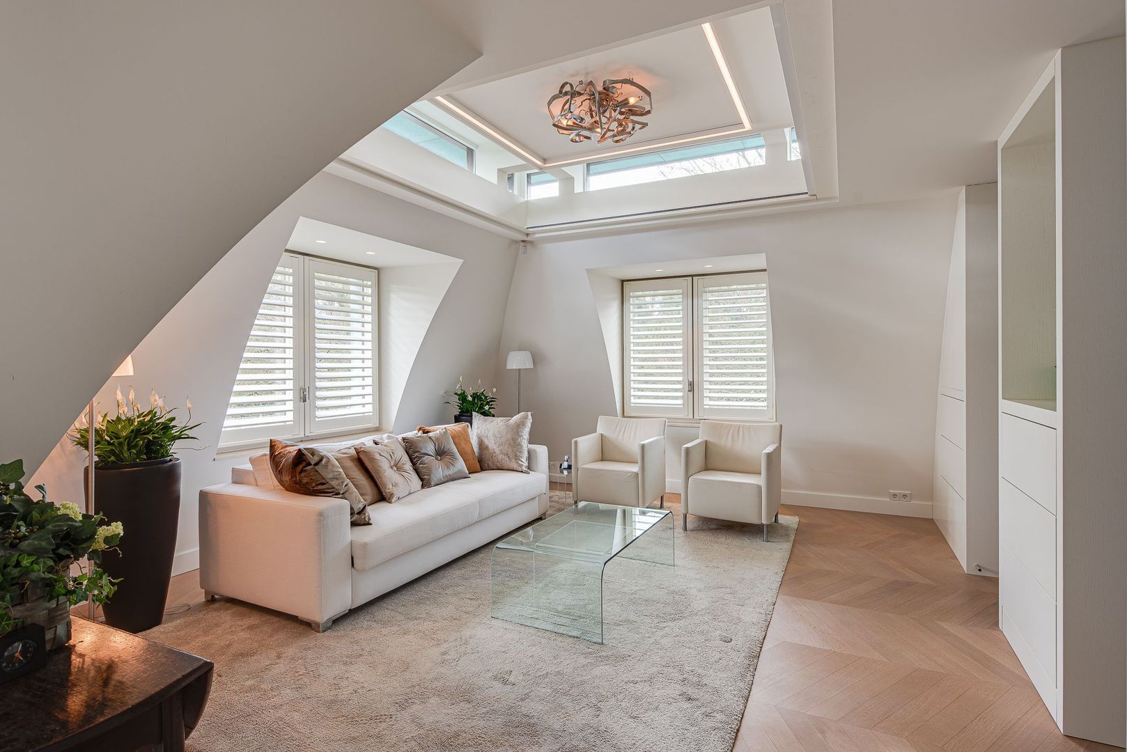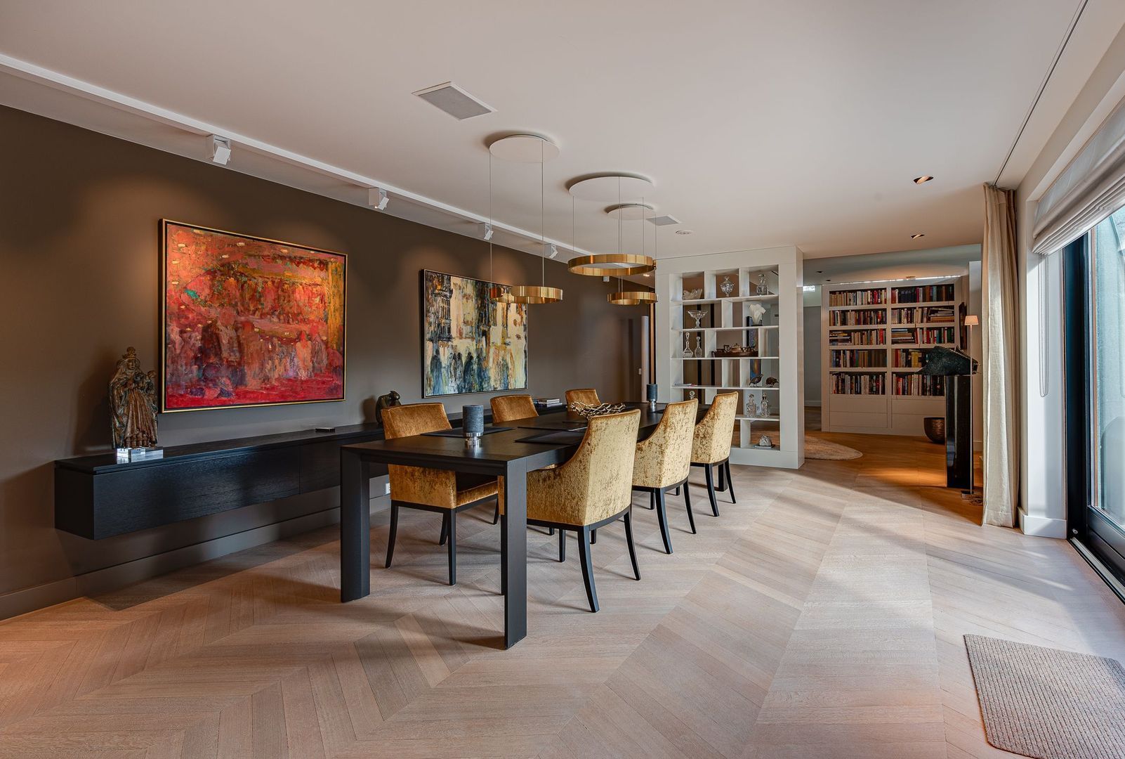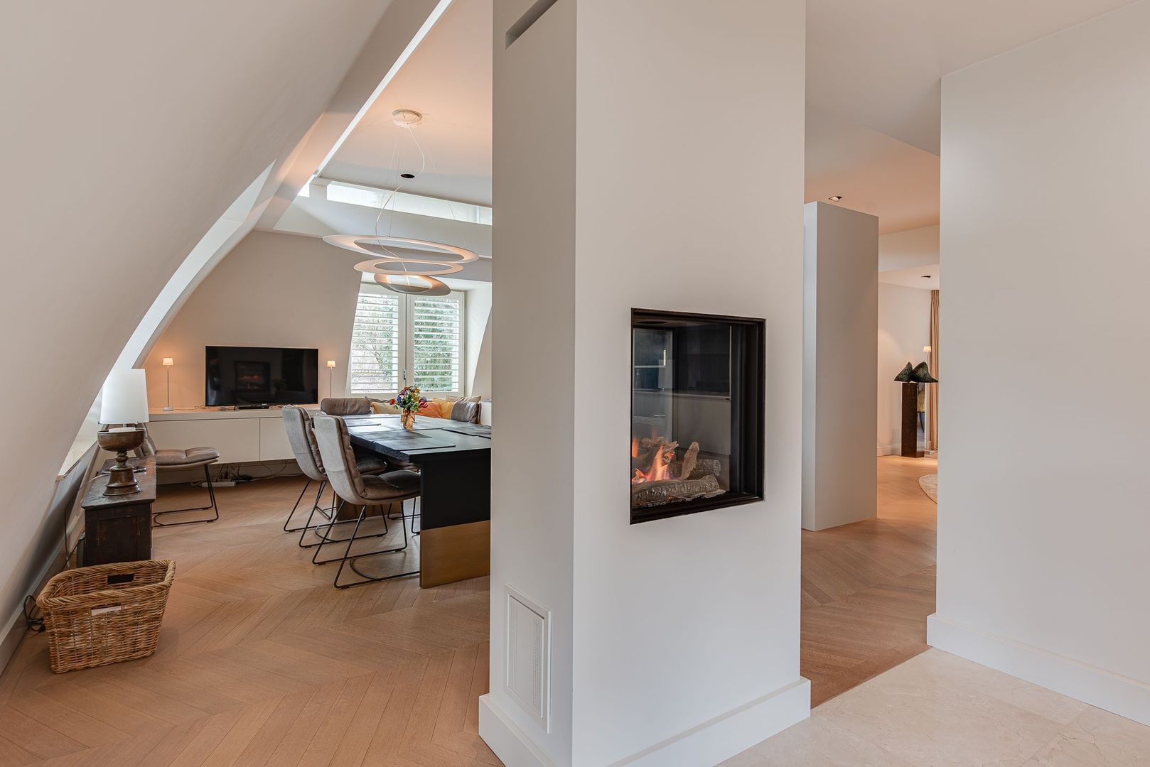 Bij binnenkomst valt direct de rondom doorlopende raamstrook op, net onder plafondniveau, die zorgt voor een prachtige lichtinval en een bijzondere sfeer. De royale daglichttoetreding versterkt het gevoel van ruimte. De afwerking is van uitzonderlijk hoog niveau, met fraaie eiken- en marmeren vloeren, voorzien van vloerverwarming. Verder beschikt het penthouse over een uitgebreid domoticasysteem, airconditioning, een geavanceerde beveiligingsinstallatie en uitstekende geluidsisolatie dankzij ankerloze spouwmuren en zwevende dekvloeren.