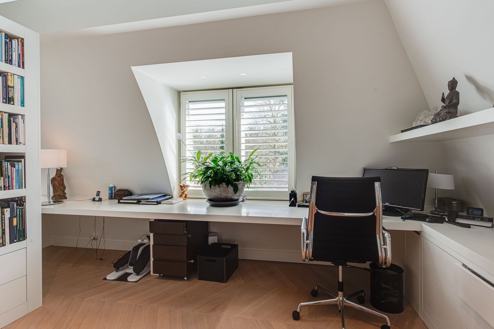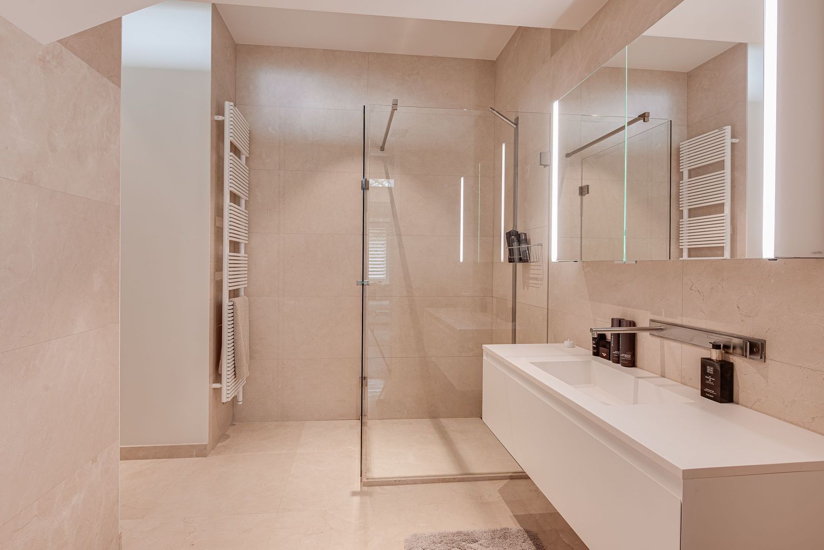 De moderne, uitgebreide Miele-keuken beschikt over een vaste kastenwand, een spoeleiland, complete inbouwapparatuur en een verrassend weggewerkte televisie, geïntegreerd in de glazen achterwand van het aanrecht. Vanuit de hal is het toilet bereikbaar, voorzien van wandcloset en fontein. De royale hoofdslaapkamer heeft een aangrenzende kastenkamer en een ruime, in licht marmer uitgevoerde badkamer met inloopdouche, design-ligbad, dubbel wastafelmeubel en wandcloset. De tweede ruime slaapkamer grenst aan een eigen, eveneens in licht marmer uitgevoerde badkamer met inloopdouche, wastafelmeubel en wandcloset. Deze slaapkamer loopt door in een extra ruimte die gebruikt kan worden als werk-, hobby- of logeerkamer.