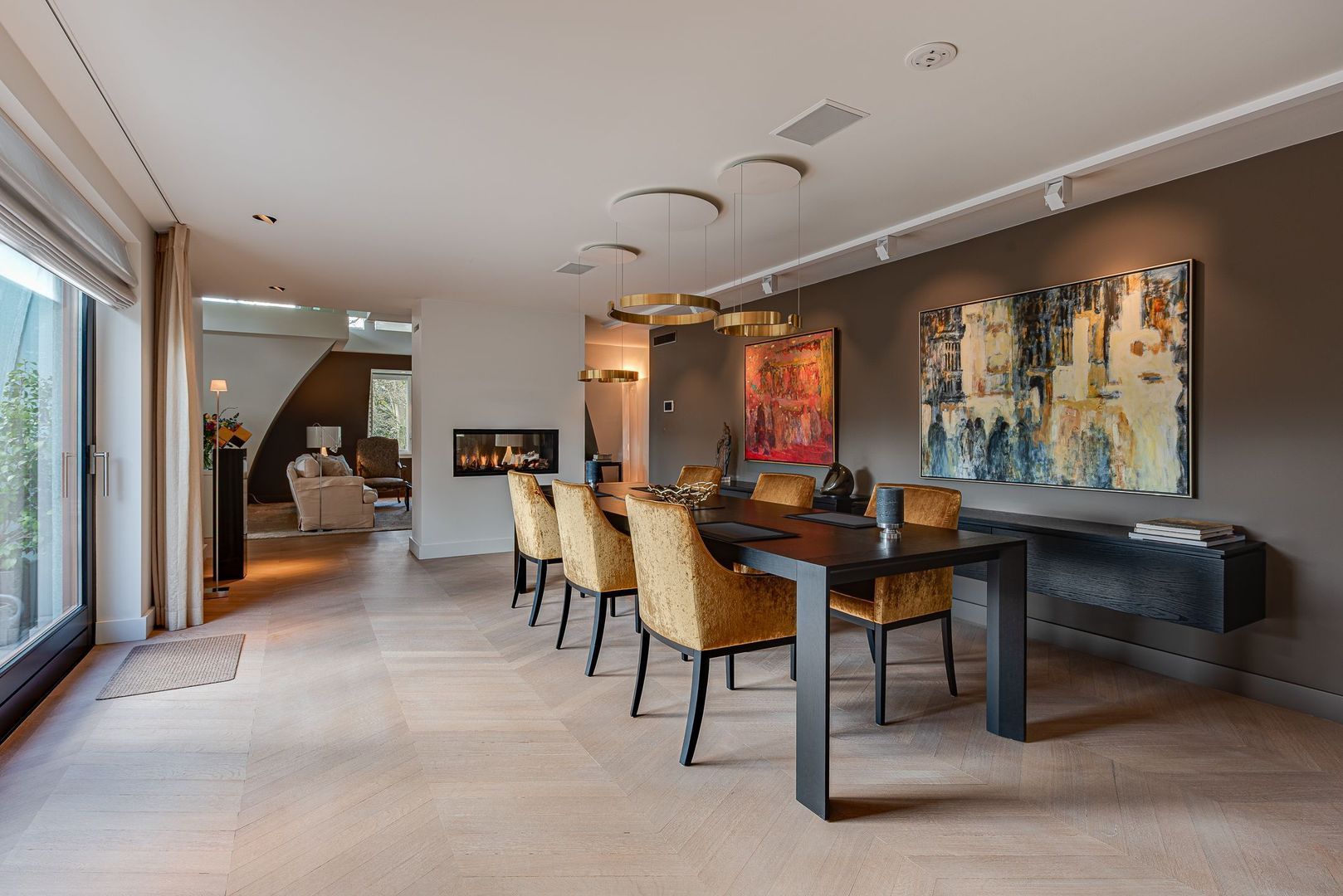 Entree via beveiligde privé-lifttoegang. Ruime ontvangsthal met garderobekast, gang voorzien van een bibliotheekwand en openslaande deuren naar de royale living. Deze is visueel verdeeld in zitkamer, eetkamer en ontbijtkamer, met open verbindingen en transparante overgangen tussen de ruimtes. Een tweezijdige gashaard vormt de scheiding tussen zit- en eetkamer, terwijl een roomdivider de eetkamer van de ontbijtkamer afscheidt. Vanuit de eetkamer biedt een hardhouten schuifpui toegang tot het inpandige terras (middagzon). Tussen de keuken en ontbijtkamer bevindt zich een tweede tweezijdige gashaard. De ontbijtkamer staat via een brede doorgang in verbinding met de royale woon-/eetkeuken, voorzien van een hardhouten schuifpui naar een ruim tweede terras (ochtendzon). Aangrenzend aan het woongedeelte bevinden zich twee aparte werkruimtes, voorzien van op maat gemaakte bureaus en opberglades.