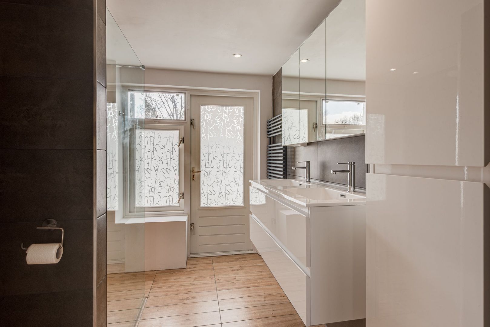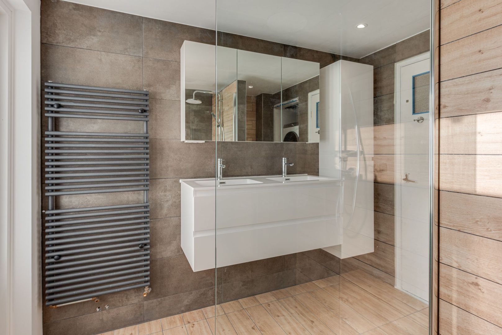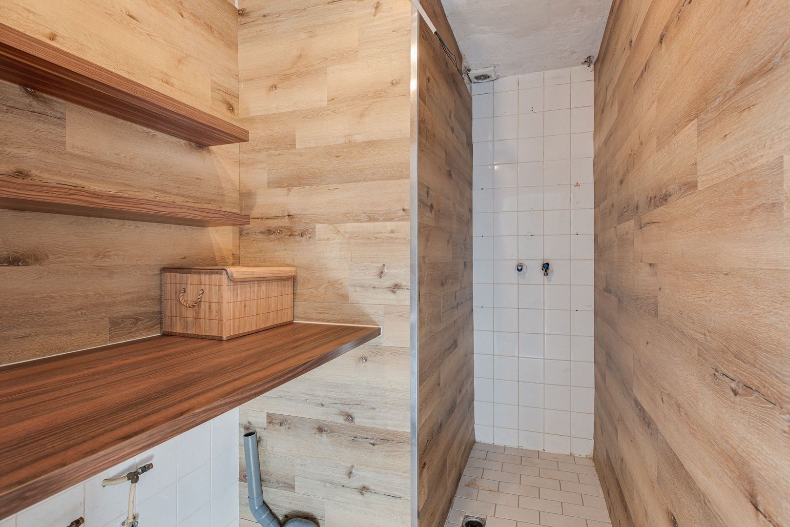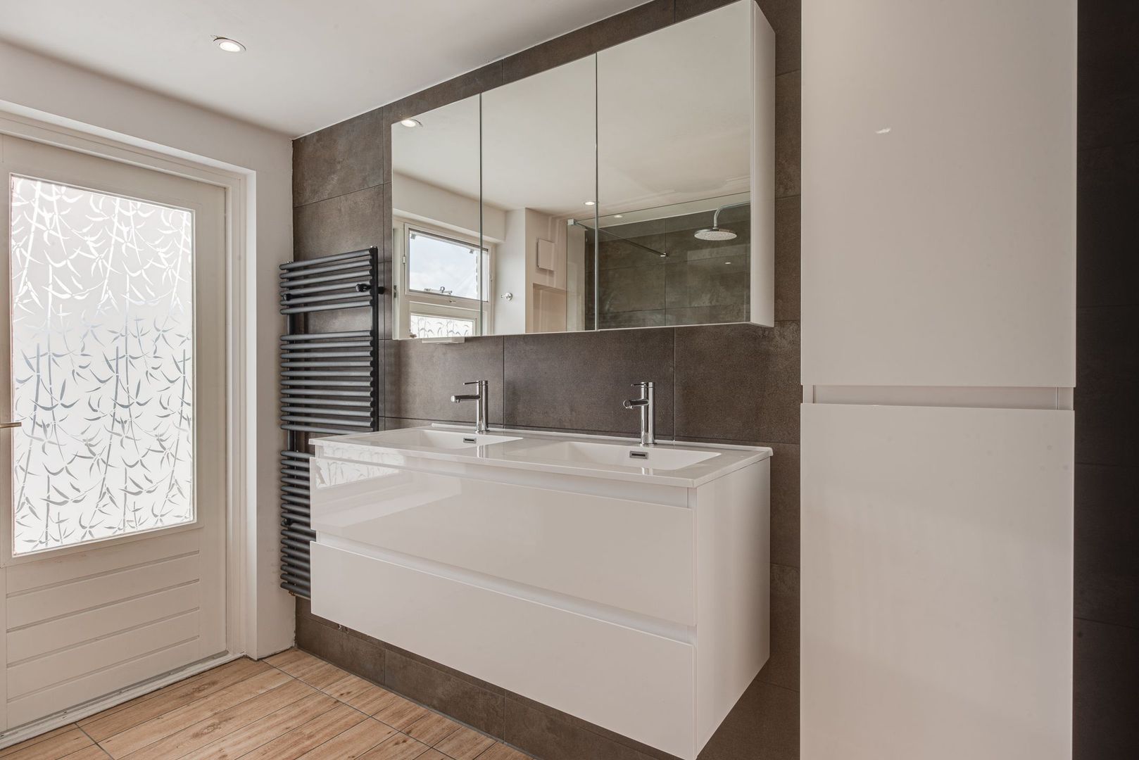 1e Verdieping: overloop, 2 slaapkamers met vaste kasten aan de voorzijde, ruime inloopkast, slaapkamer aan de achterzijde, vernieuwde badkamer (2023) met inloopdouche, toilet, dubbelle wastafel, wasmachine-/drogeraansluitingen en balkon. Mogelijkheid voor vaste trap naar zolder voor extra slaapkamer.
