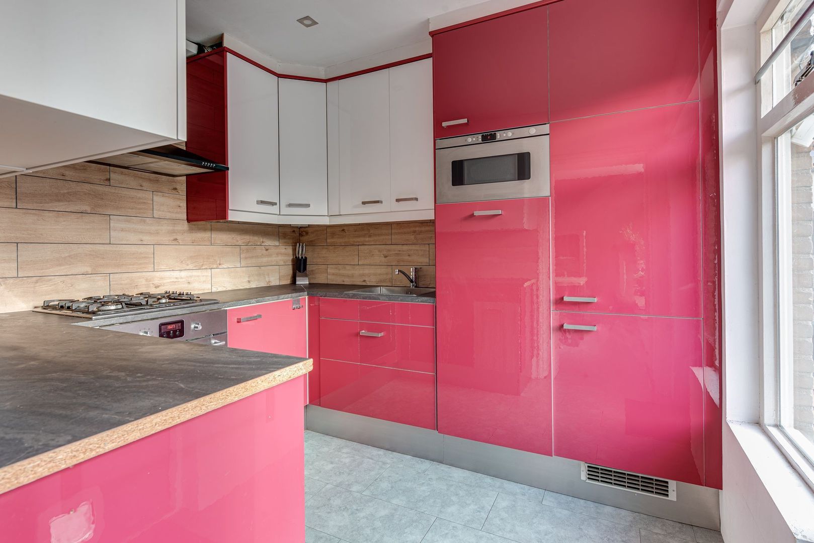 Entree, hal, meterkast, trapkast, modern vrij hangend toilet, woon-/eetkamer v.v. vloerverwarming, laminaatvloer, moderne keuken v.v. inbouwapparatuur ( 4 pits gasstel, afzuigkap, oven en vaatwasser). Toegang naar fraai aangelegde, diepe achtertuin met zonneterras (zuiden).