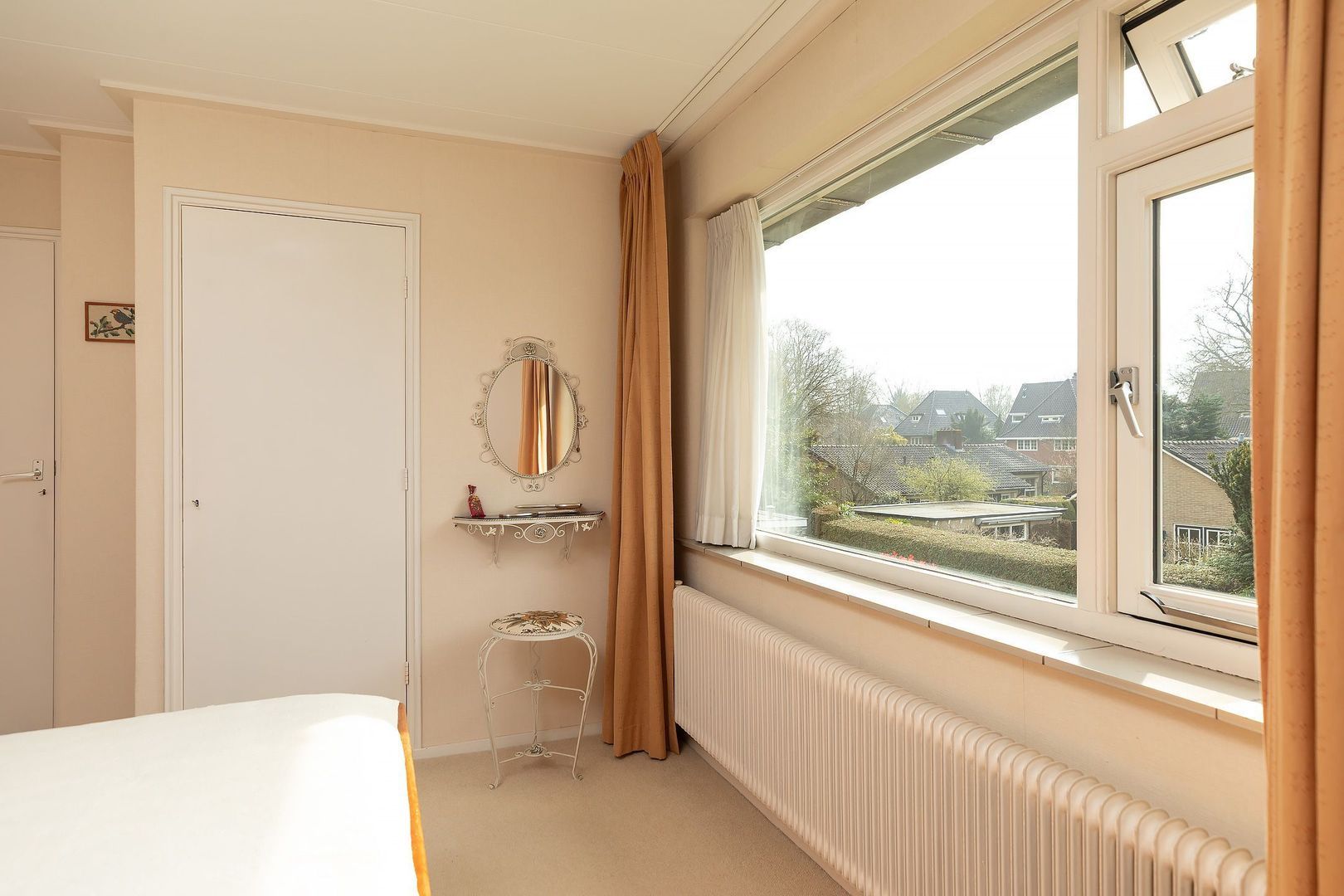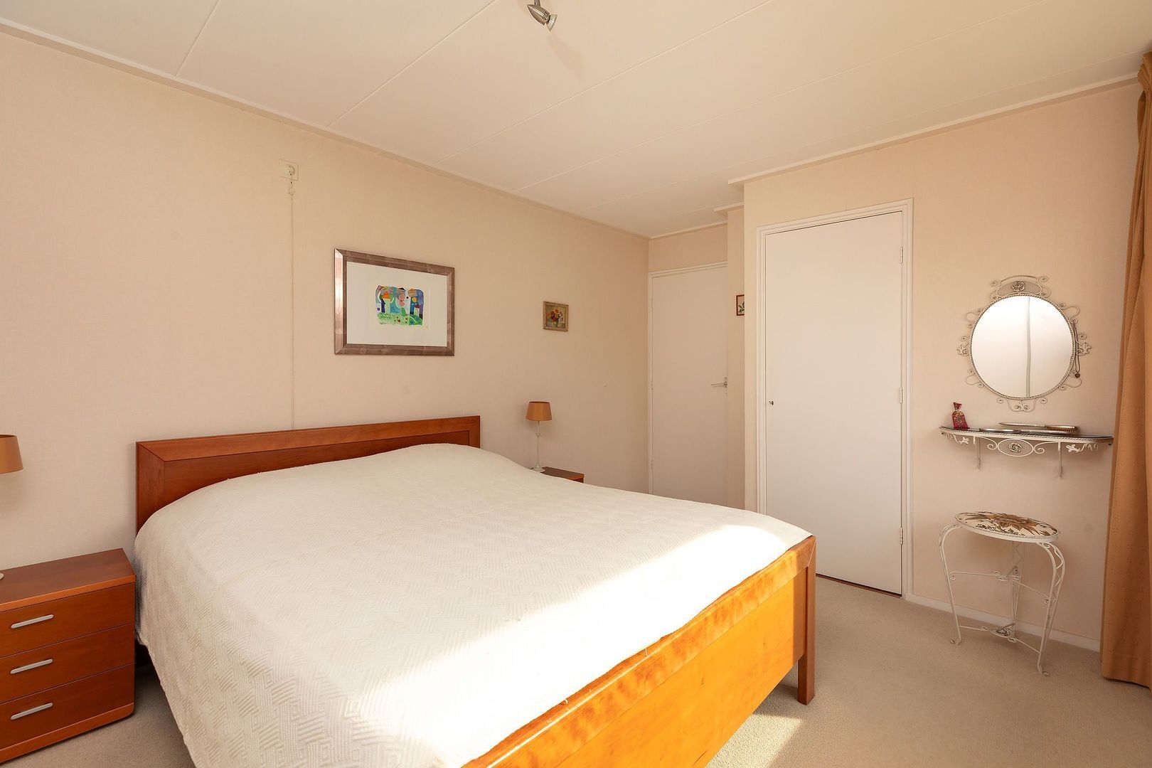 Ruime overloop, grote slaapkamer aan de voorzijde met twee inbouwkasten. Fijne badkamer met ligbad/douche, dubbele wastafel en 2e toilet. 2e ruime slaapkamer aan de achterzijde met vaste kastenwand en inbouwkast. 3e slaapkamer, eveneens aan de achterzijde, met inbouwkast.