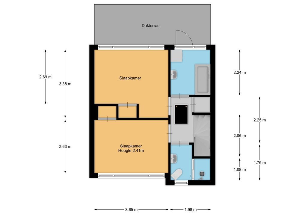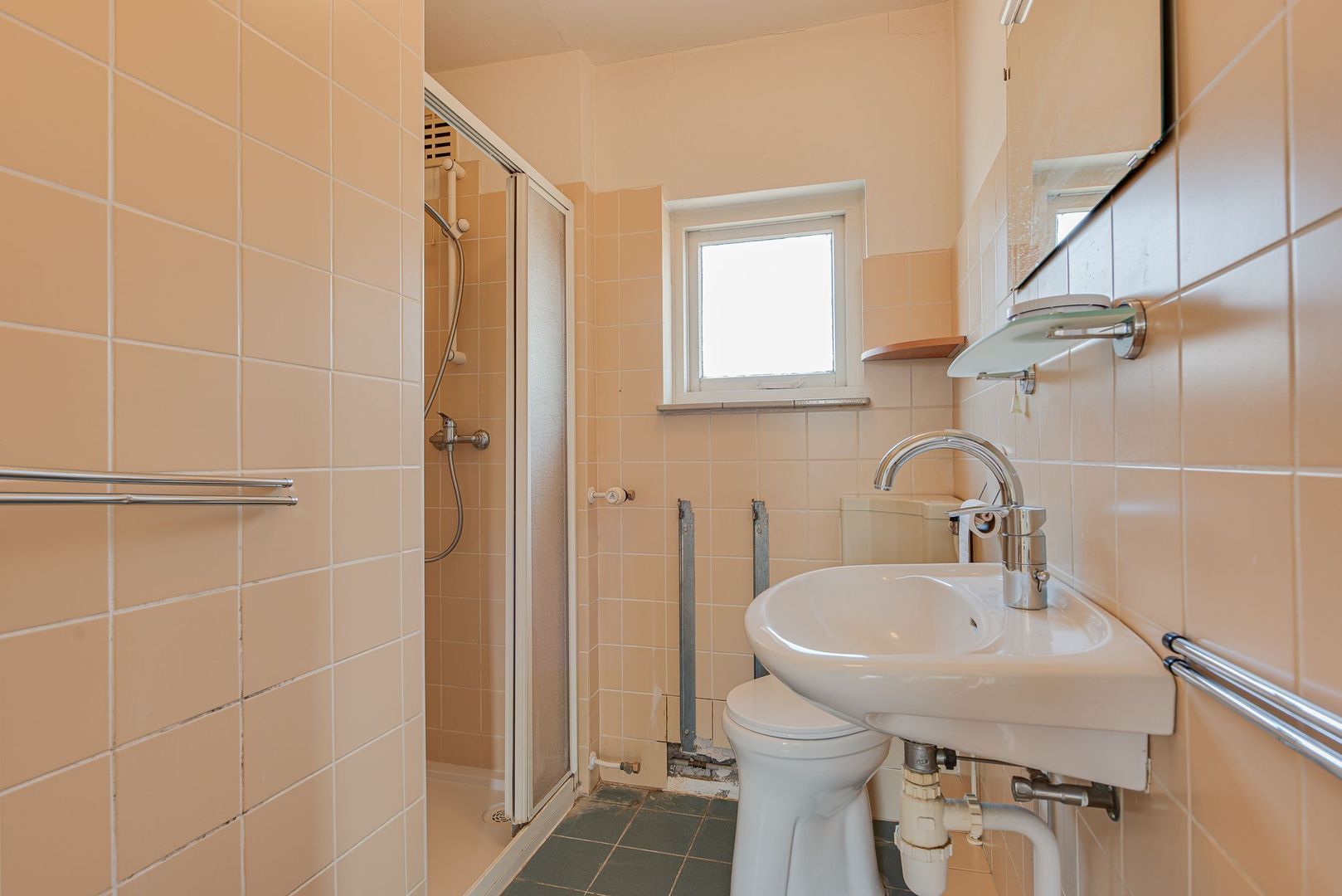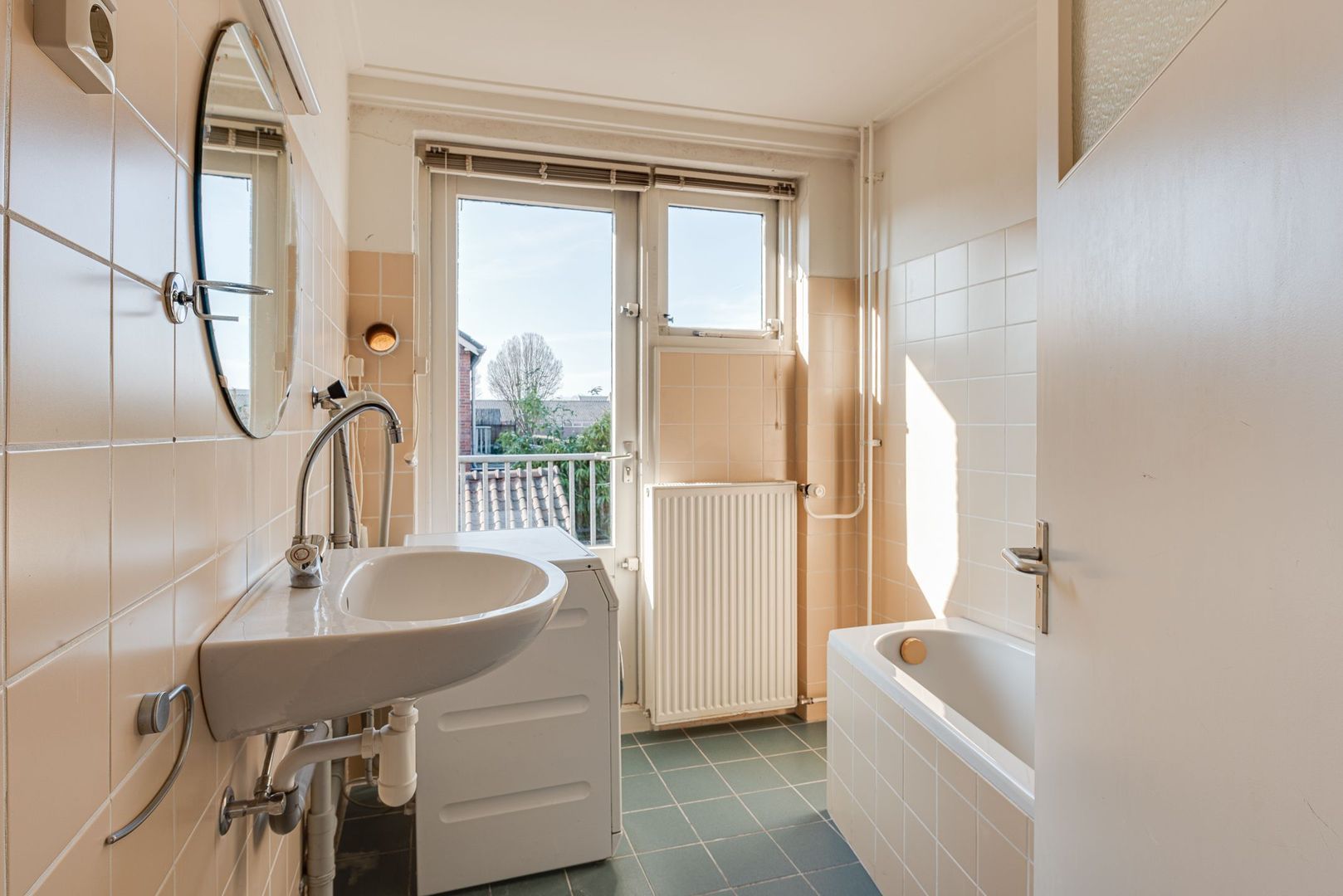 Overloop met vaste kast. De royale slaapkamer aan de voorzijde beschikt over een vaste kast en rolluik. De tweede ruime slaapkamer heeft eveneens een vaste kast en zonnewering. Daarnaast is er een badkamer met ligbad, wastafel, wasmachineaansluiting en toegang tot een groot balkon. De 3e slaapkamer is momenteel in gebruik als 2e badkamer met douche, wastafel en toilet.