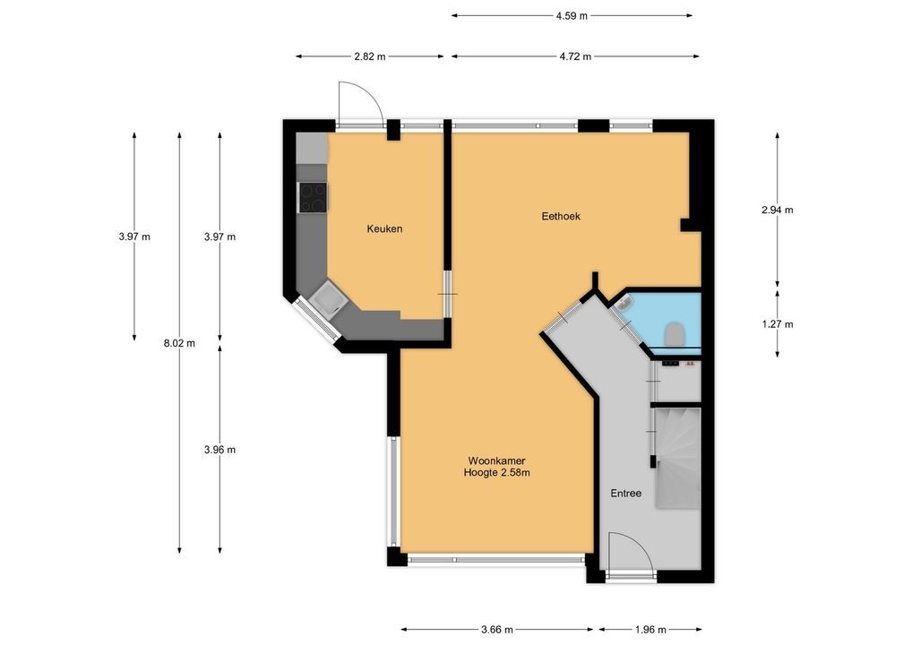 Entree met garderobe, trapopgang, trapkast, meterkast met moderne stoppen en toilet met fonteintje. De lichte woonkamer heeft een speelse indeling met een zitgedeelte aan de voorzijde en een royale eethoek aan de achterzijde. De uitgebreide keuken is voorzien van Pelgrim 4-pits gasfornuis, ATAG oven, Beko vaatwasser, koelkast, afzuigkap en spoelbak met uitzicht naar buiten. Vanuit de keuken is er directe toegang tot de achtertuin.