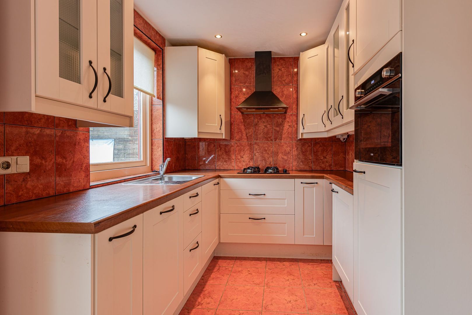 Entree, halletje met meterkast en garderobe, lichte, Z-vormige woonkamer, half-open keuken v.v. 4-pits gaskookstel, oven, koelkast en vaatwasser, tweede hal, trapkast, toilet met fontein.