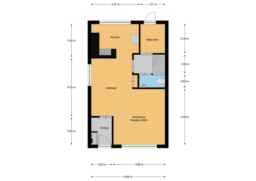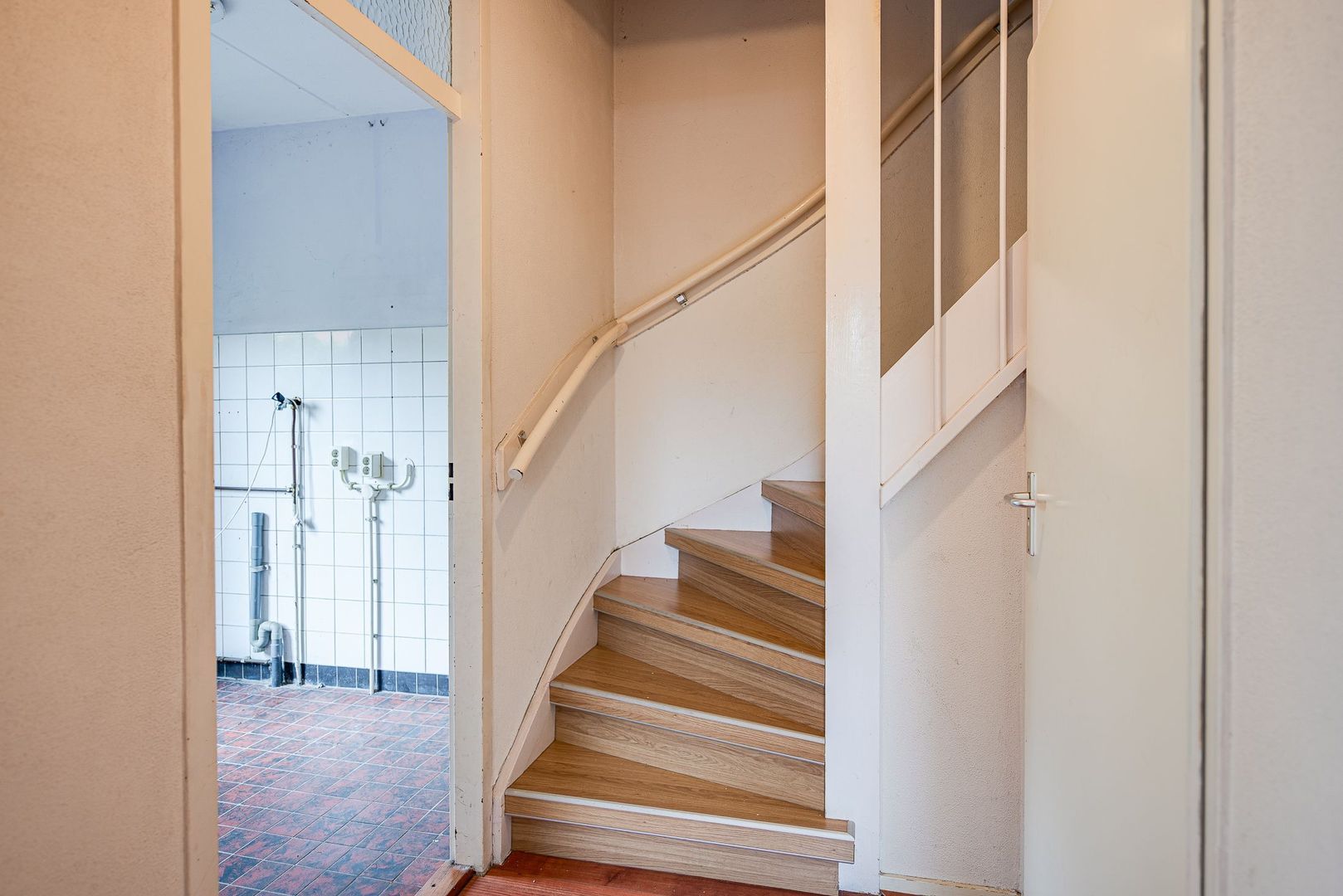 Overdekte entree, hal met meterkast en garderobenis. Z-vormige woon-/eetkamer met laminaatvloer. Open, eenvoudige keuken in L-opstelling met dubbele spoelbak, afzuigkap en wasmachineaansluiting. Tussenhal met trapkast en toilet met fonteintje. Aansluitend een praktische bijkeuken met wasmachineaansluiting en buitendeur naar de achtertuin.