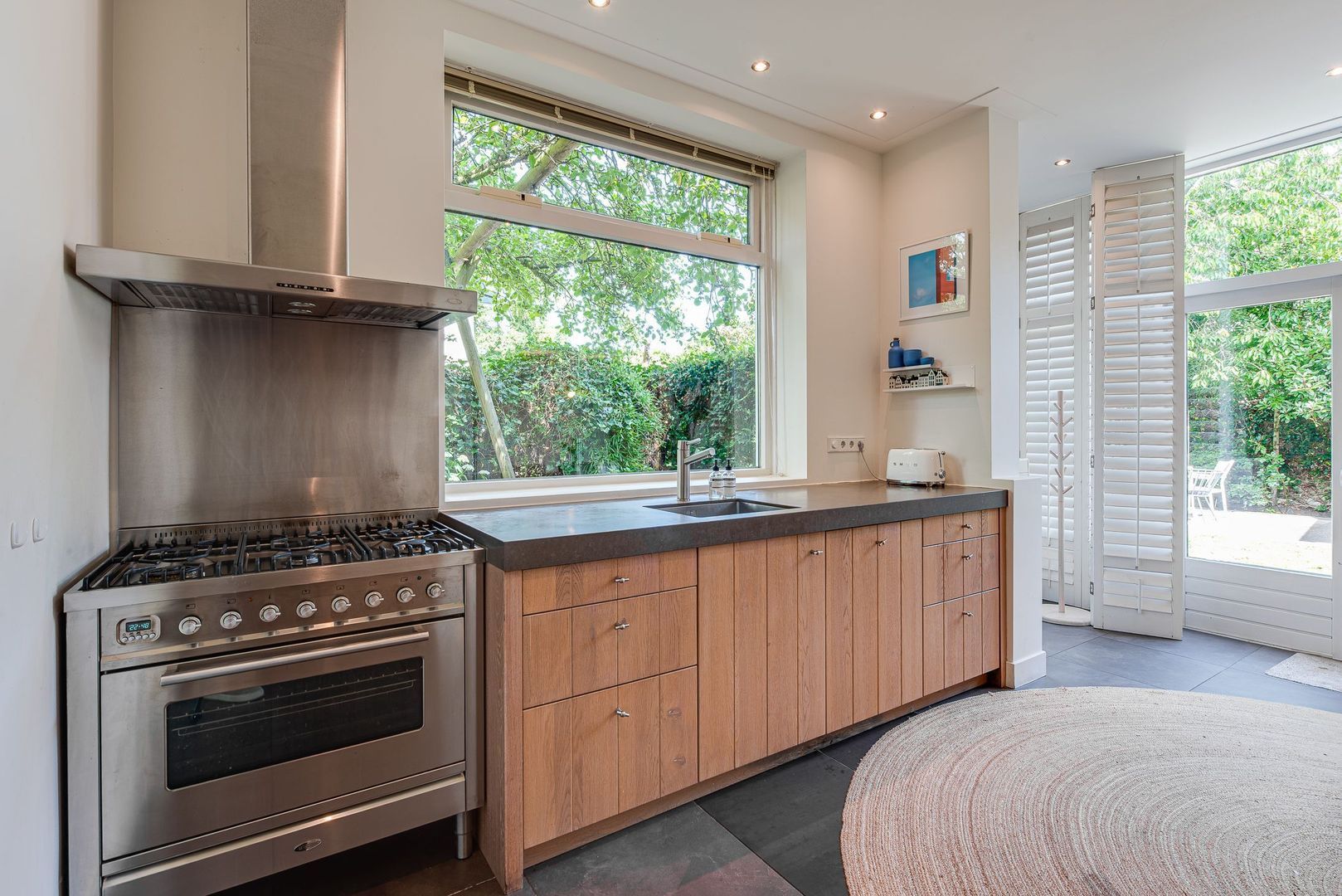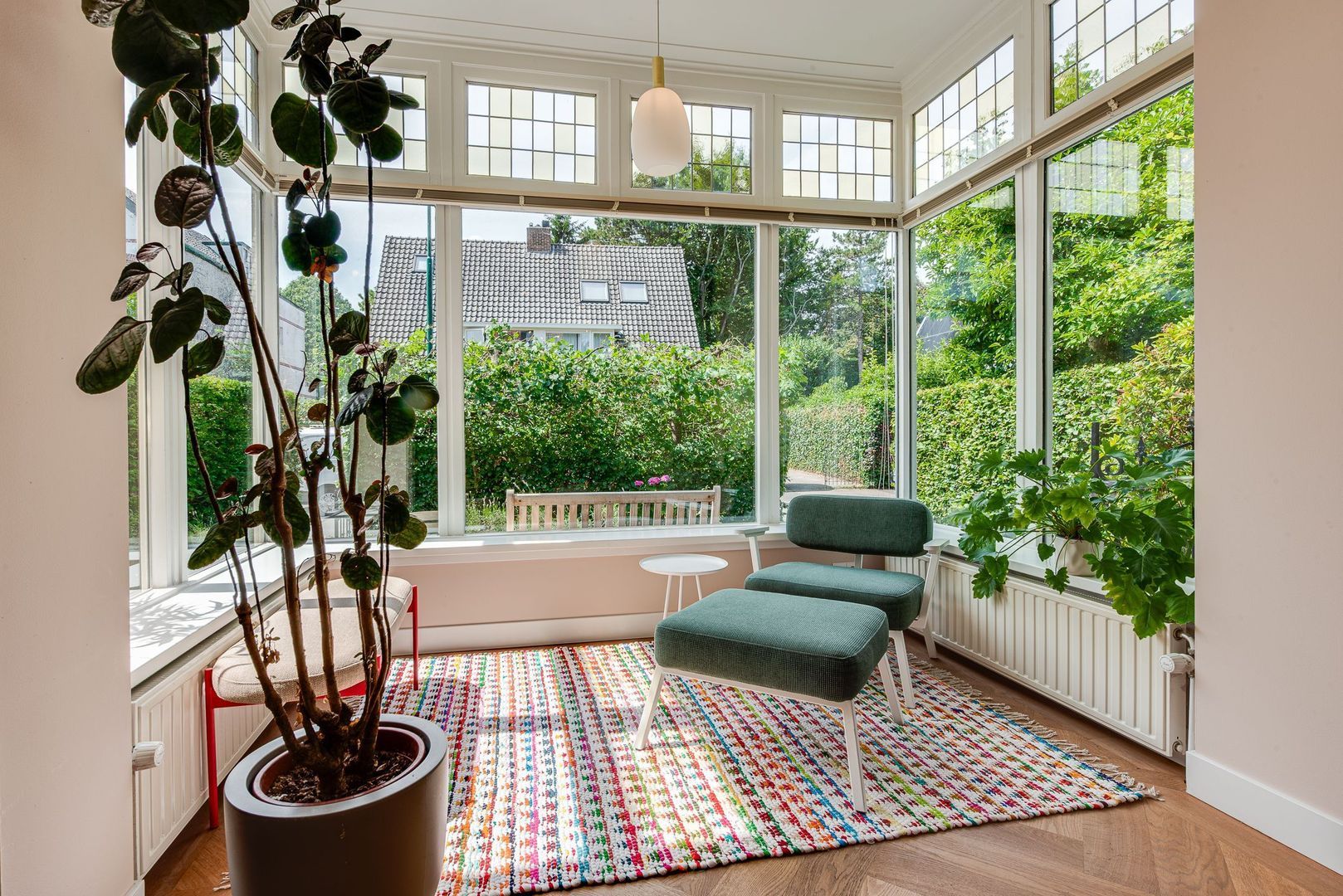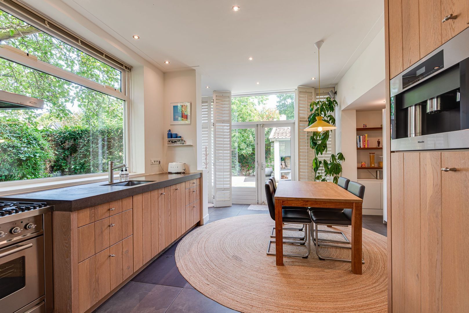Entree, ruime hal met Portugese tegelvloer, m.k., modern toilet v.v. wandcloset en fontein, stahoge kelder v.v. koekoek met aansluiting wasmachine/droger, ruime woonkamer met hoekkast, serre, eiken parket, gashaard (Faber) v.v. warmte-circulatie, en-suitedeuren v.v. glas-in-lood naar eetkamer met suitekasten, erker en eiken parket, moderne, sfeervolle, eiken keuken v.v. vloerverwarming, shutters (Alno), natuurstenen werkblad, 90-cm breed 9-pits-fornuis v.v elektrische oven, RVS-afzuigschouw, inbouw koffiemachine (Miele), vaatwasser, combi magnetron/oven/grill en energiezuinige boiler (2025).
